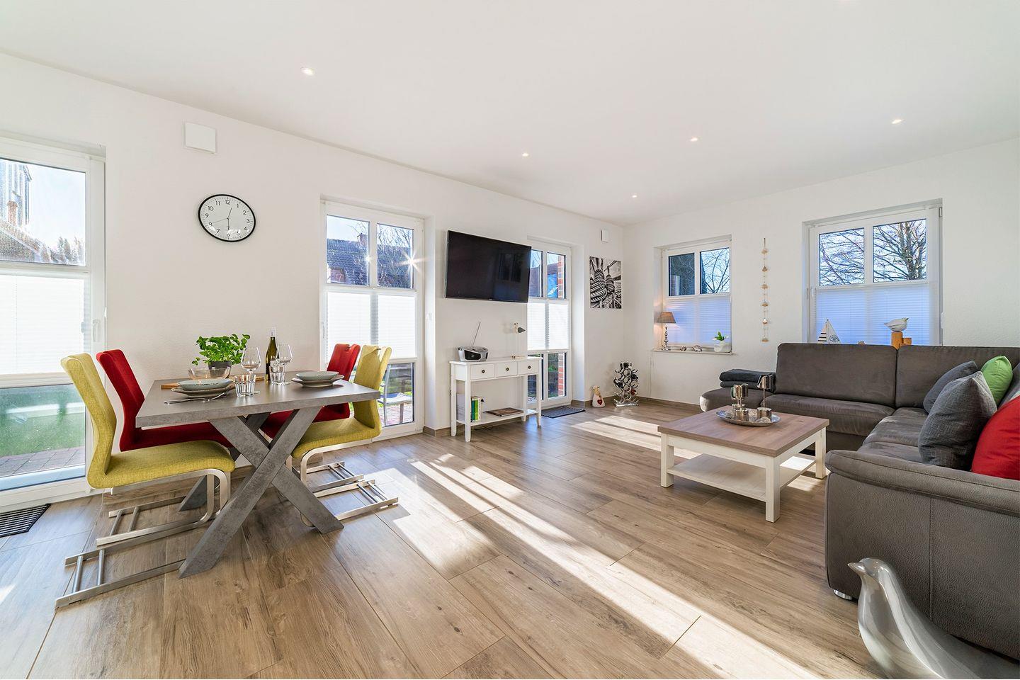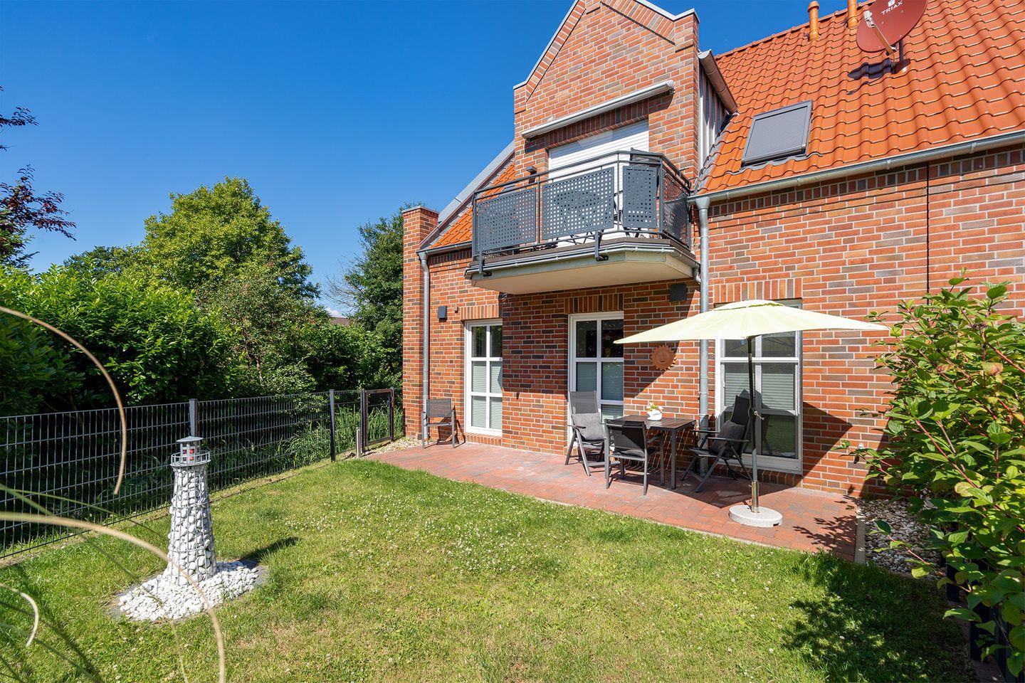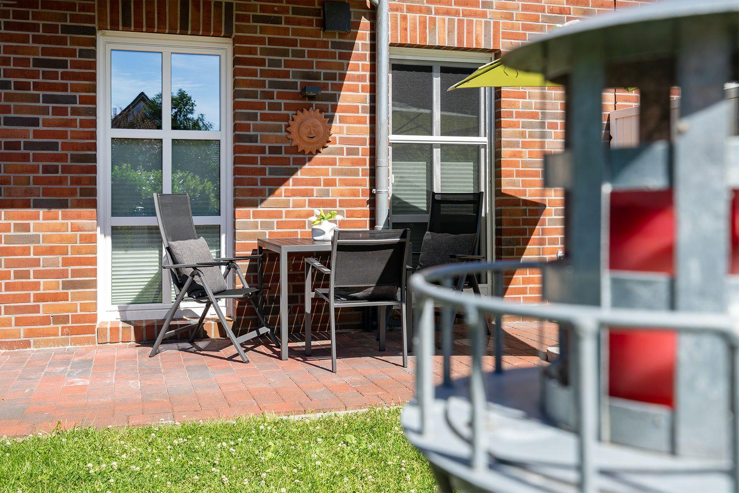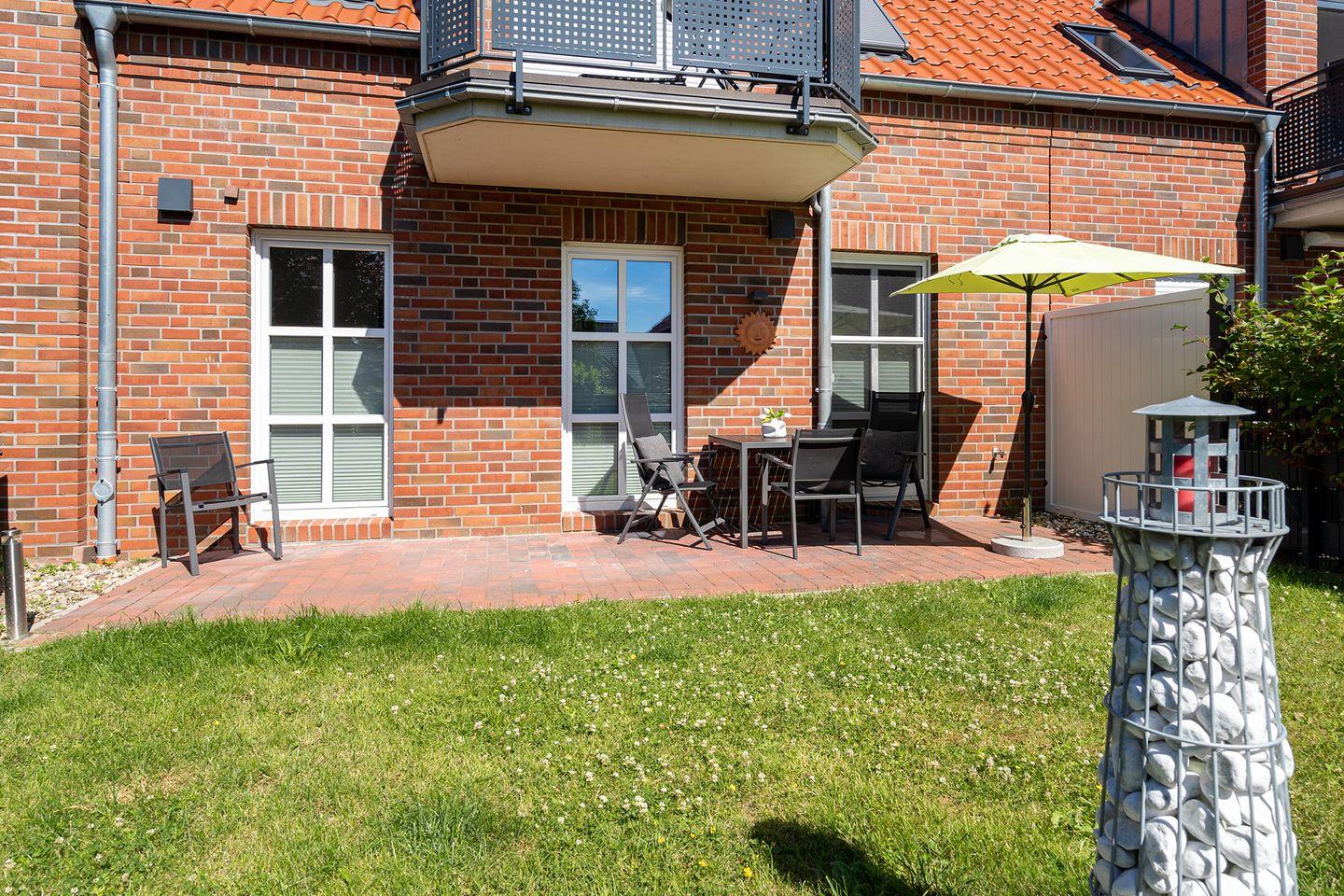 Moderne Ferienwohnung 'Sonnenseite' in Greetsiel mit Terrasse, Garten und E-Bike-Ladestation für entspannte Urlaubstage.