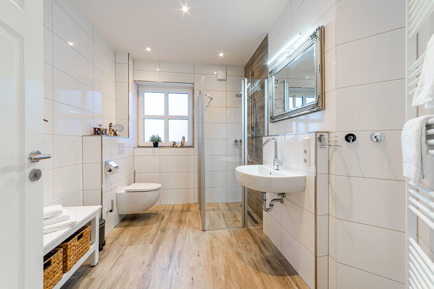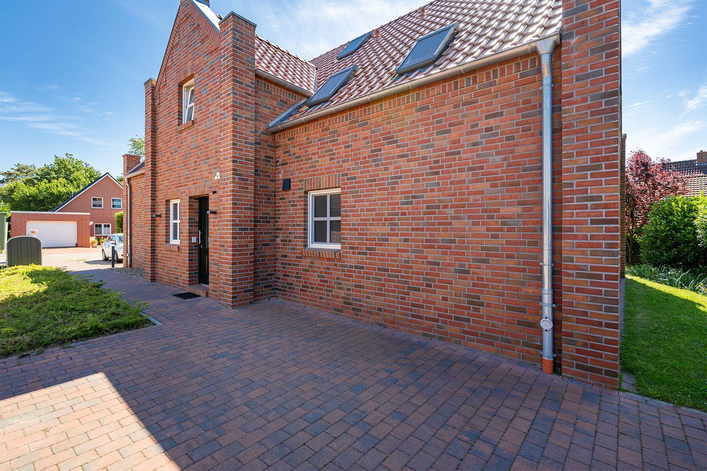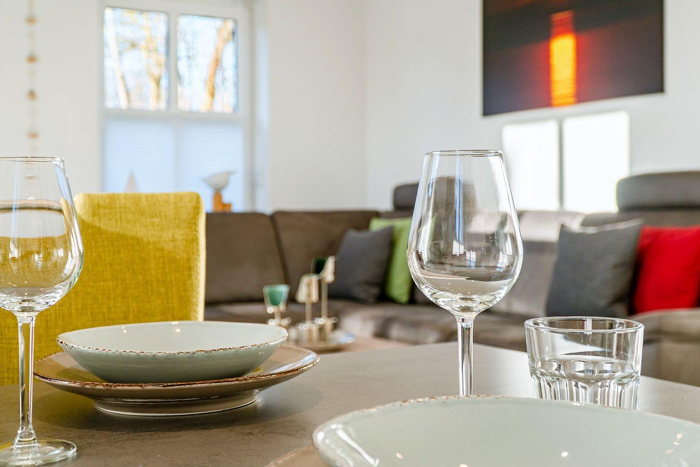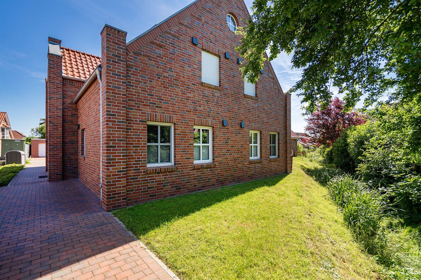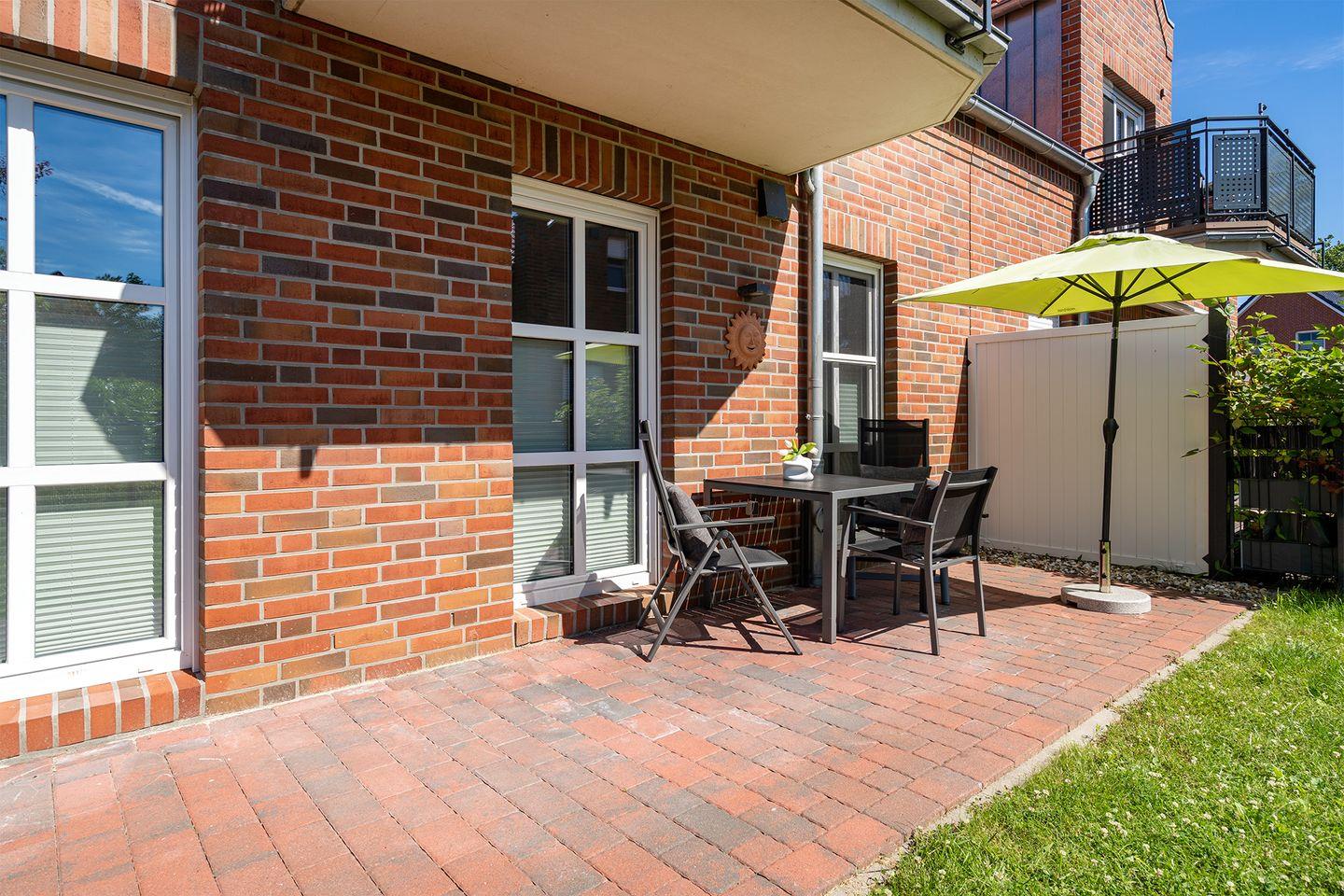 Moderne Ferienwohnung 'Sonnenseite' in Greetsiel mit Terrasse, Garten und E-Bike-Ladestation für entspannte Urlaubstage.