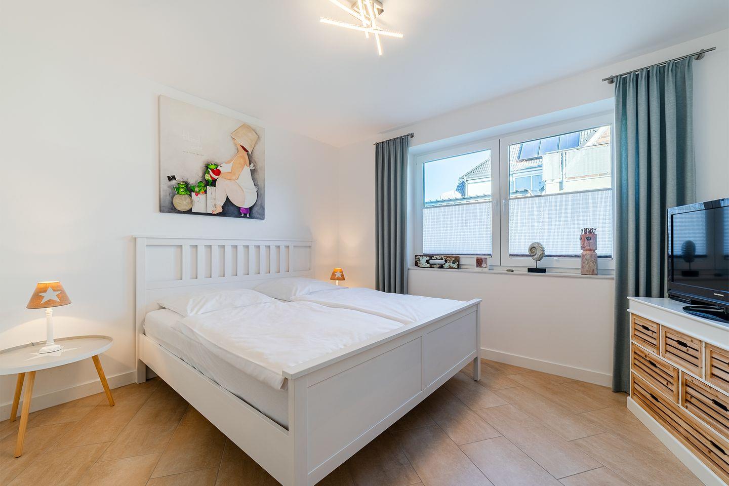 Schlafzimmer 1: Ausgestattet mit einem Doppelbett und TV.