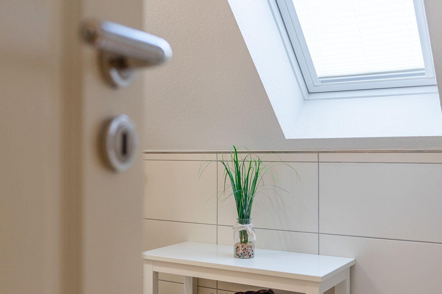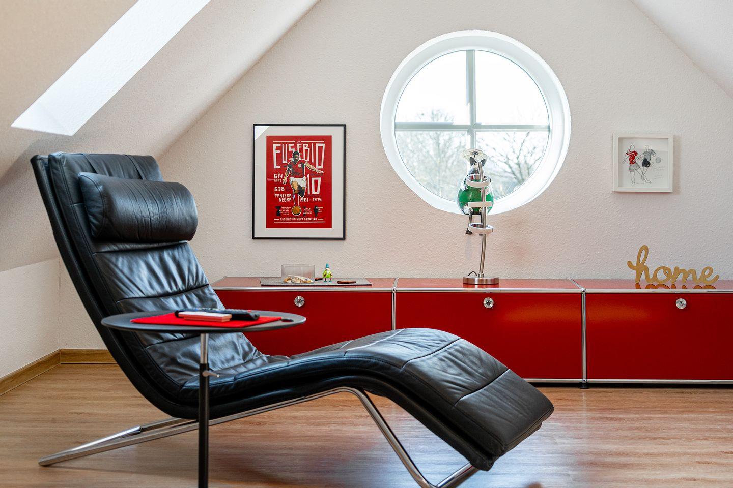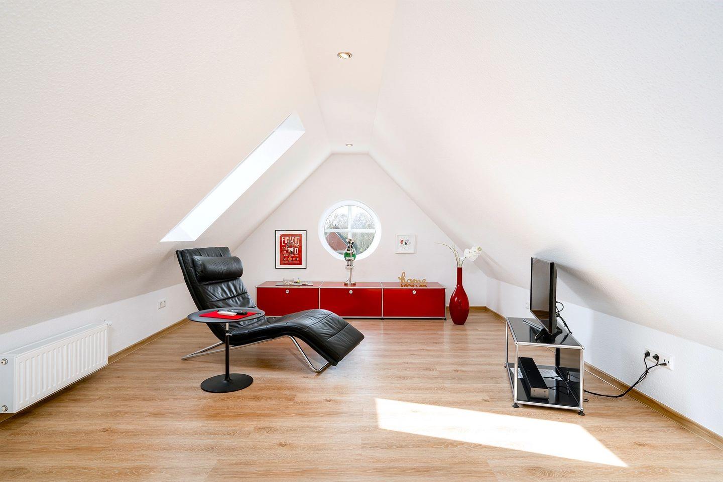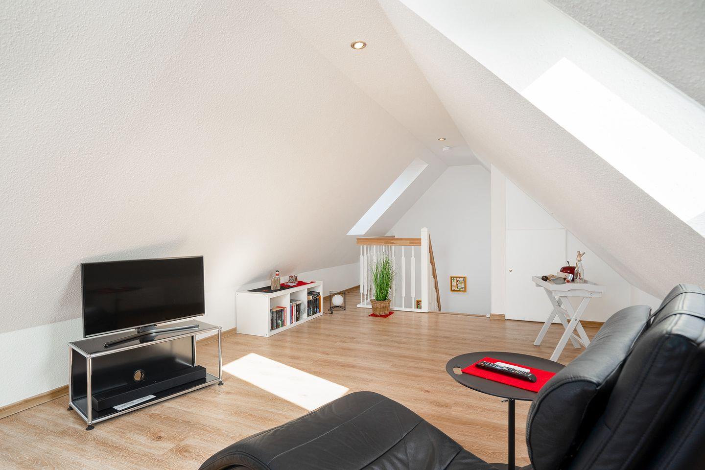 Über eine Treppe gelangen Sie in das Studio im Dachgeschoss. In diesem hellen lichtdurchfluteten Raum steht ein lederbezogener Relax-Chair und ein UHD-LED-TV zum "Chillen" für Sie bereit.
