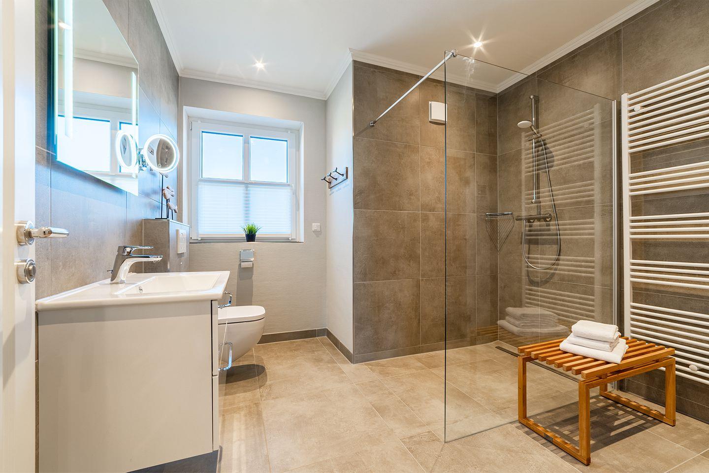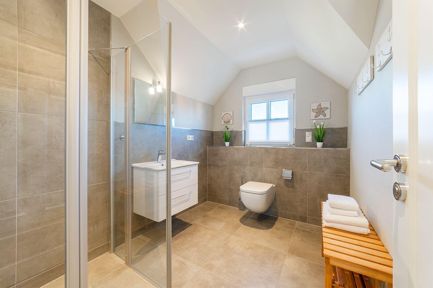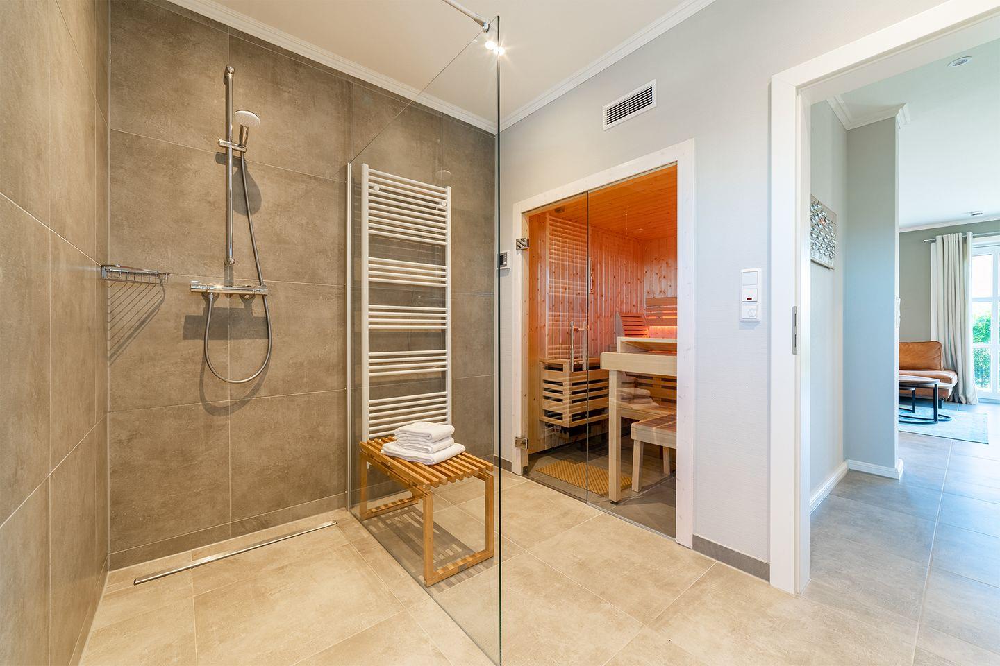 Badezimmer mit Dusche im EG – hier ist außerdem schwitzen angesagt, da dieses Bad über eine Sauna verfügt!