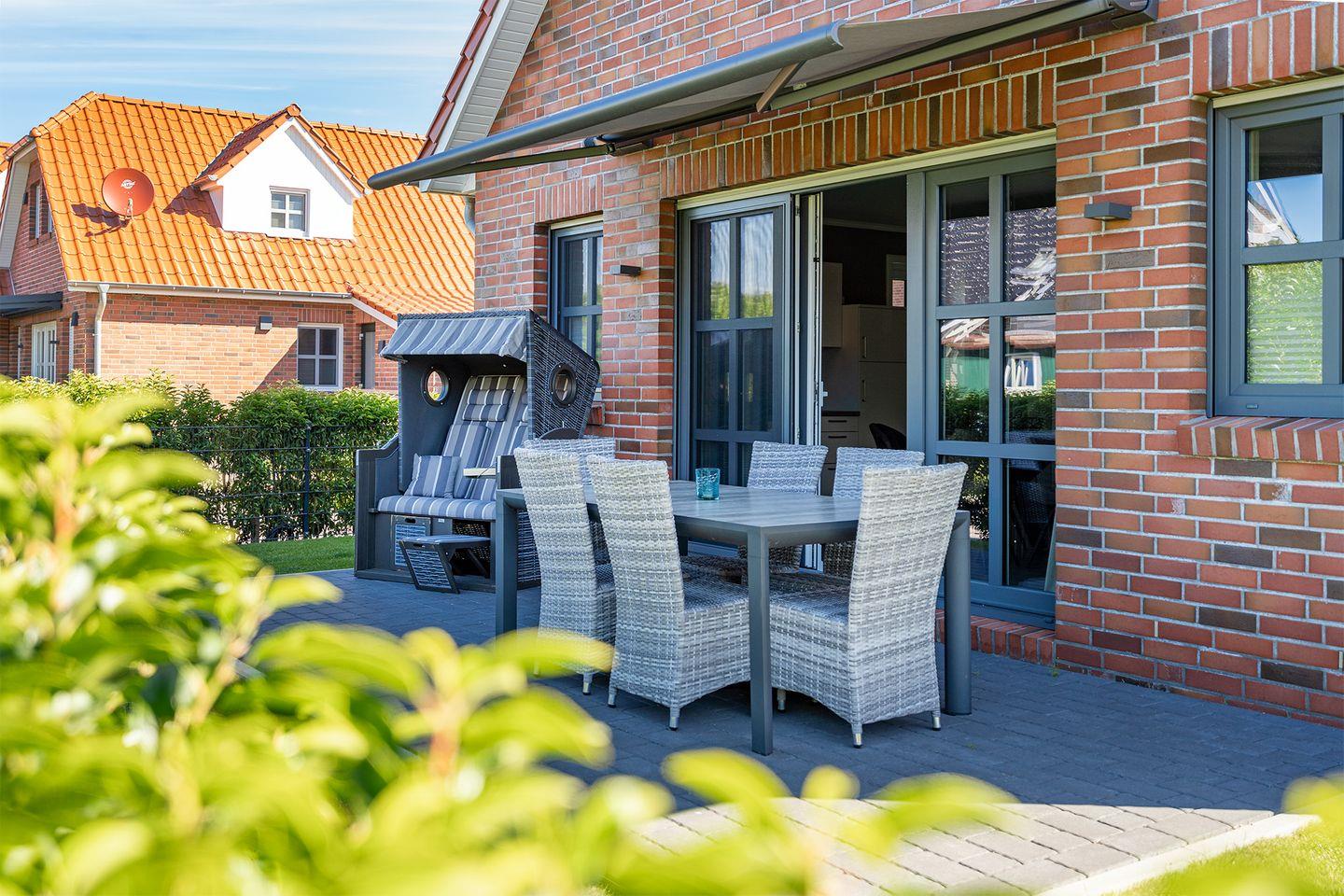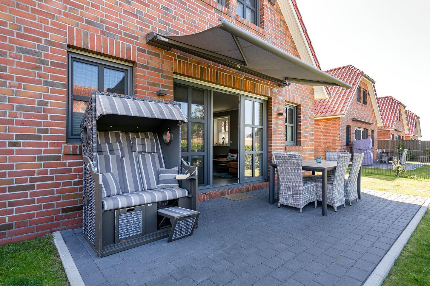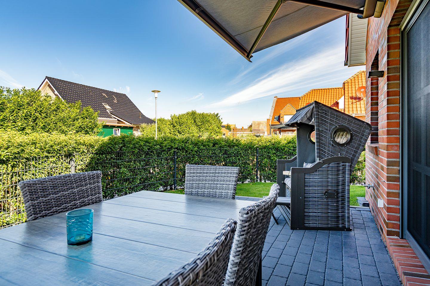Ein eingezäunter Gartenbereich mit einer Terrasse (südwestlich), die über eine elektrische Markise und einen Strandkorb verfügt