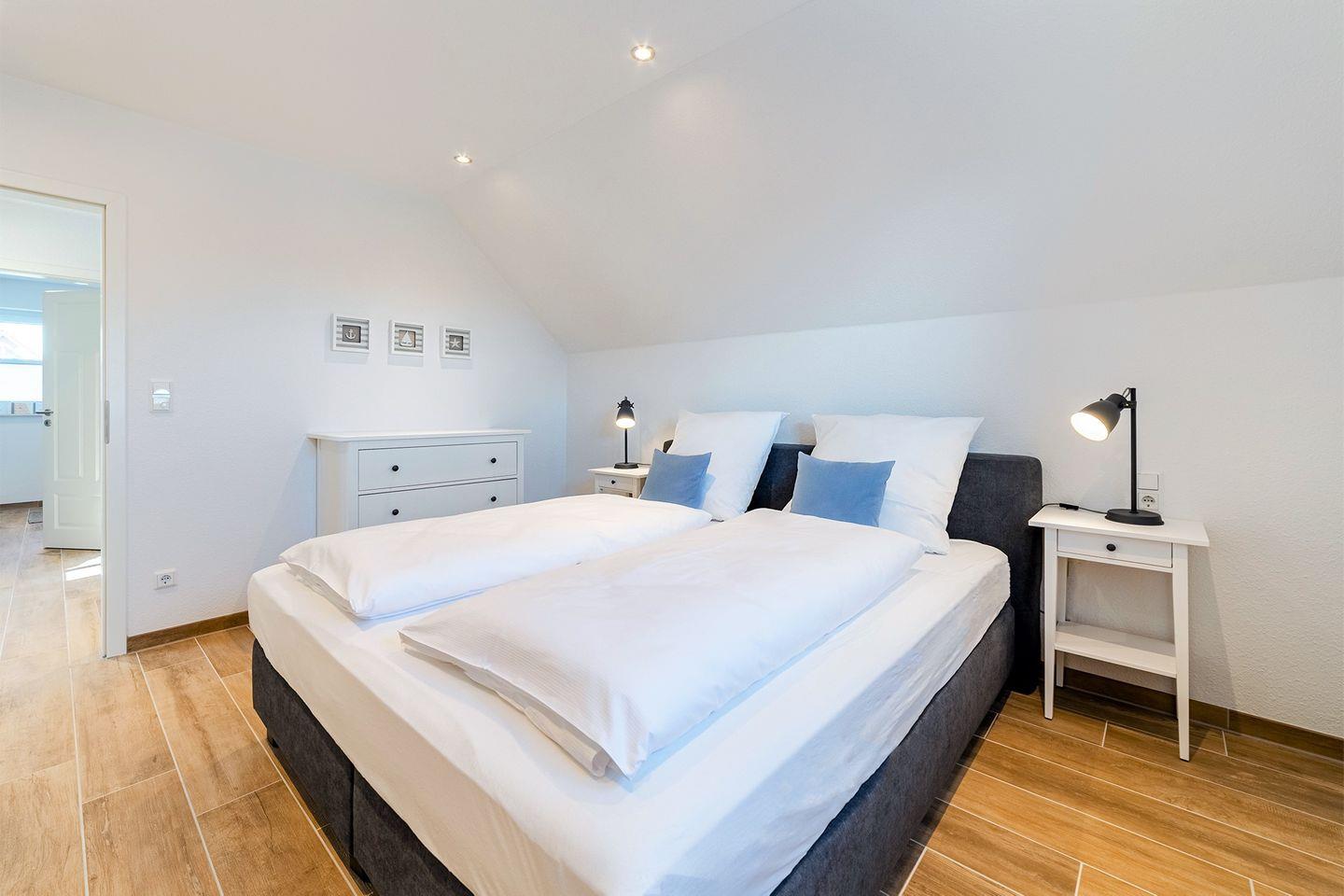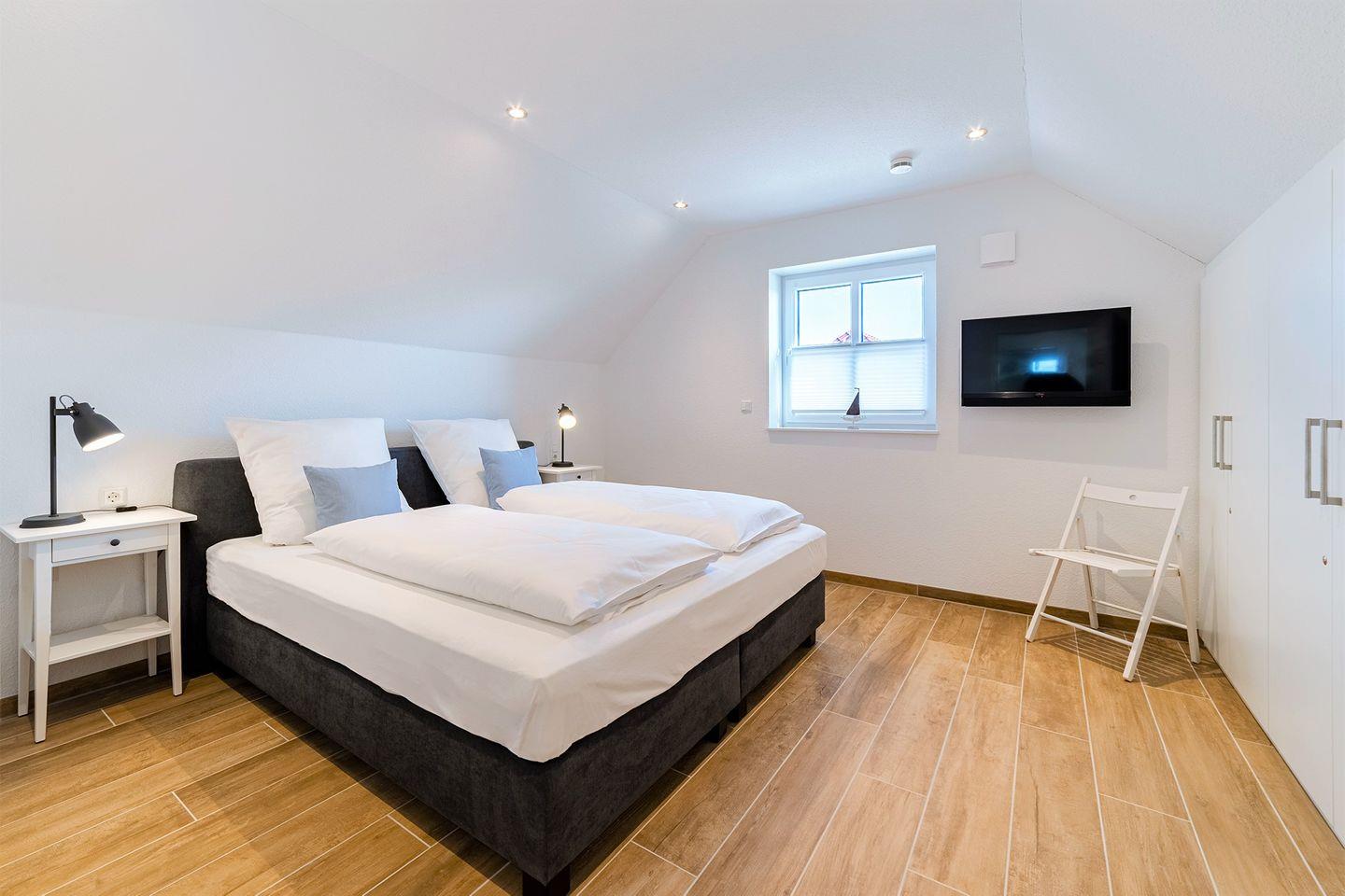 Schlafzimmer mit Boxspringbett (180x200 cm) und TV im EG