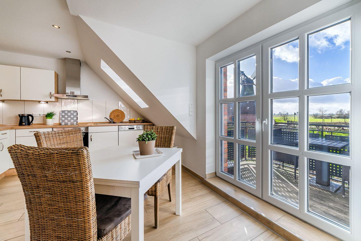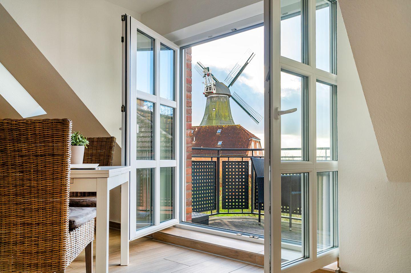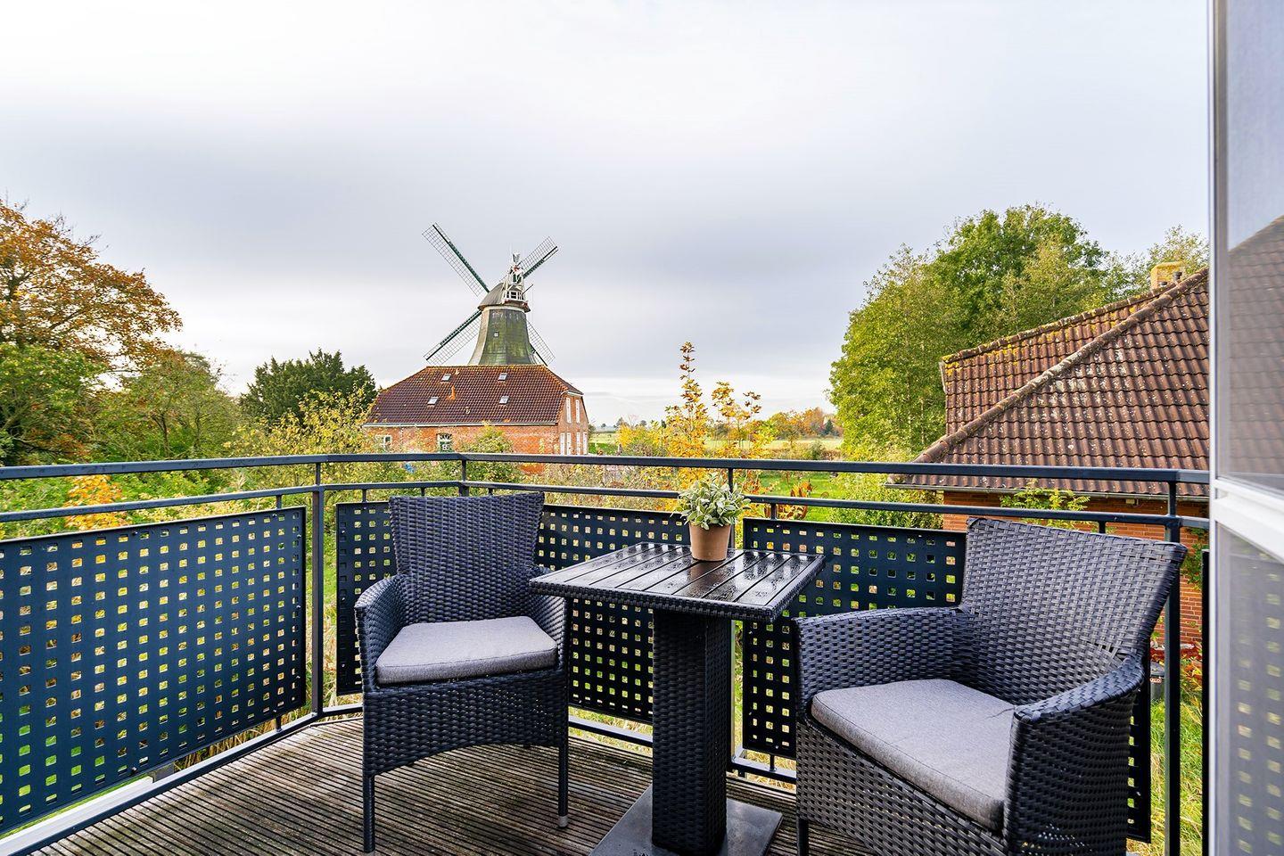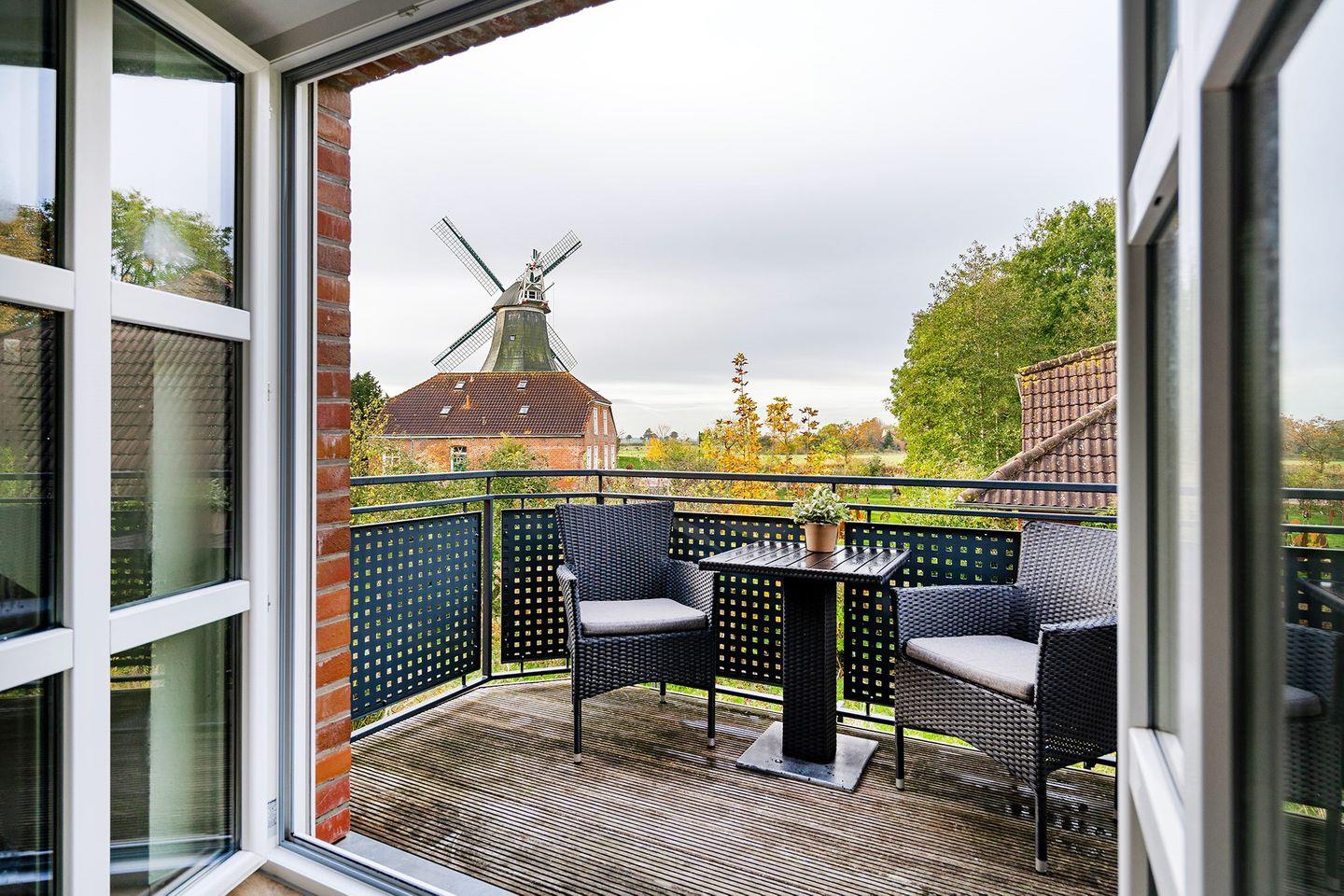 Moderne Ferienwohnung mit Balkon und Blick auf die Zwillingsmühlen in Greetsiel.