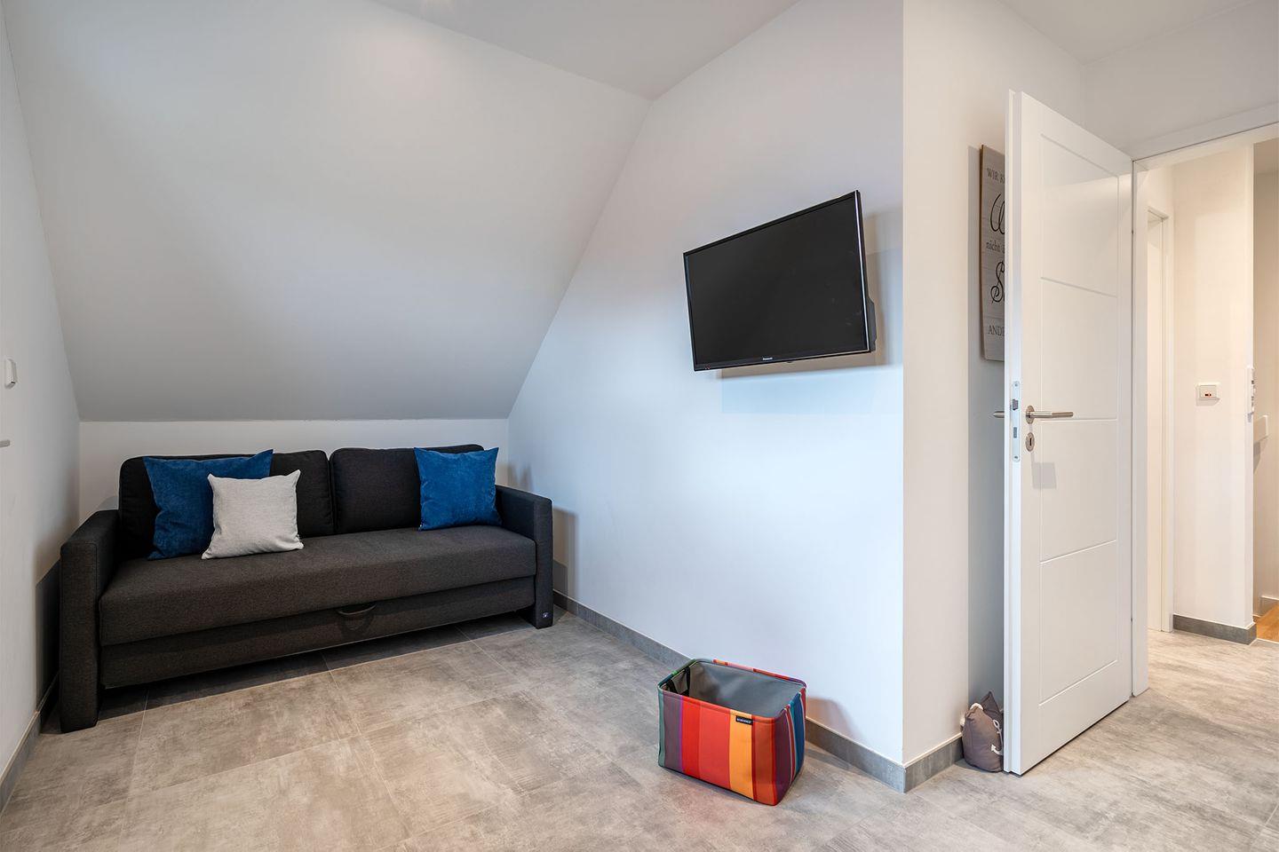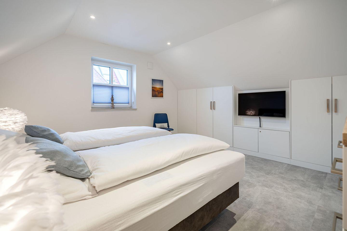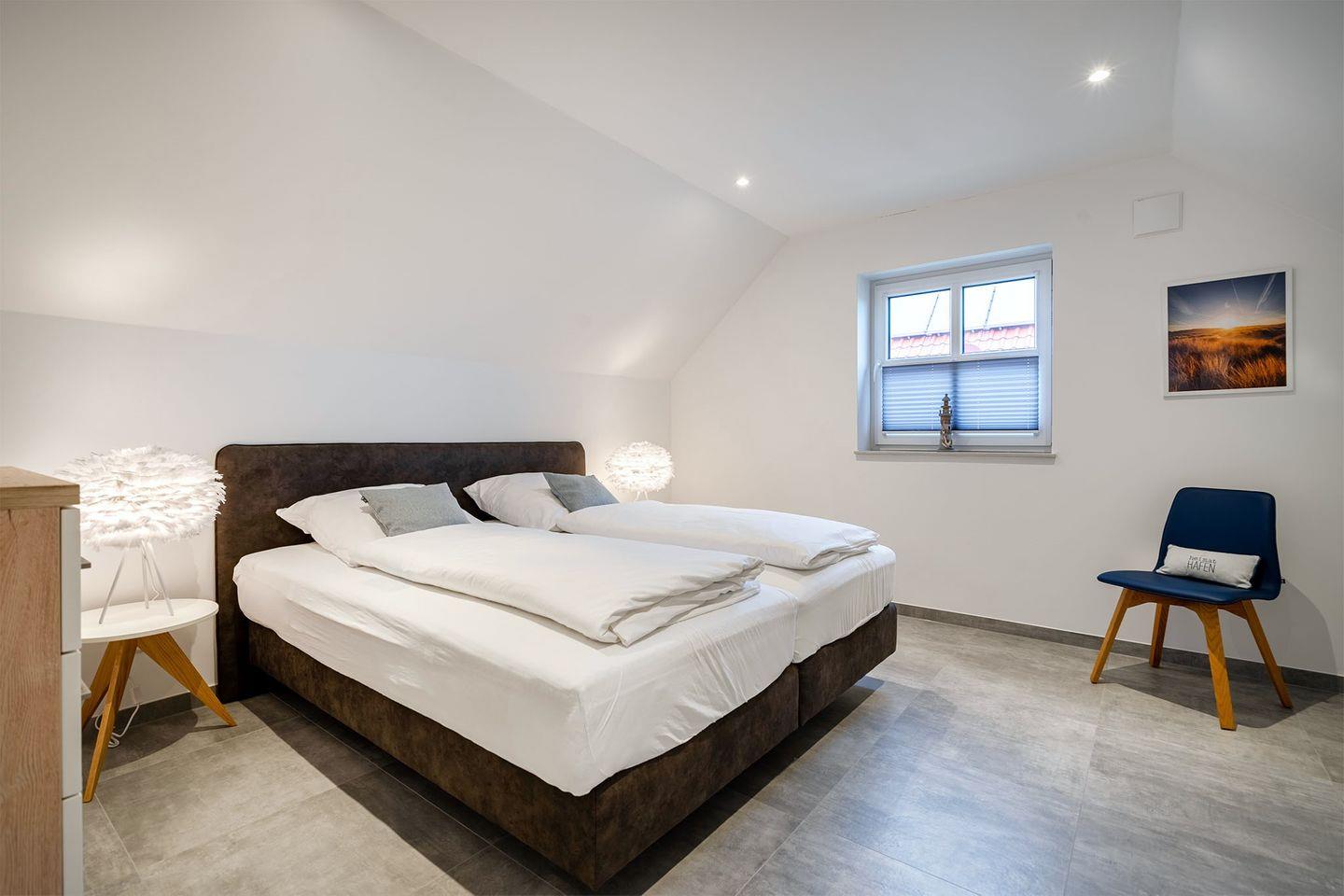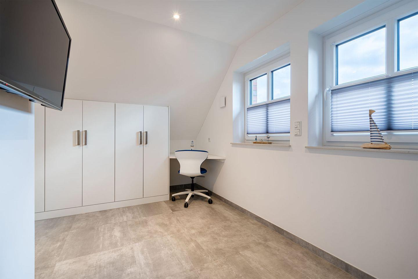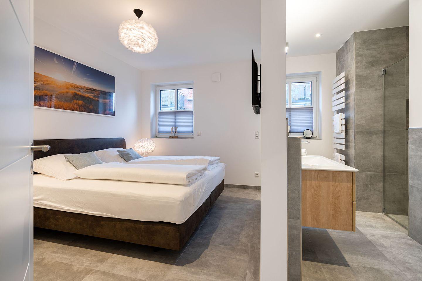 Es gibt zwei Schlafzimmer, beide ausgestattet mit Boxspringbetten, die für einen erholsamen Schlaf sorgen. Ein Schlafraum im Erdgeschoss bietet zusätzlich ein eigenes Badezimmer mit bodengleicher Dusche und abgetrenntem WC – ideal für eine private Wellness-Oase. Im Obergeschoss finden Sie ein weiteres Schlafzimmer sowie ein weiteres, komfortables Bad. Für zusätzliche Gäste oder Kinder gibt es ein Zimmer mit Schreibtisch und einem Schlafsofa.