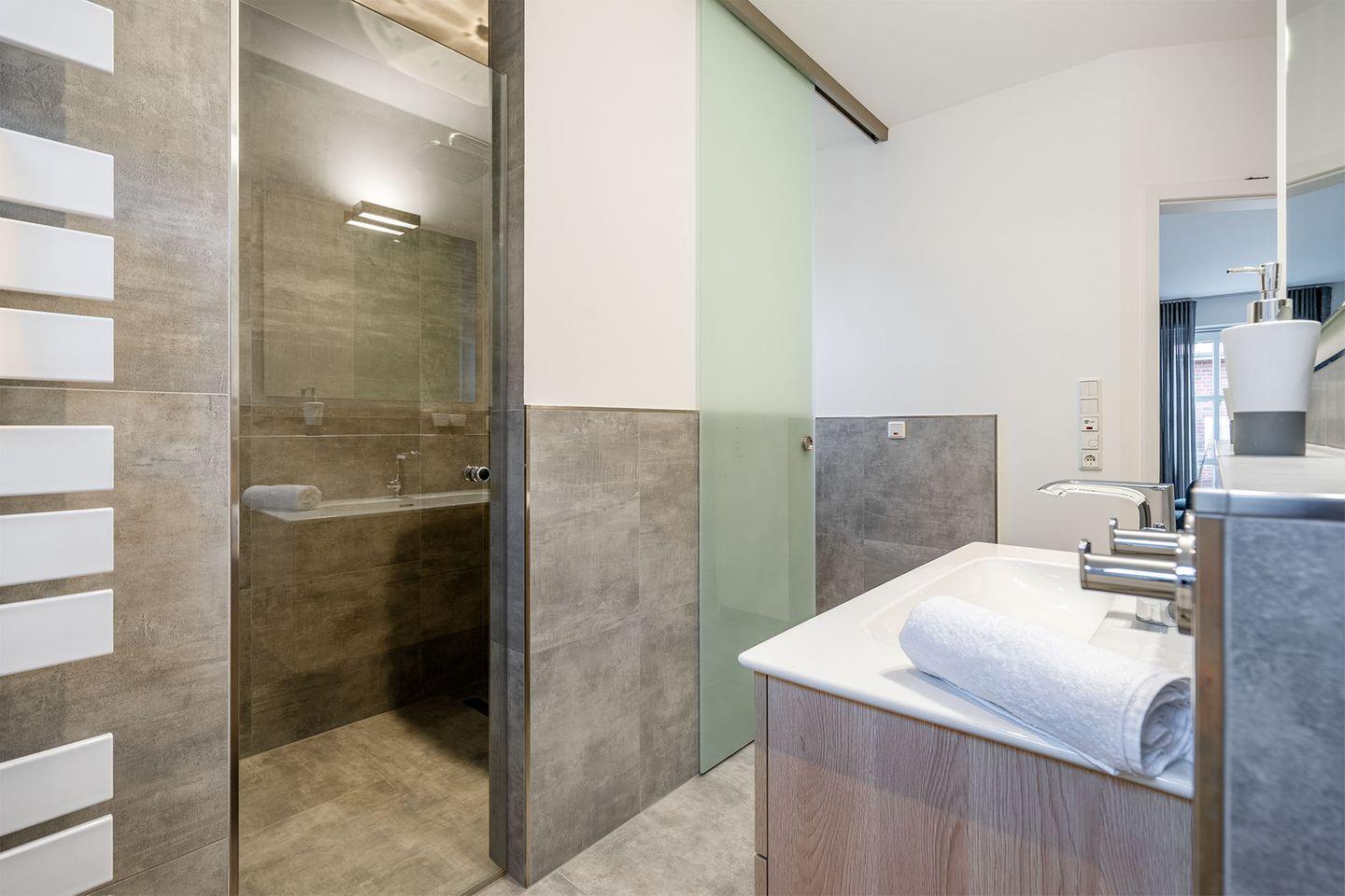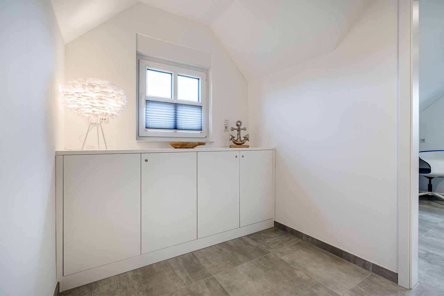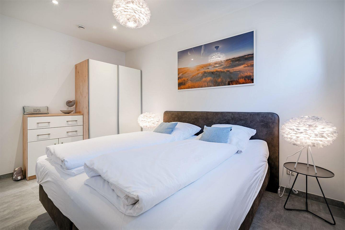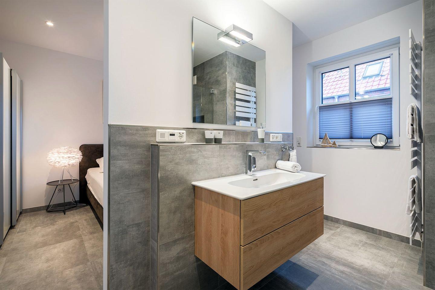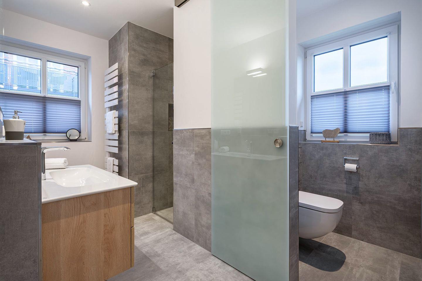 Es gibt zwei Schlafzimmer, beide ausgestattet mit Boxspringbetten, die für einen erholsamen Schlaf sorgen. Ein Schlafraum im Erdgeschoss bietet zusätzlich ein eigenes Badezimmer mit bodengleicher Dusche und abgetrenntem WC – ideal für eine private Wellness-Oase. Im Obergeschoss finden Sie ein weiteres Schlafzimmer sowie ein weiteres, komfortables Bad. Für zusätzliche Gäste oder Kinder gibt es ein Zimmer mit Schreibtisch und einem Schlafsofa.