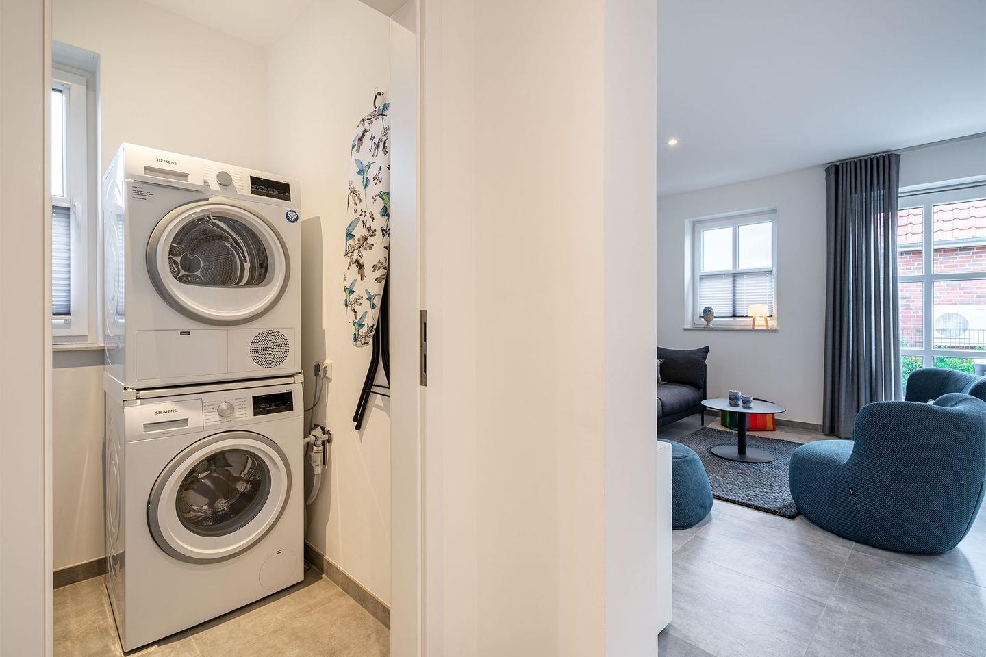 Eine Waschmaschine und ein separater Wäschetrockner stehen Ihnen zur Verfügung. Das Haus bietet zudem Fußbodenheizung, Fliegengitter, Handtuch-Heizung, elektrische Rollläden und zwei kostenfreie PKW-Stellplätze direkt am Haus. Fahrräder können in einem geschützten Raum abgestellt werden, und eine Lademöglichkeit für E-Bikes ist ebenfalls vorhanden.