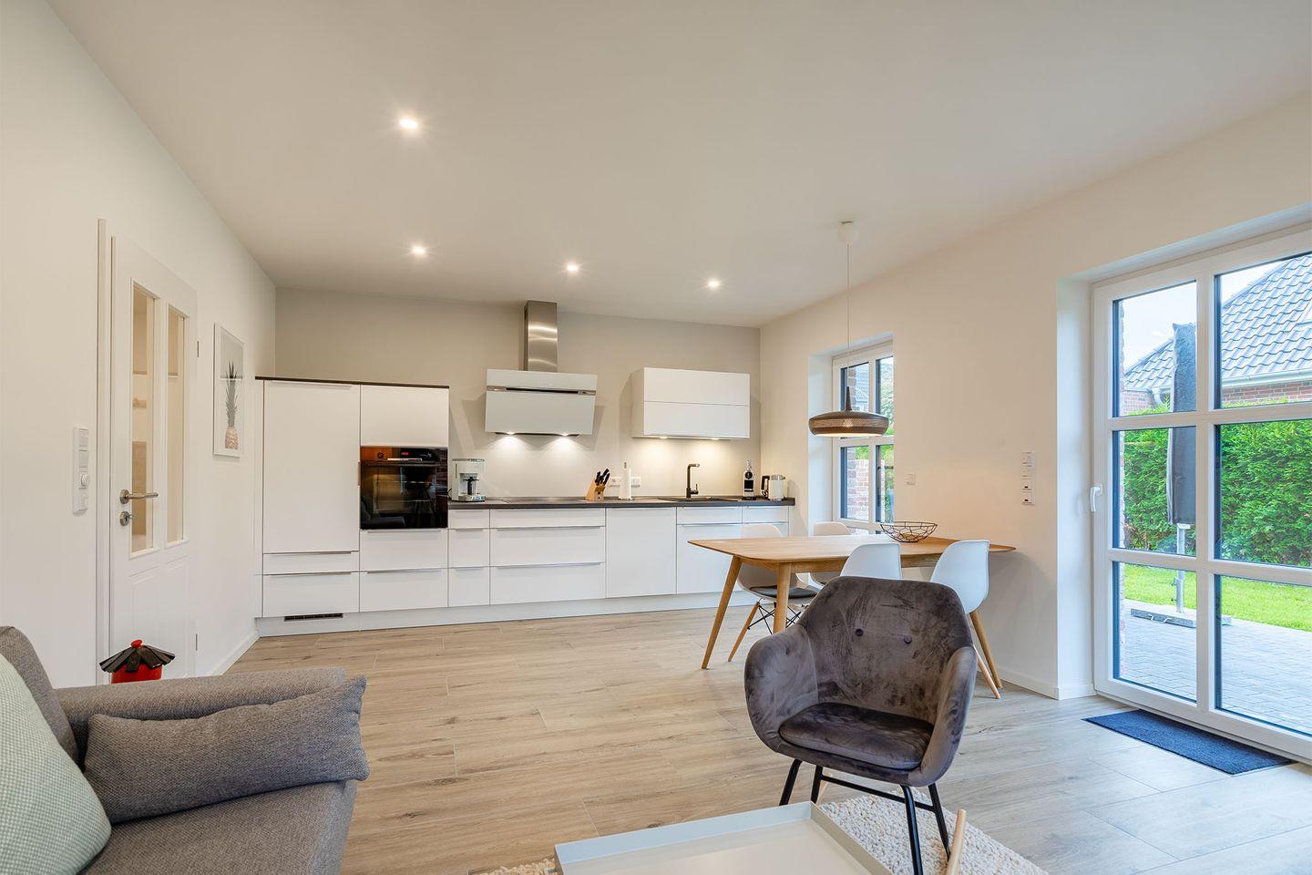 Einen lichtdurchfluteten Wohnraum mit kombiniertem Küchen- und Essbereich