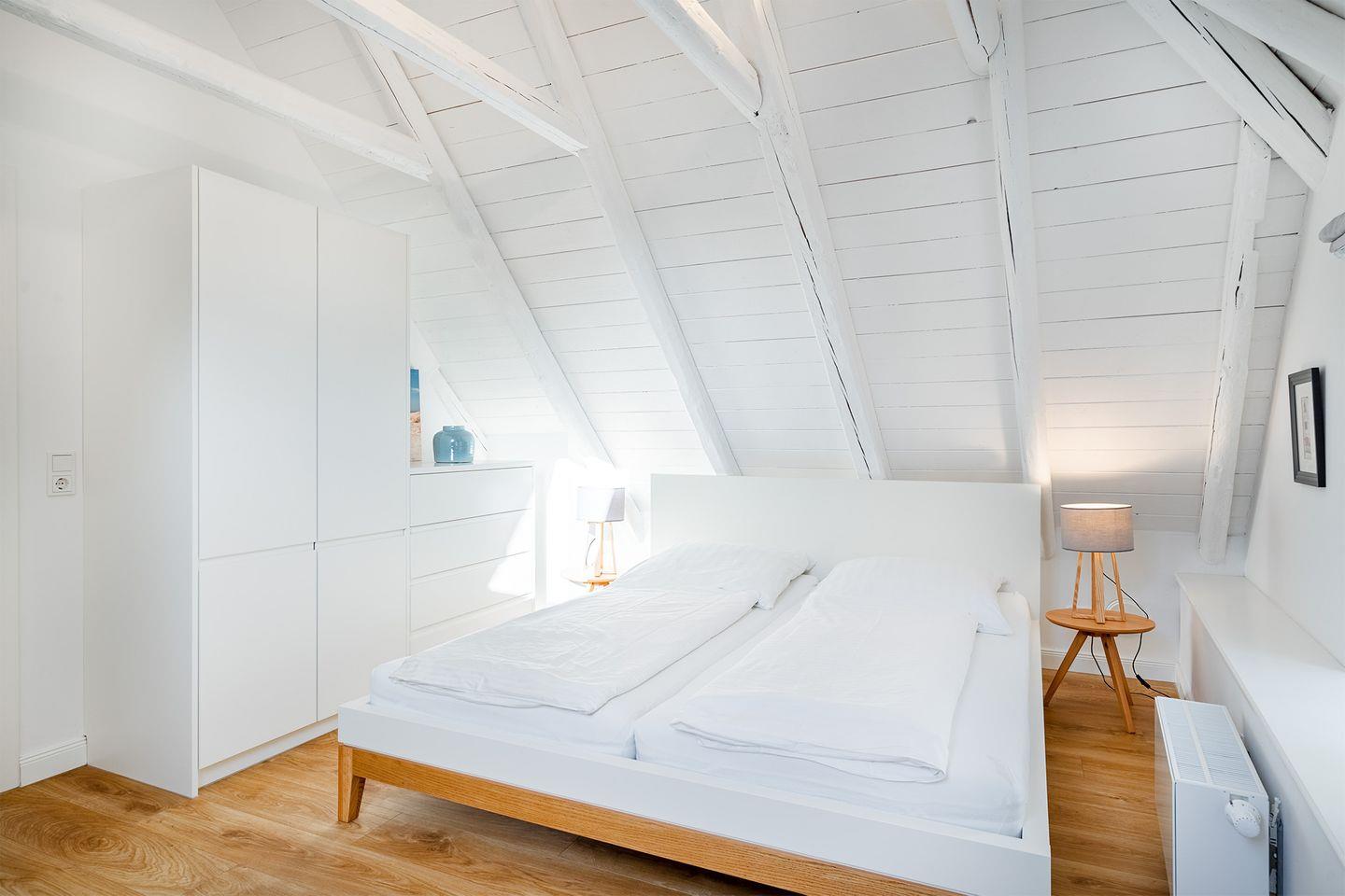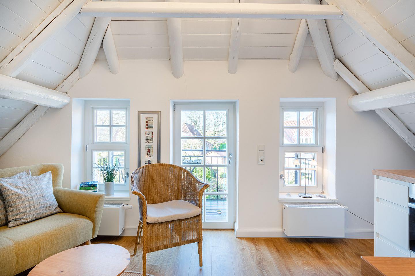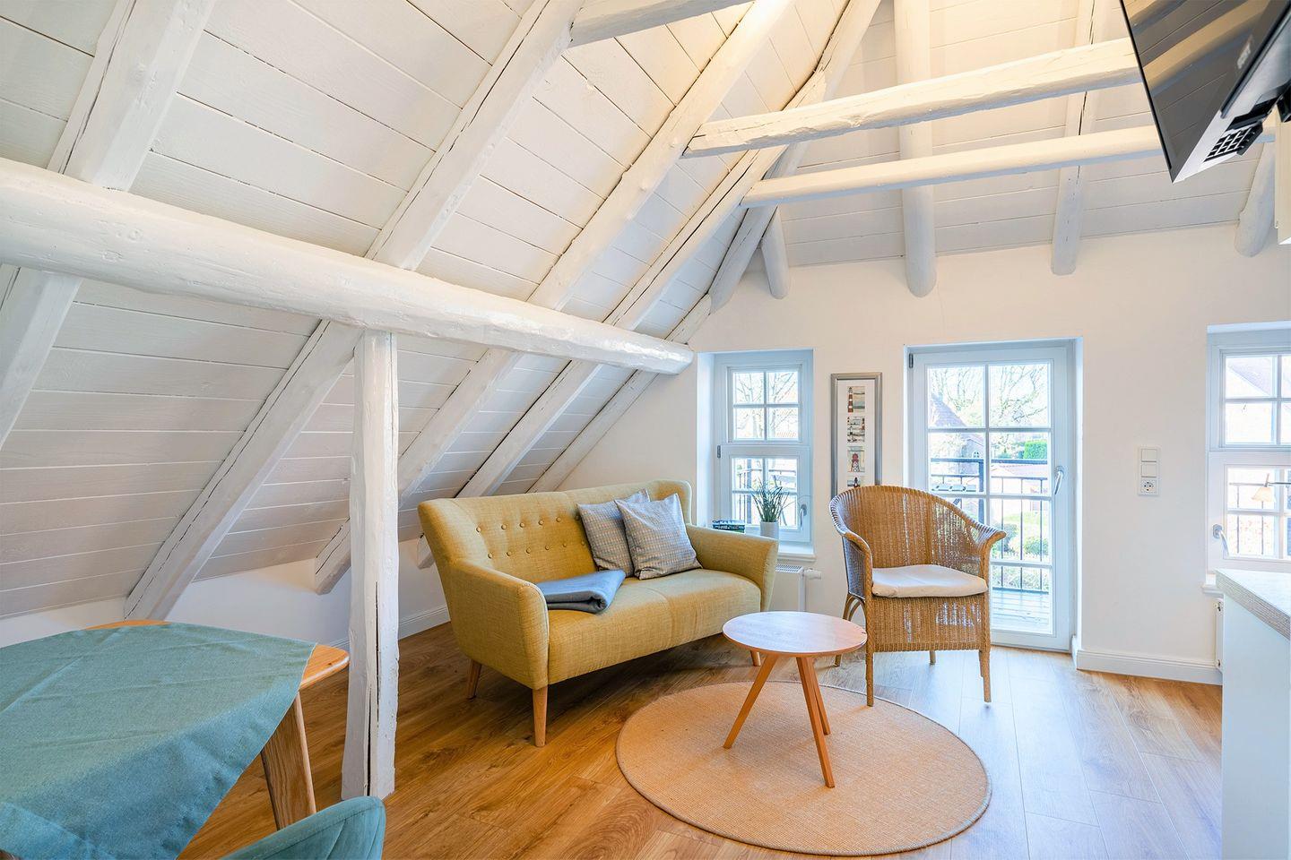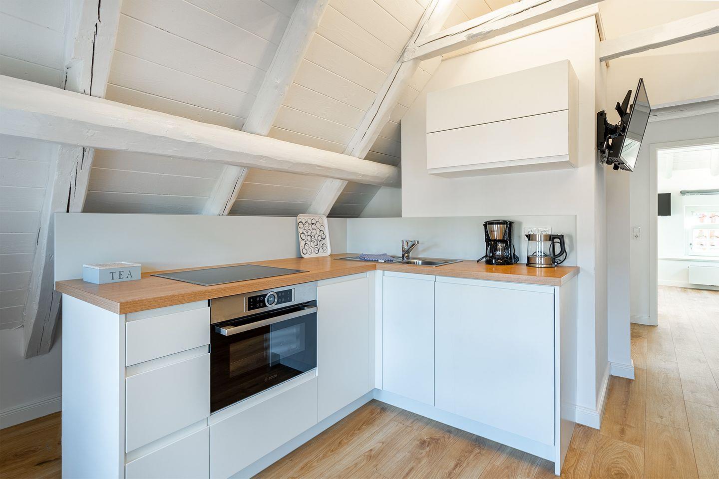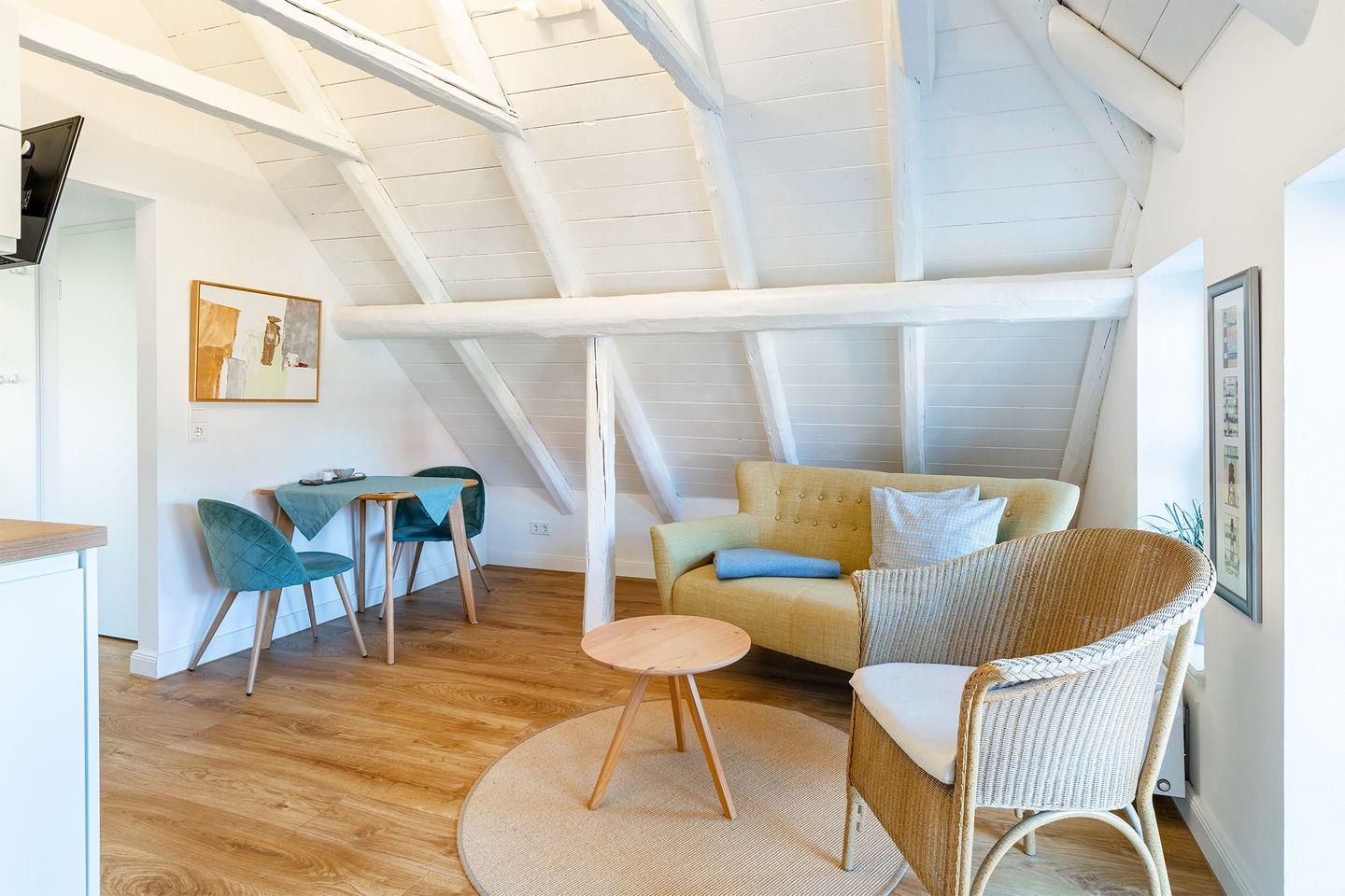 Die Wohnung im Obergeschoss bietet einen offenen Wohn- und Essbereich. Das gemütliche Bett befindet sich in der Dachschräge mit Blick auf die offenen Holzbalken. Die moderne weiße Küche ist komplett ausgestattet, sodass Sie für einen Kochabend bestens gerüstet sind. Am kleinen Esstisch können Sie zum Frühstück oder Abendessen sitzen und die ruhige Atmosphäre genießen.
