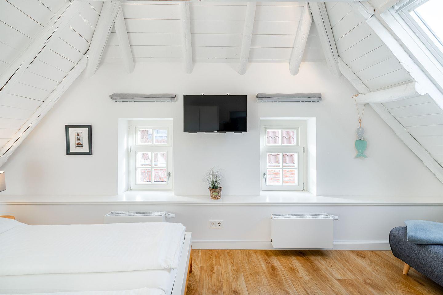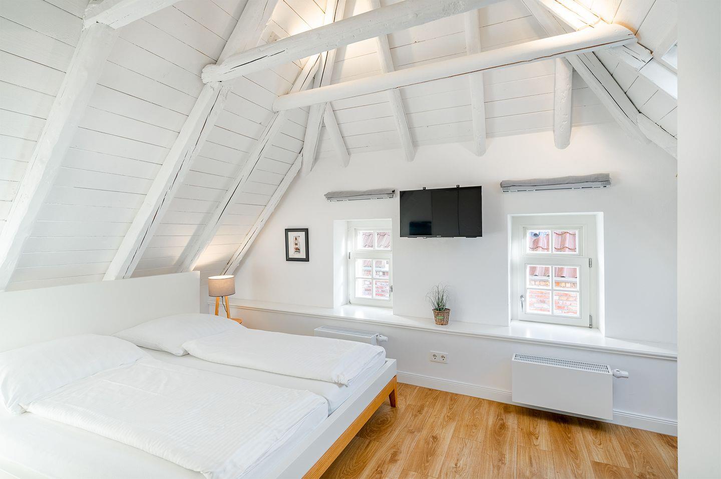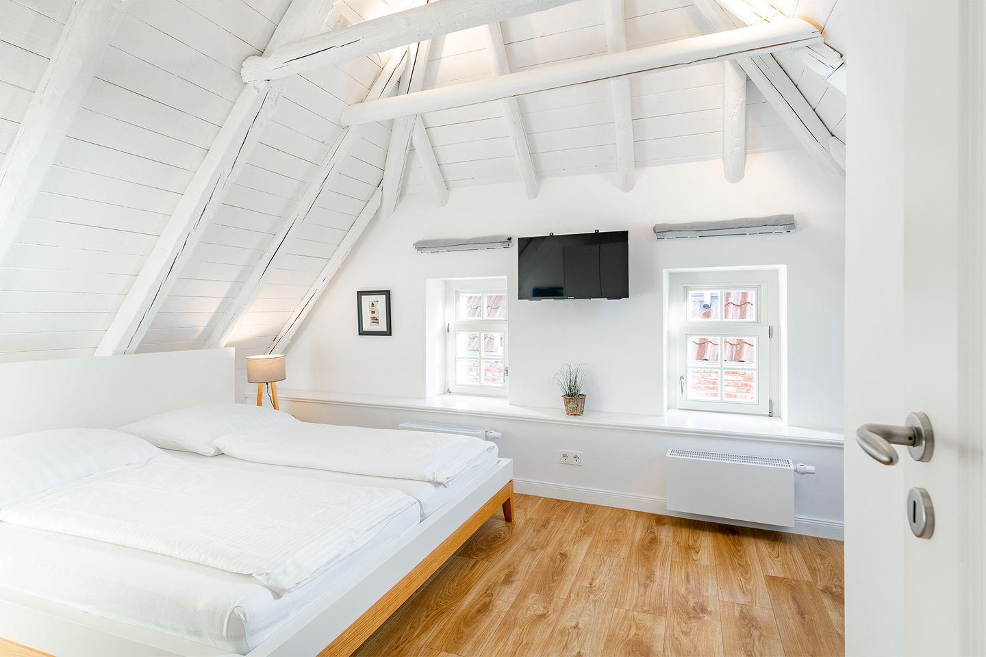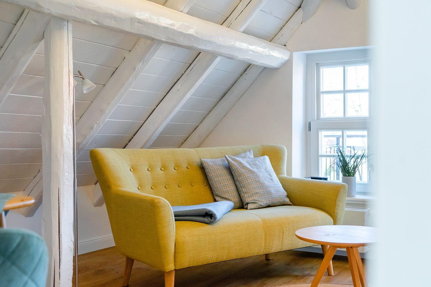 Die Wohnung im Obergeschoss bietet einen offenen Wohn- und Essbereich. Das gemütliche Bett befindet sich in der Dachschräge mit Blick auf die offenen Holzbalken. Die moderne weiße Küche ist komplett ausgestattet, sodass Sie für einen Kochabend bestens gerüstet sind. Am kleinen Esstisch können Sie zum Frühstück oder Abendessen sitzen und die ruhige Atmosphäre genießen.