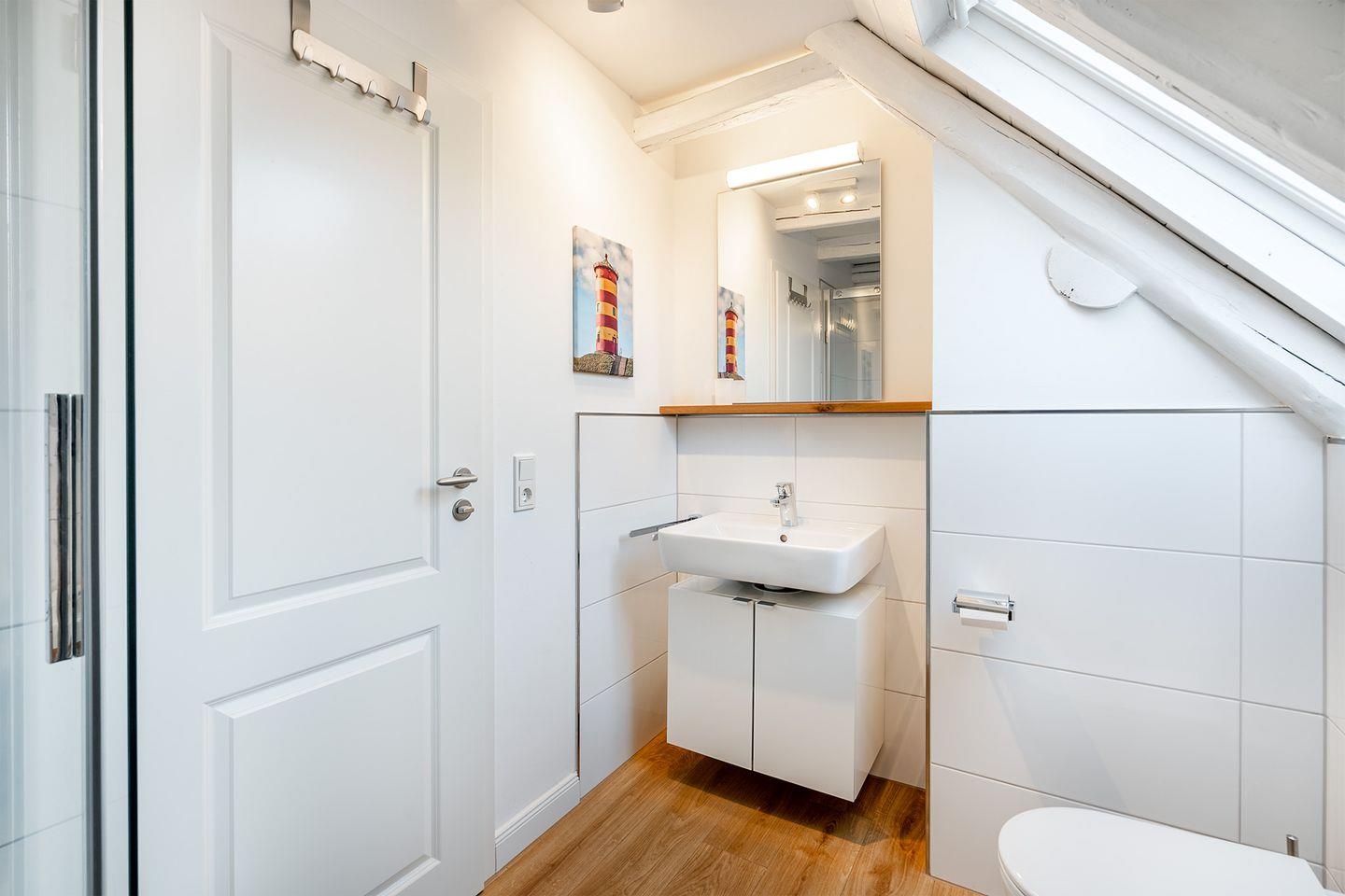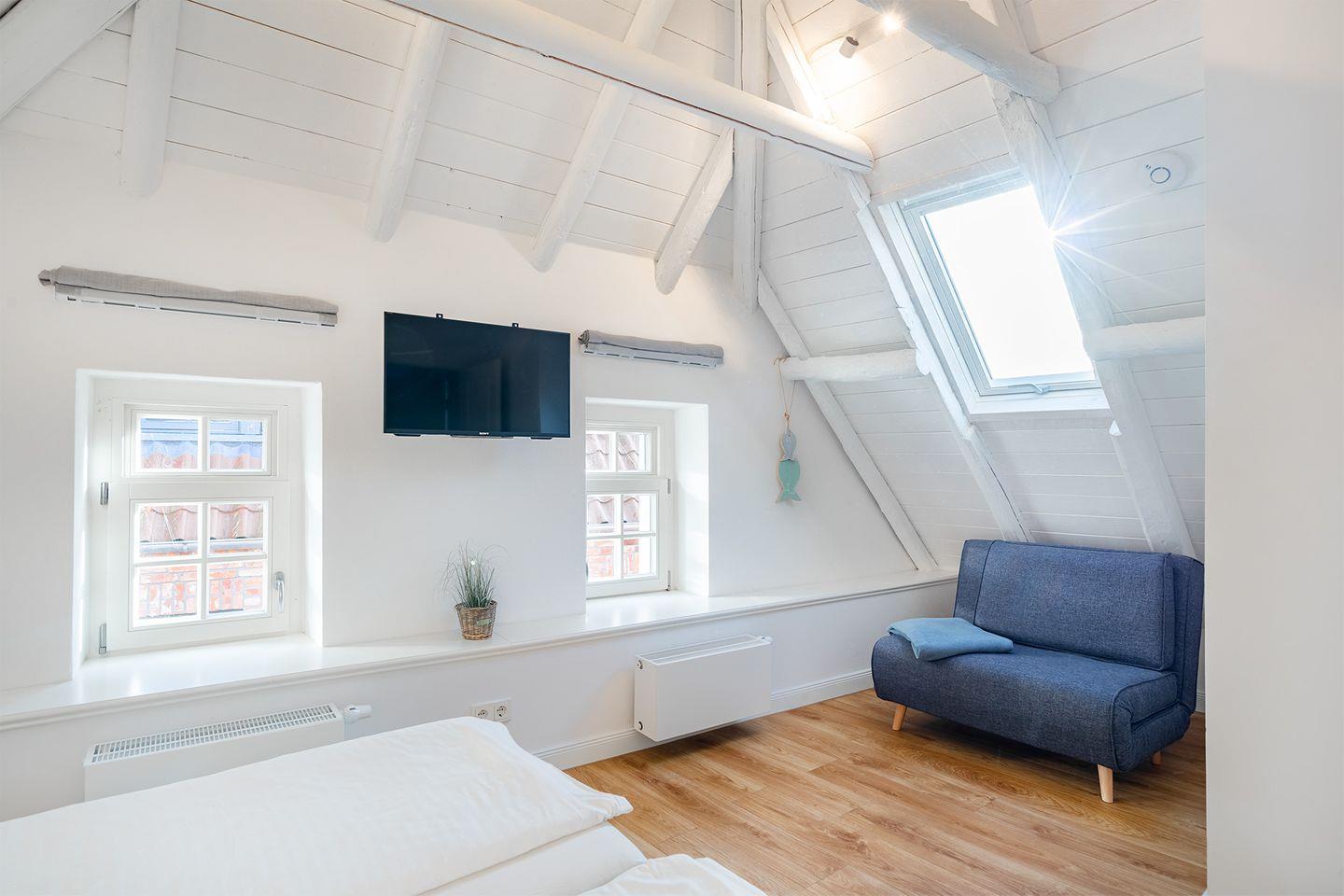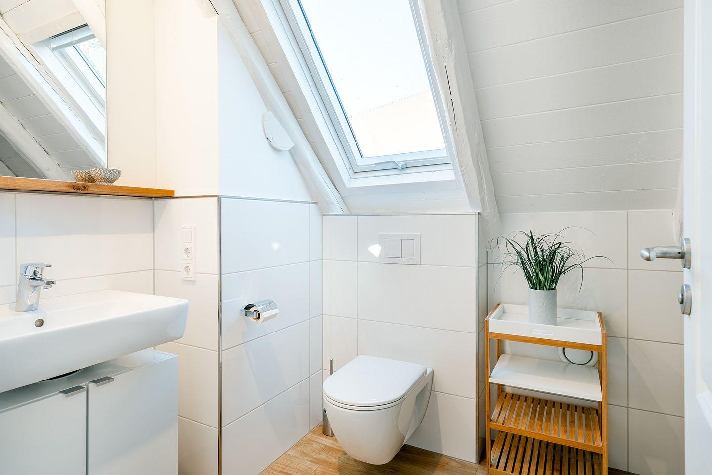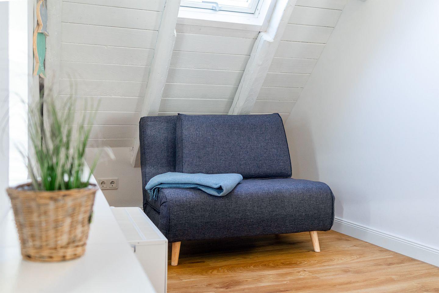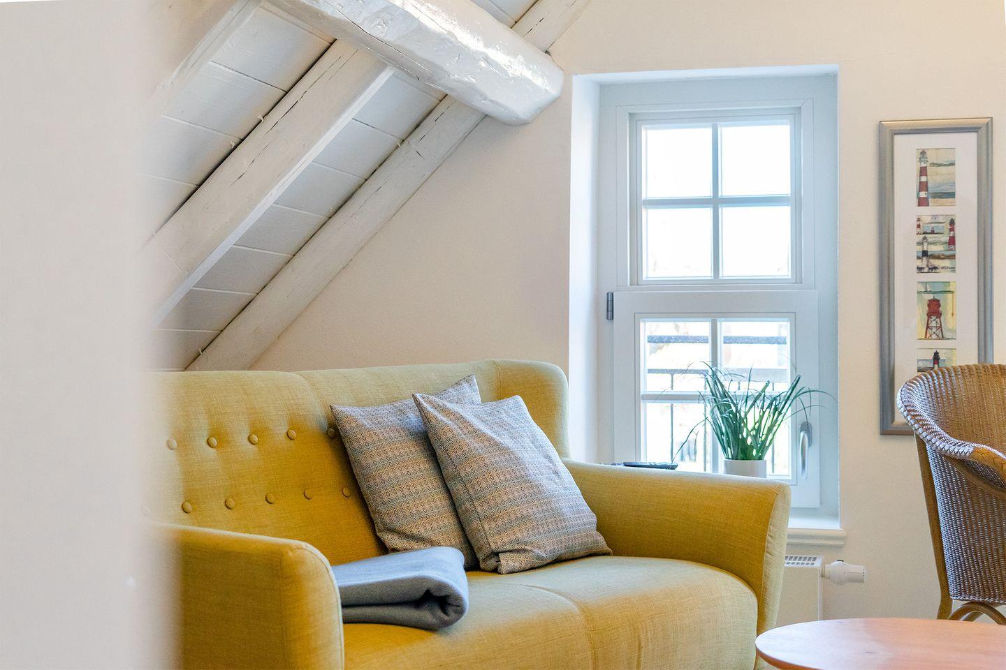 Die Wohnung im Obergeschoss bietet einen offenen Wohn- und Essbereich. Das gemütliche Bett befindet sich in der Dachschräge mit Blick auf die offenen Holzbalken. Die moderne weiße Küche ist komplett ausgestattet, sodass Sie für einen Kochabend bestens gerüstet sind. Am kleinen Esstisch können Sie zum Frühstück oder Abendessen sitzen und die ruhige Atmosphäre genießen.