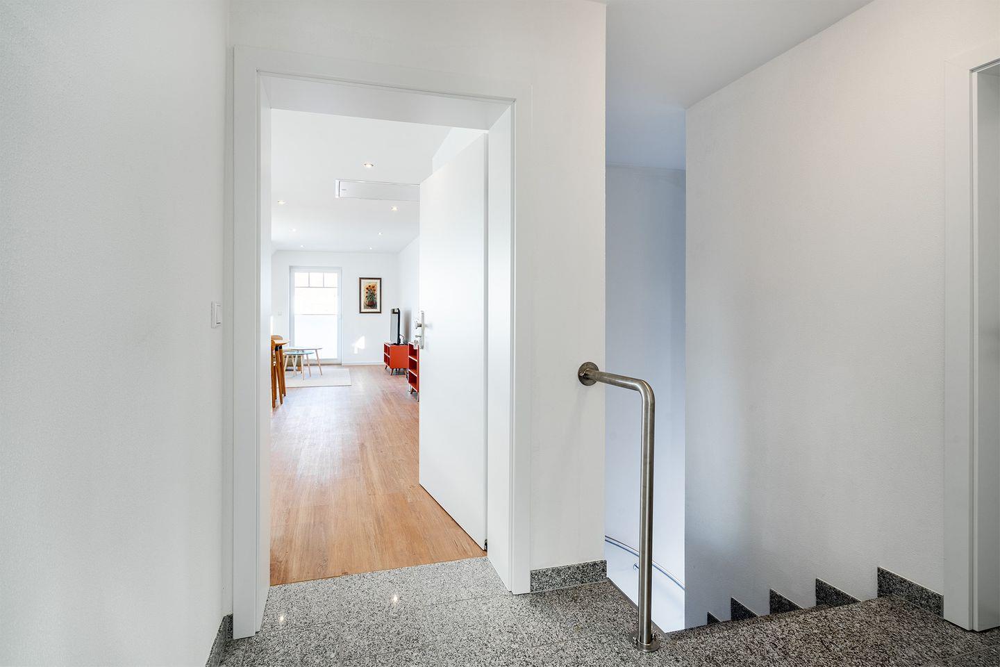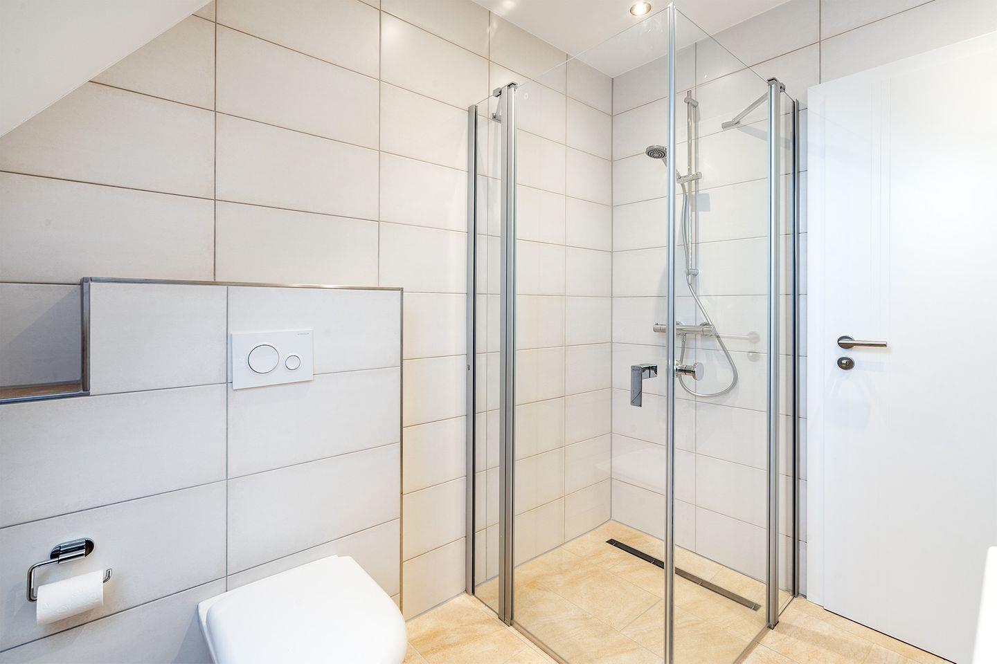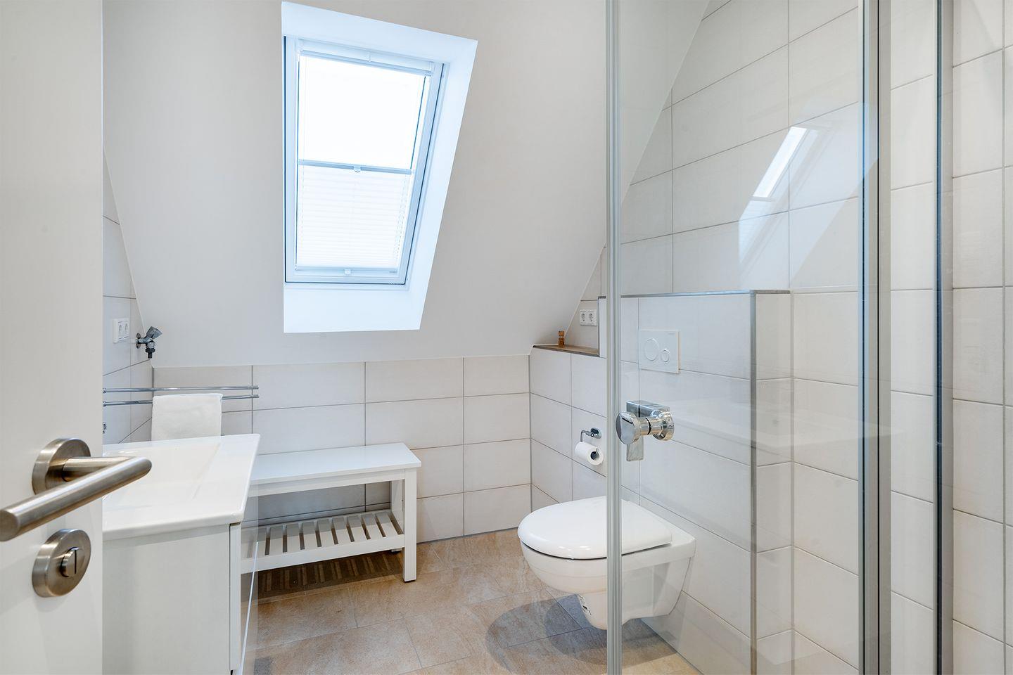 Das moderne Bad verfügt über eine bodengleiche begehbare Dusche, die für Komfort und Entspannung sorgt.