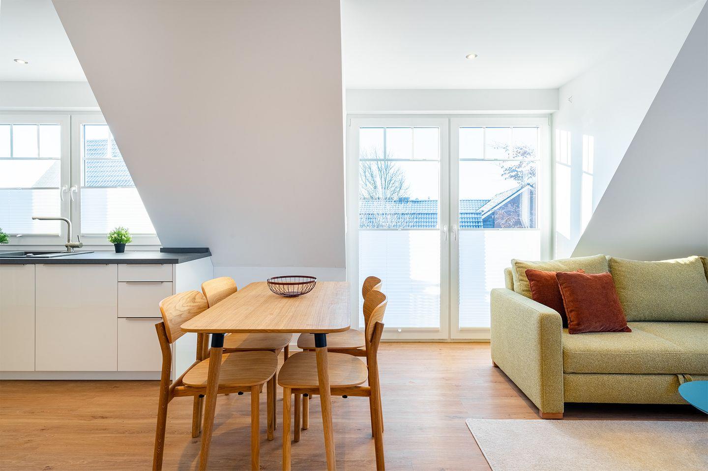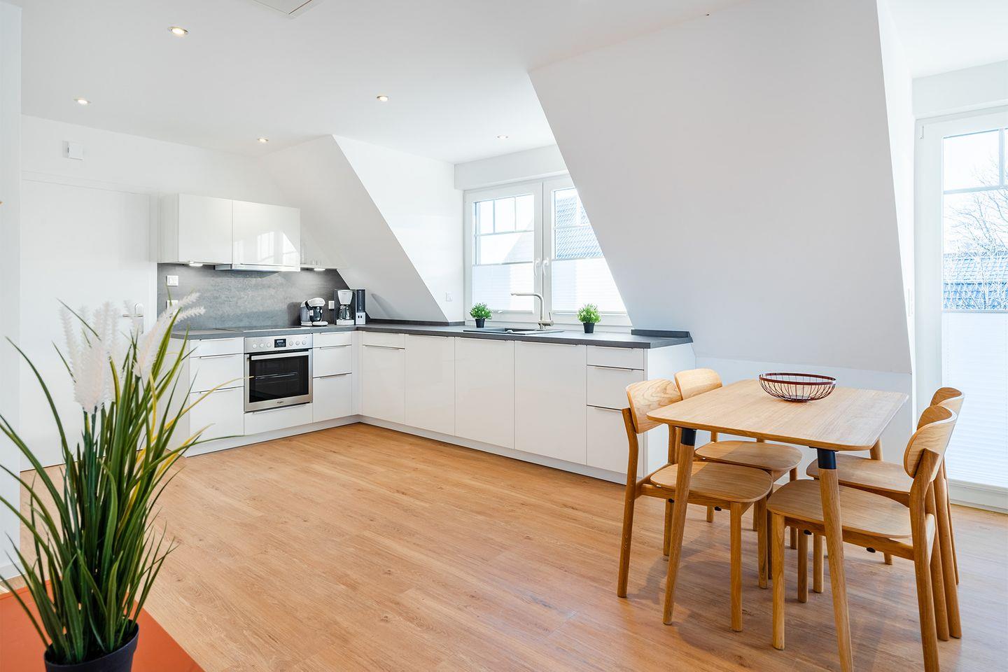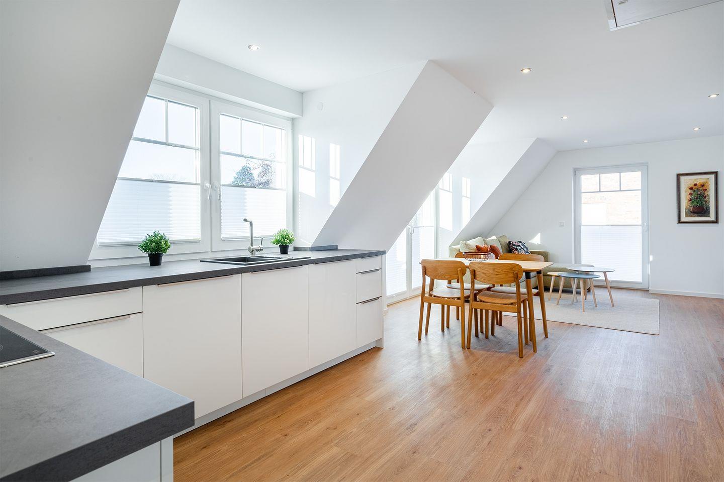 Der großzügige, helle Wohn-Essbereich mit moderner Küche lädt zum gemeinsamen Kochen und Verweilen ein. Die Küche ist voll ausgestattet und bietet alles, was Sie für Ihre Mahlzeiten oder ein gemütliches Frühstück benötigen.