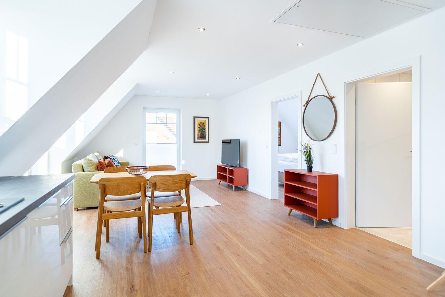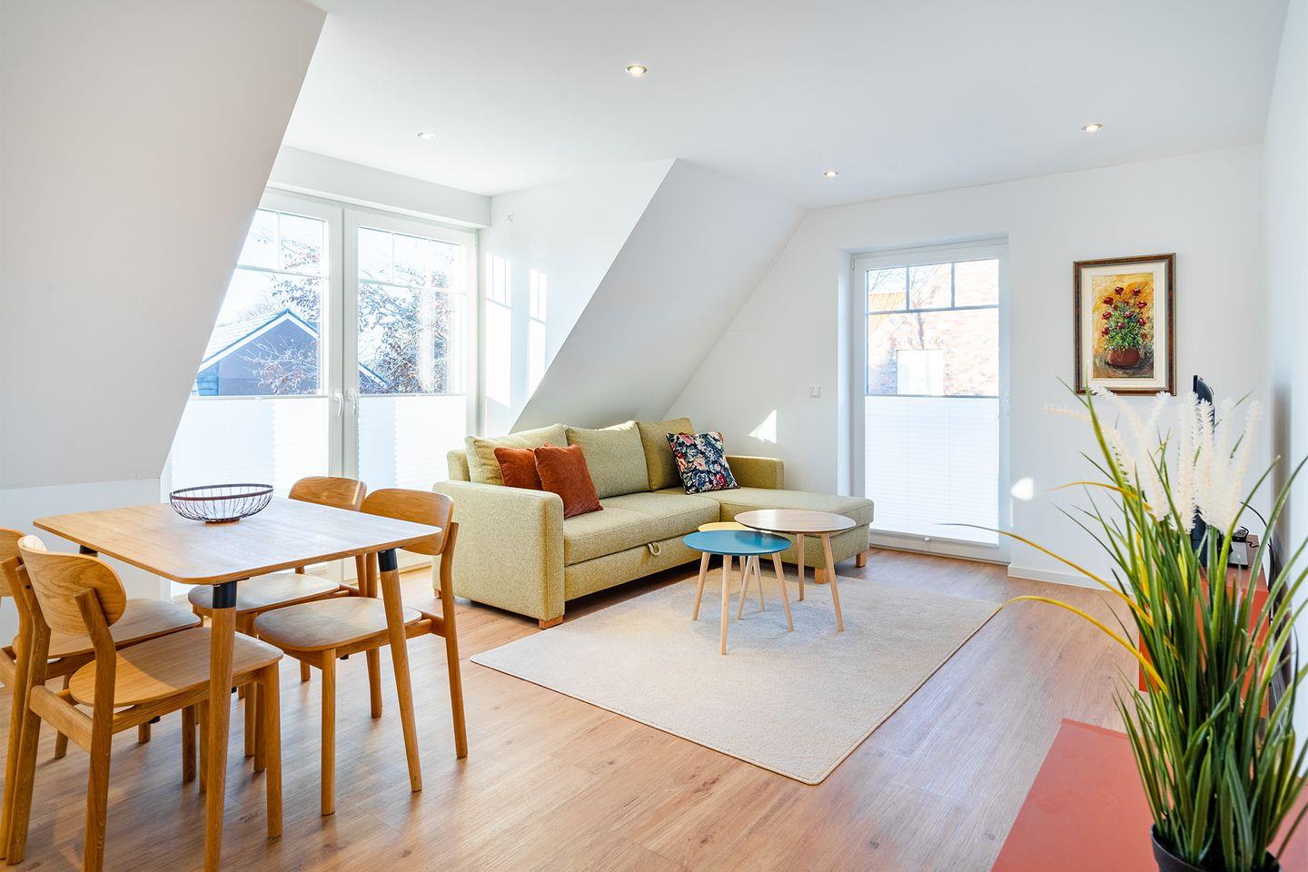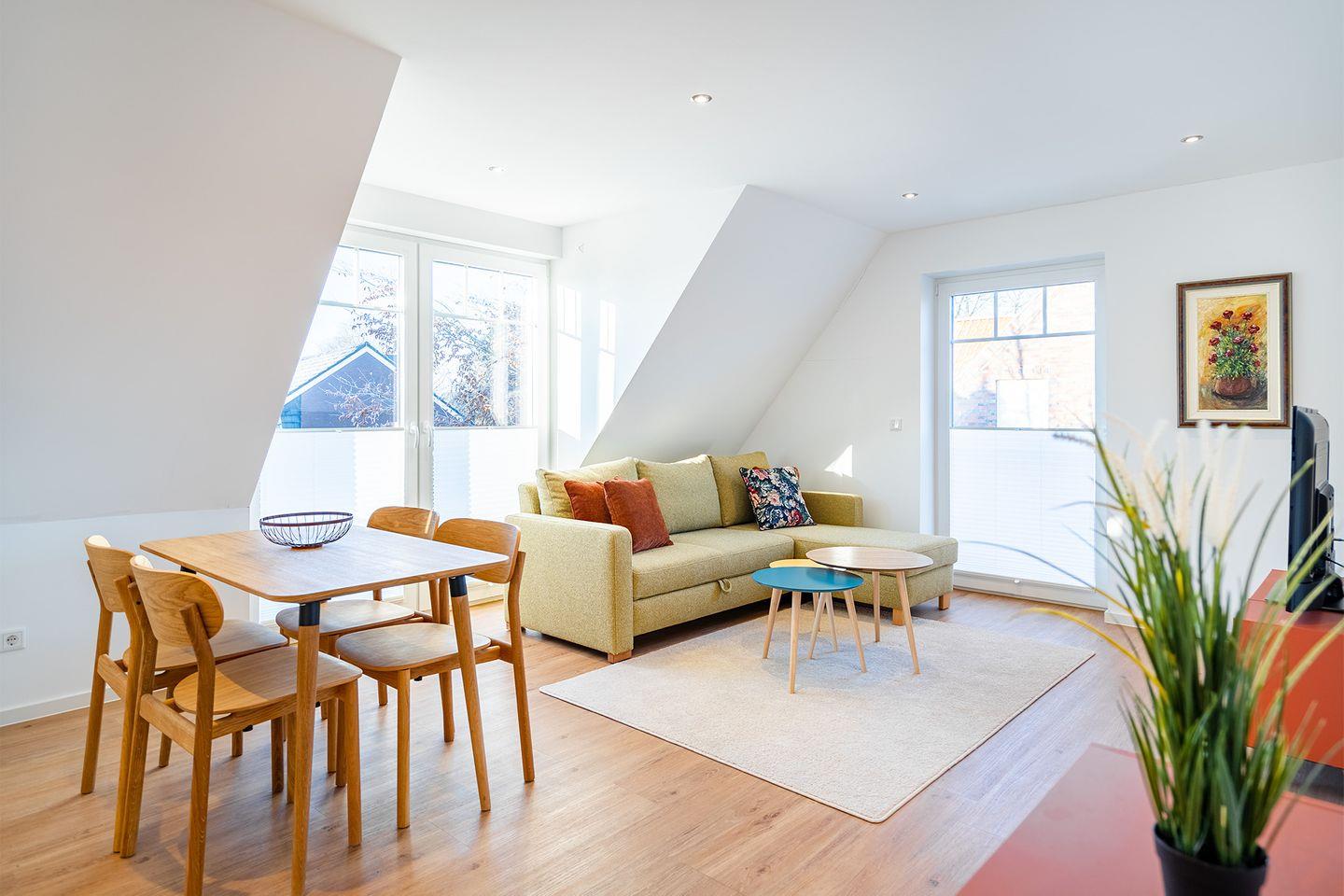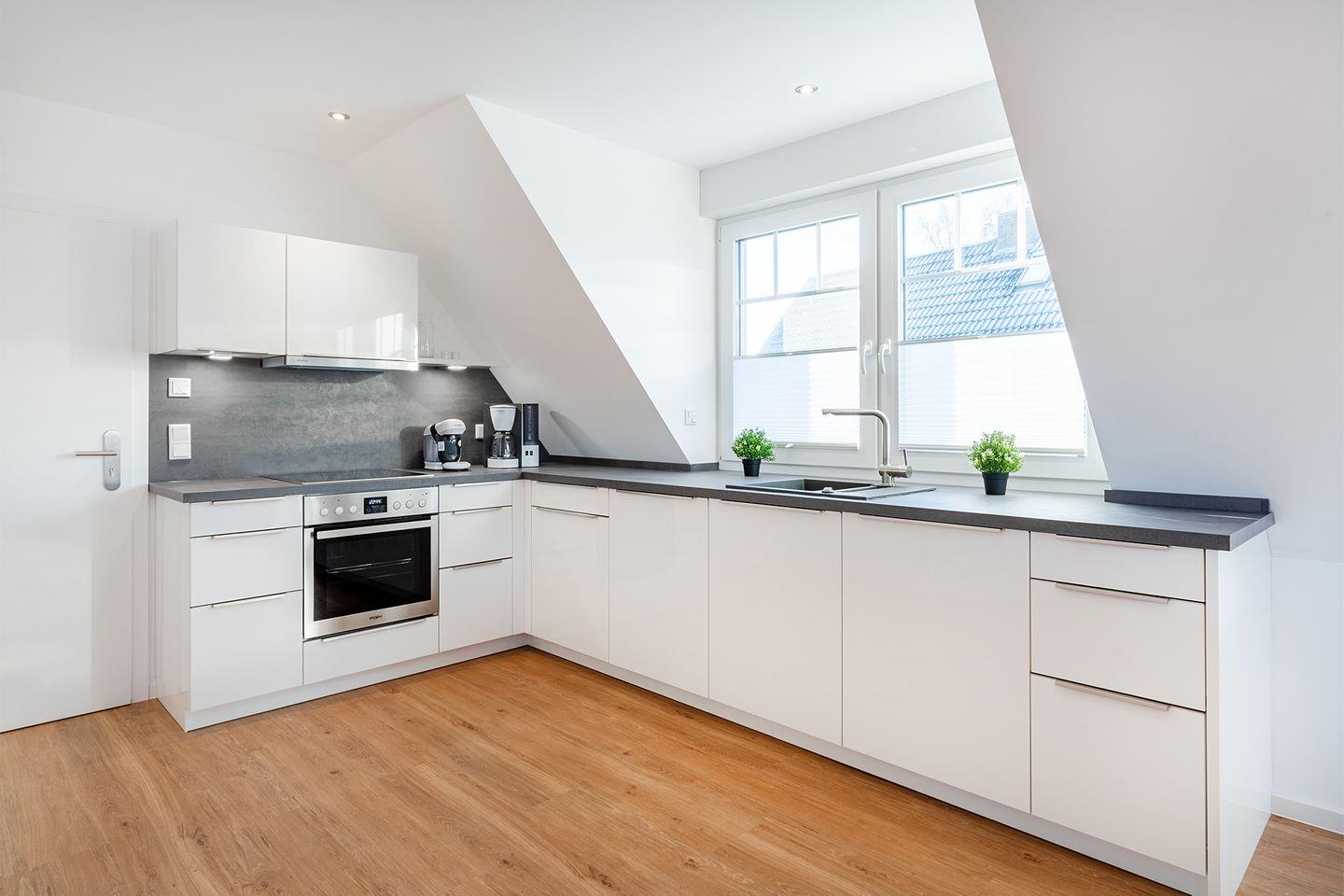 Der großzügige, helle Wohn-Essbereich mit moderner Küche lädt zum gemeinsamen Kochen und Verweilen ein. Die Küche ist voll ausgestattet und bietet alles, was Sie für Ihre Mahlzeiten oder ein gemütliches Frühstück benötigen.
