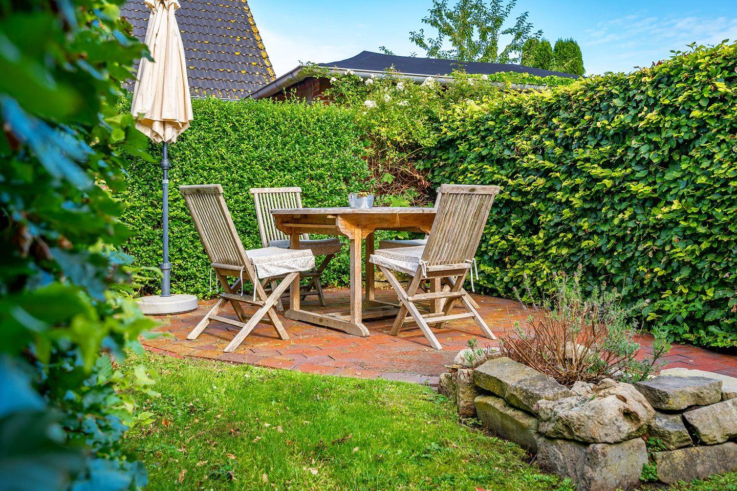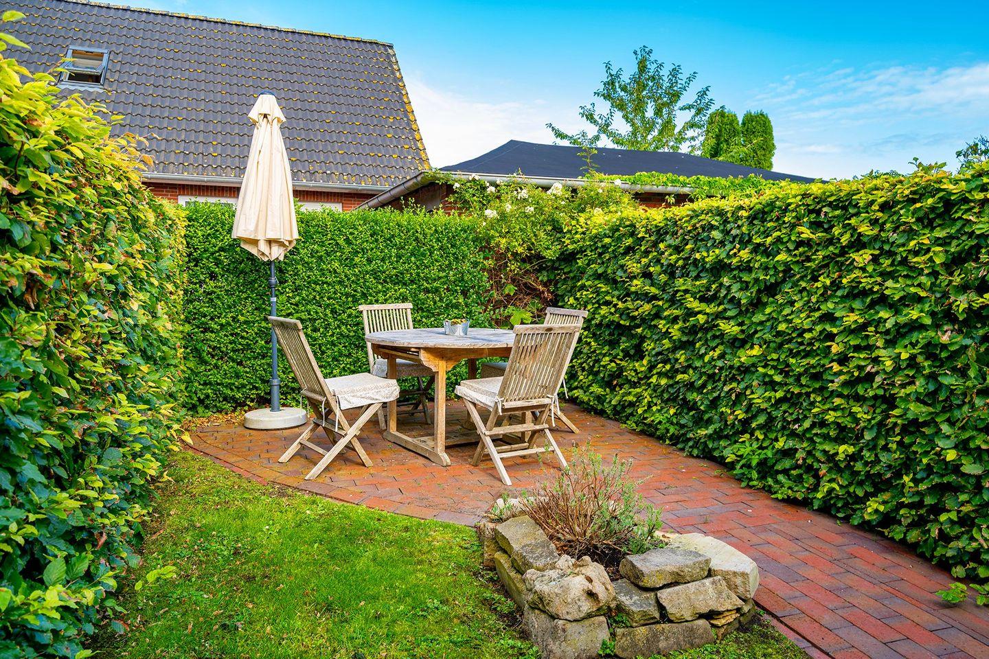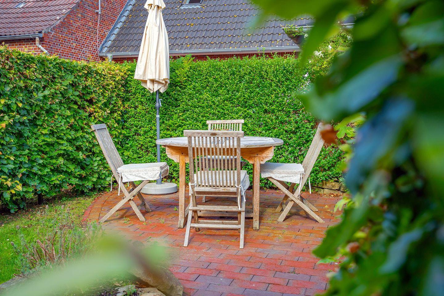 Vom Wohn- und Essbereich gelangen Sie auf die kleine Loggia, von der aus Sie einen schönen Blick auf die Mühlenstraße und das Geschehen in Greetsiel haben. Alternativ können Sie sich auf der Terrasse im eigenen Garten entspannen und den Tag genießen.