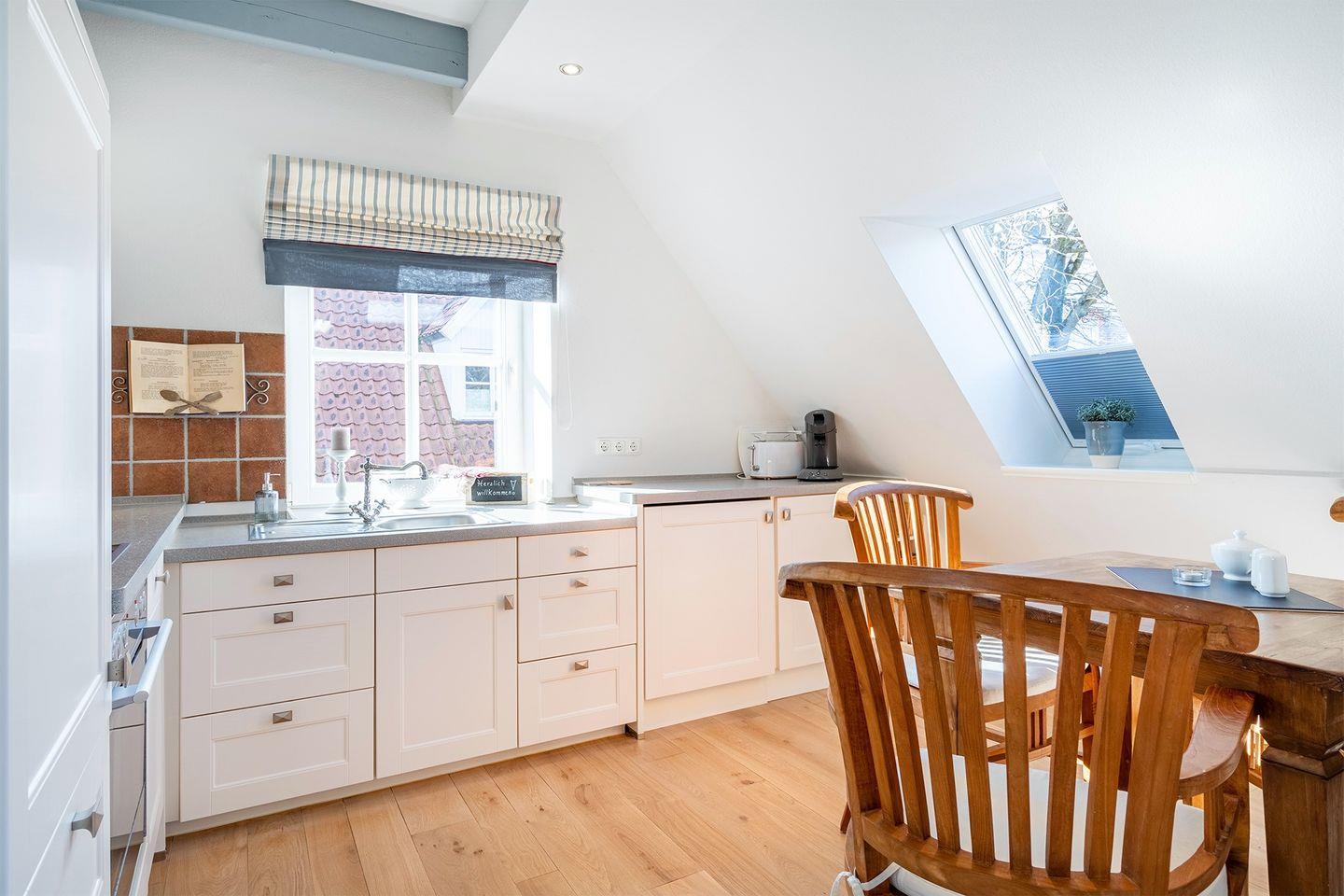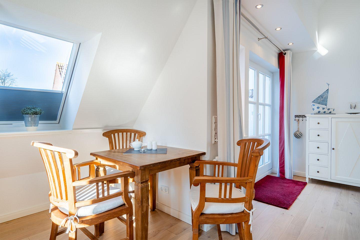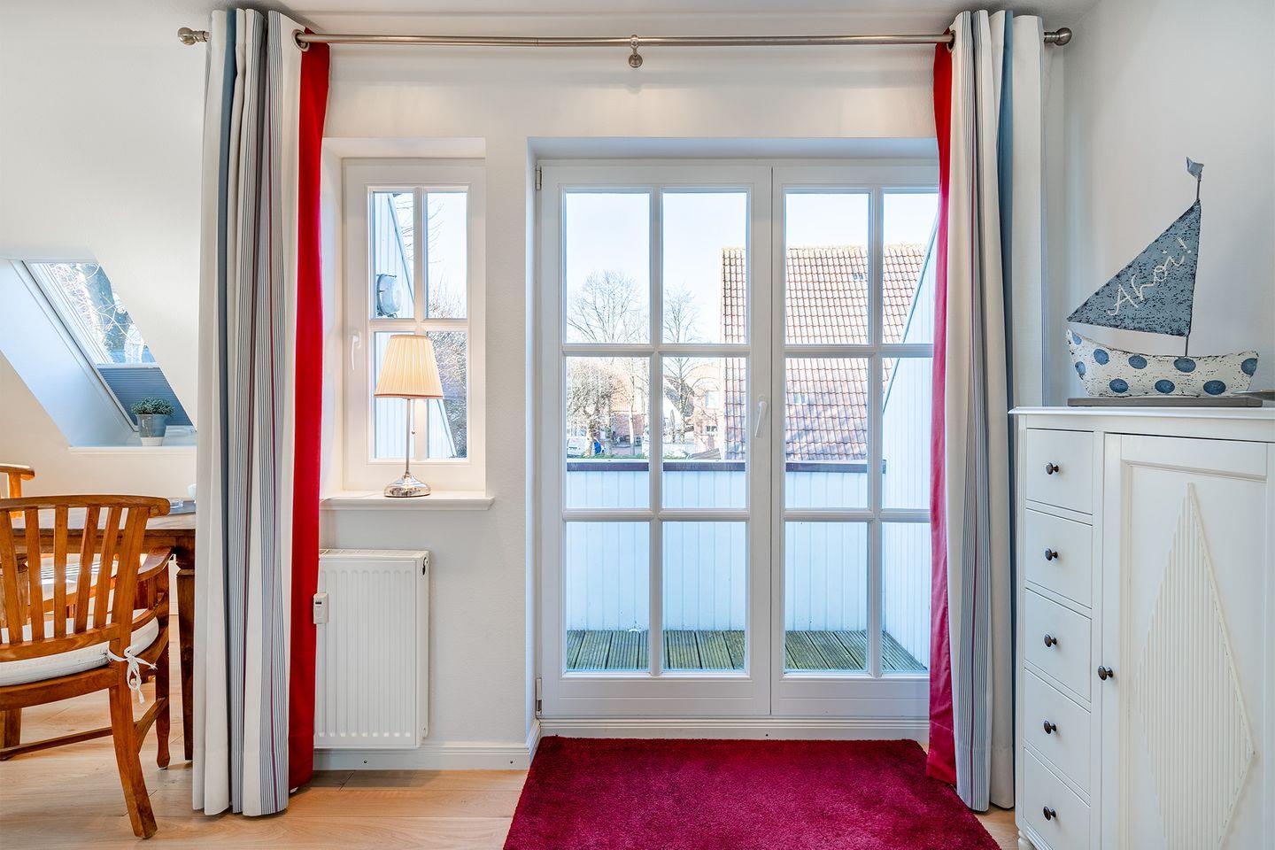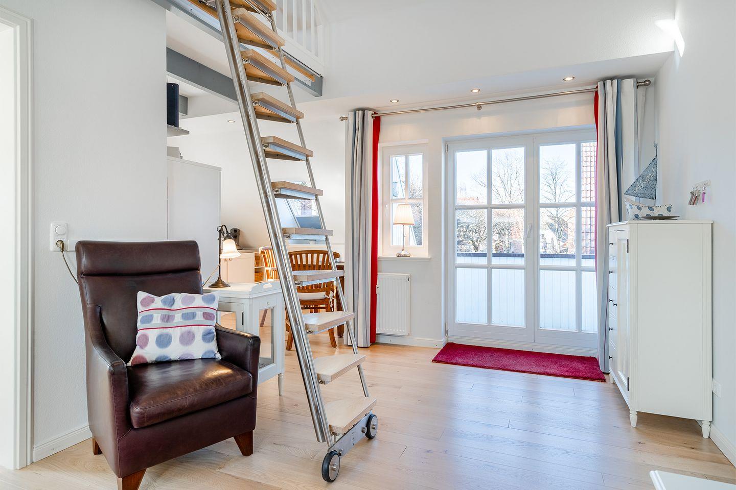 Vom Wohn- und Essbereich gelangen Sie auf die kleine Loggia, von der aus Sie einen schönen Blick auf die Mühlenstraße und das Geschehen in Greetsiel haben. Alternativ können Sie sich auf der Terrasse im eigenen Garten entspannen und den Tag genießen.