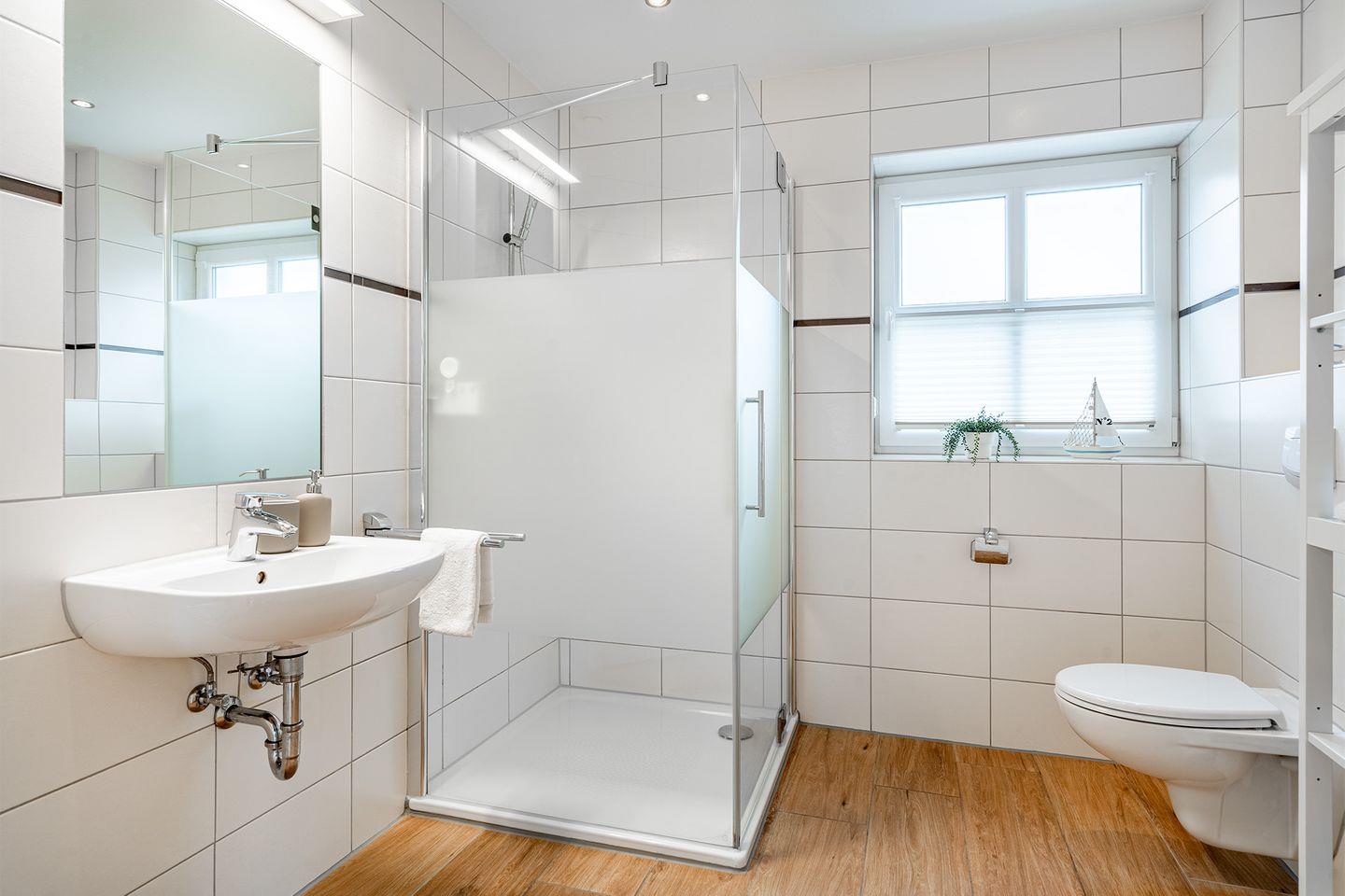 Das moderne Badezimmer verfügt über eine bodengleiche begehbare Dusche und alle Annehmlichkeiten, die Sie für Ihre morgendliche Frische benötigen.