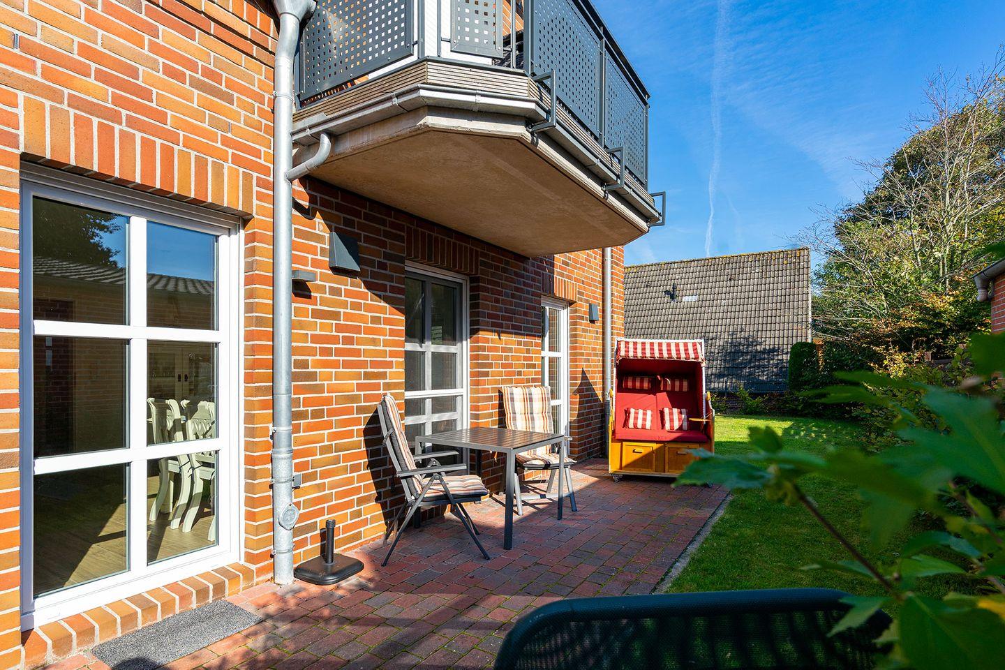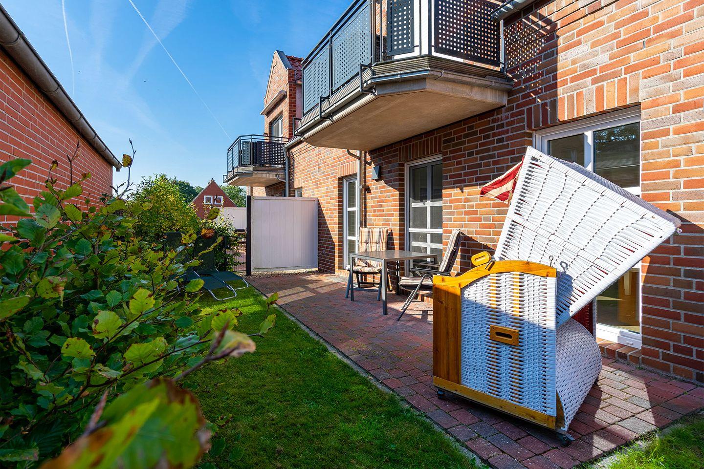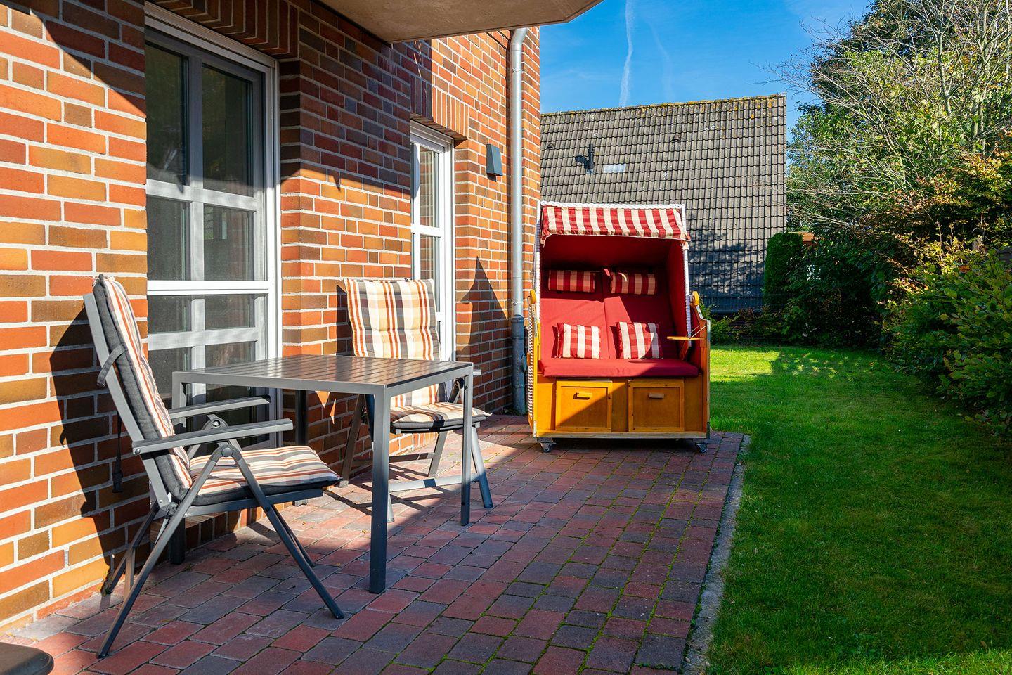 Terrasse & Garten: Bei schönem Wetter können Sie Ihre Zeit auf der Terrasse genießen, die mit Gartenmöbeln, einem Sonnenschirm und einem Strandkorb ausgestattet ist. Der Terrassen- und Rasenbereich ist eingezäunt, sodass sich Ihre Hunde hier frei bewegen können (Hunde sind herzlich willkommen, für 8,00 €/Nacht).