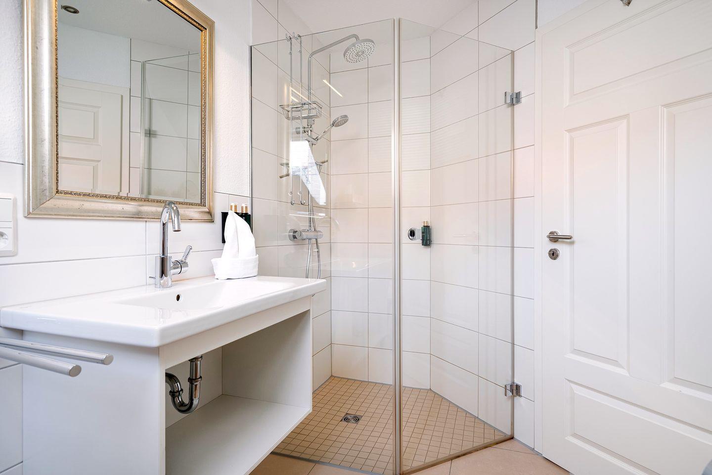 Badezimmer: Das Badezimmer verfügt über eine elegante bodengleiche Dusche, die mit einem "Raindancer"-Duschkopf ausgestattet ist, um Ihnen ein luxuriöses Duscherlebnis zu bieten.