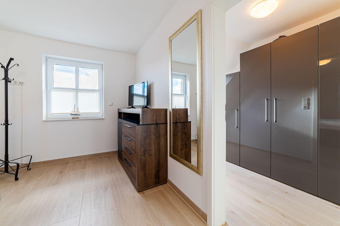 Schlafzimmer mit Doppelbett und einem zweiten TV sowie einem angrenzenden Ankleidezimmer