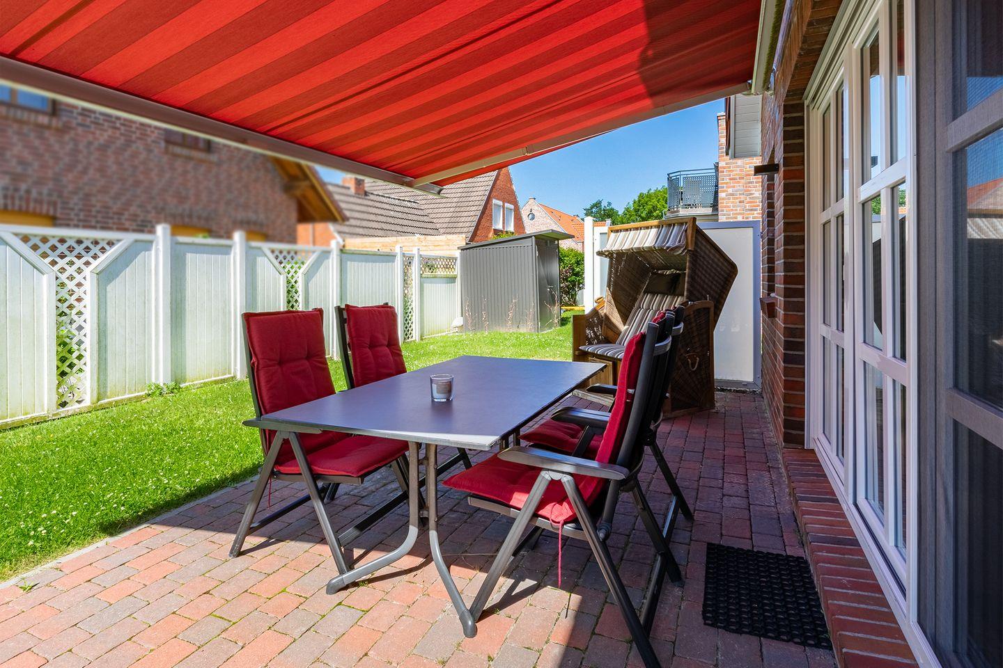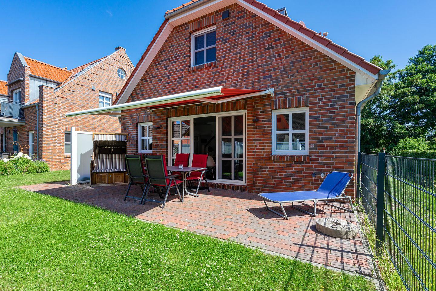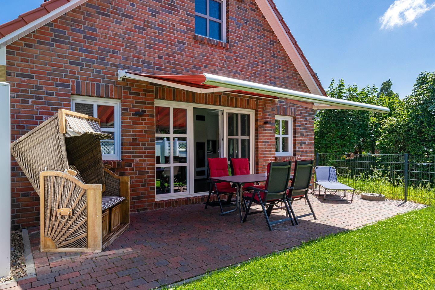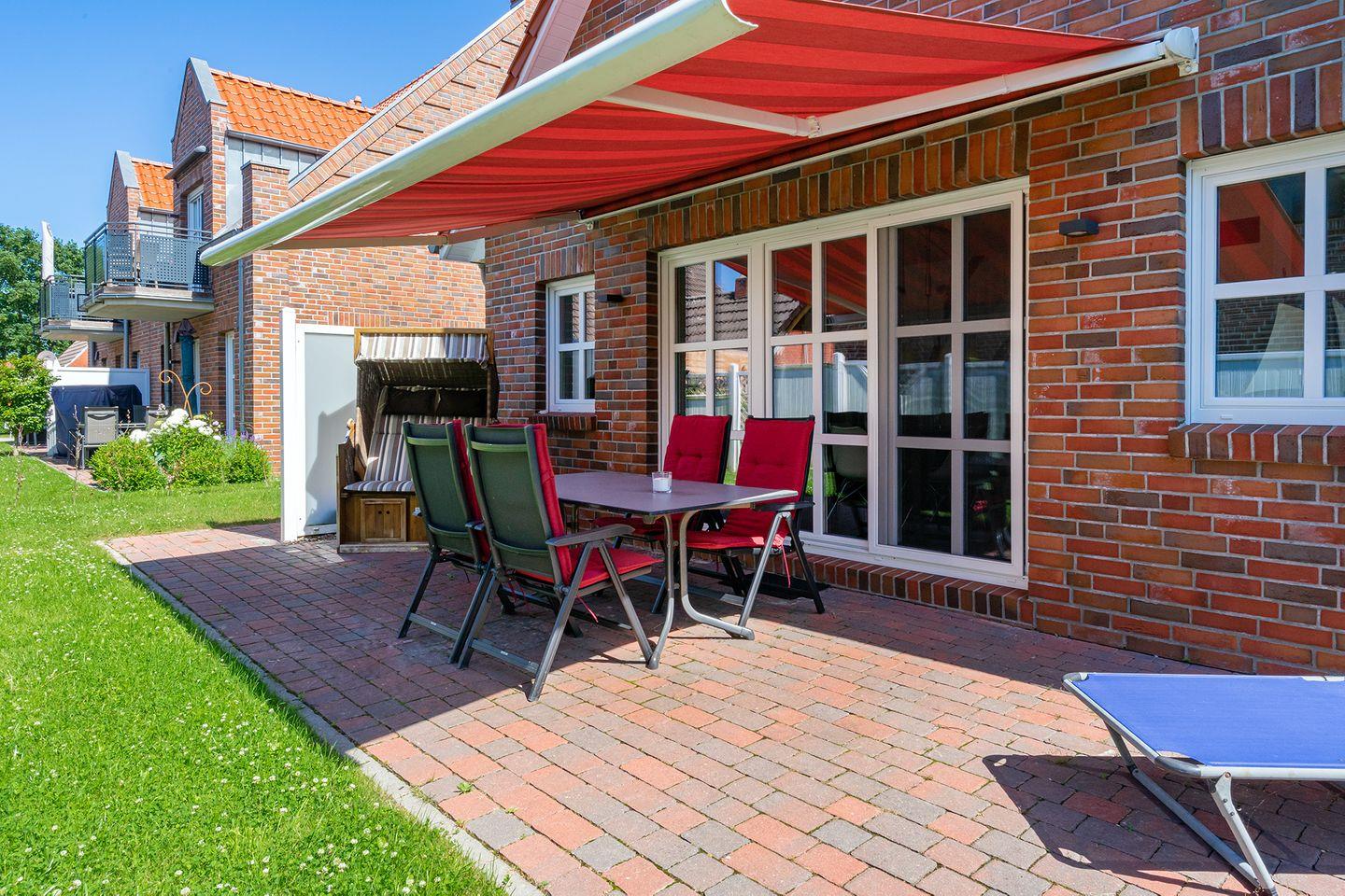 Bei schönem Wetter genießen Sie die großzügige Terrasse, die mit einem Strandkorb, Relaxliegen und einer Markise als Sonnenschutz ausgestattet ist – ideal, um draußen zu entspannen.