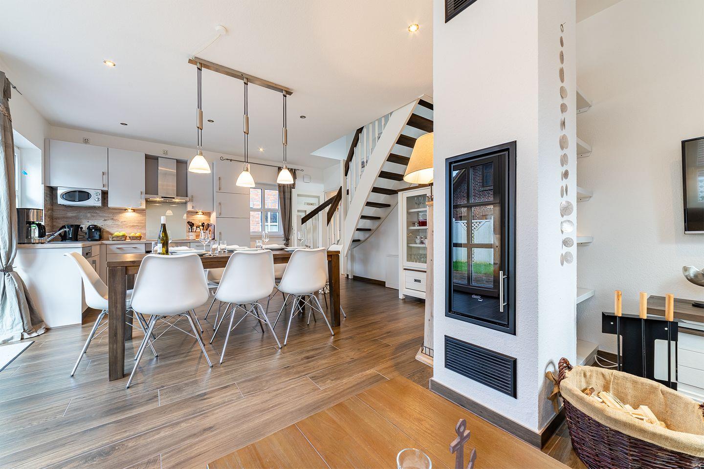 Der große Wohn-Essbereich mit integriertem Ofen lädt zu geselligen Stunden ein. Die angrenzende Küche ist vollständig ausgestattet, sodass Sie jederzeit kulinarische Köstlichkeiten zaubern können.
