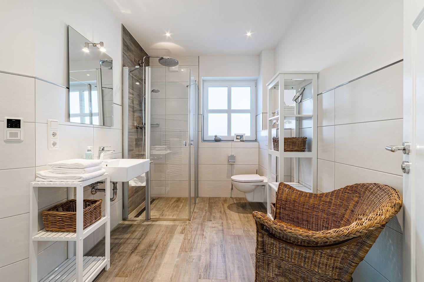 Bad mit bodengleicher Dusche und "Raindancer", ausreichend Ablagefläche, festinstalliertes Radio und Fenster für Tageslicht