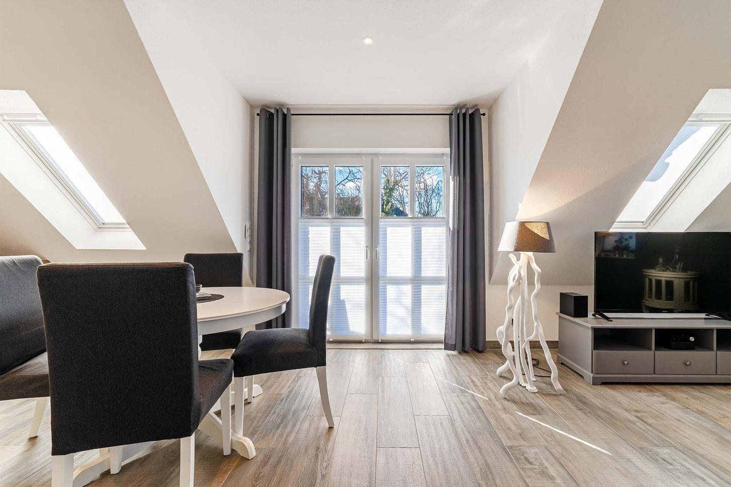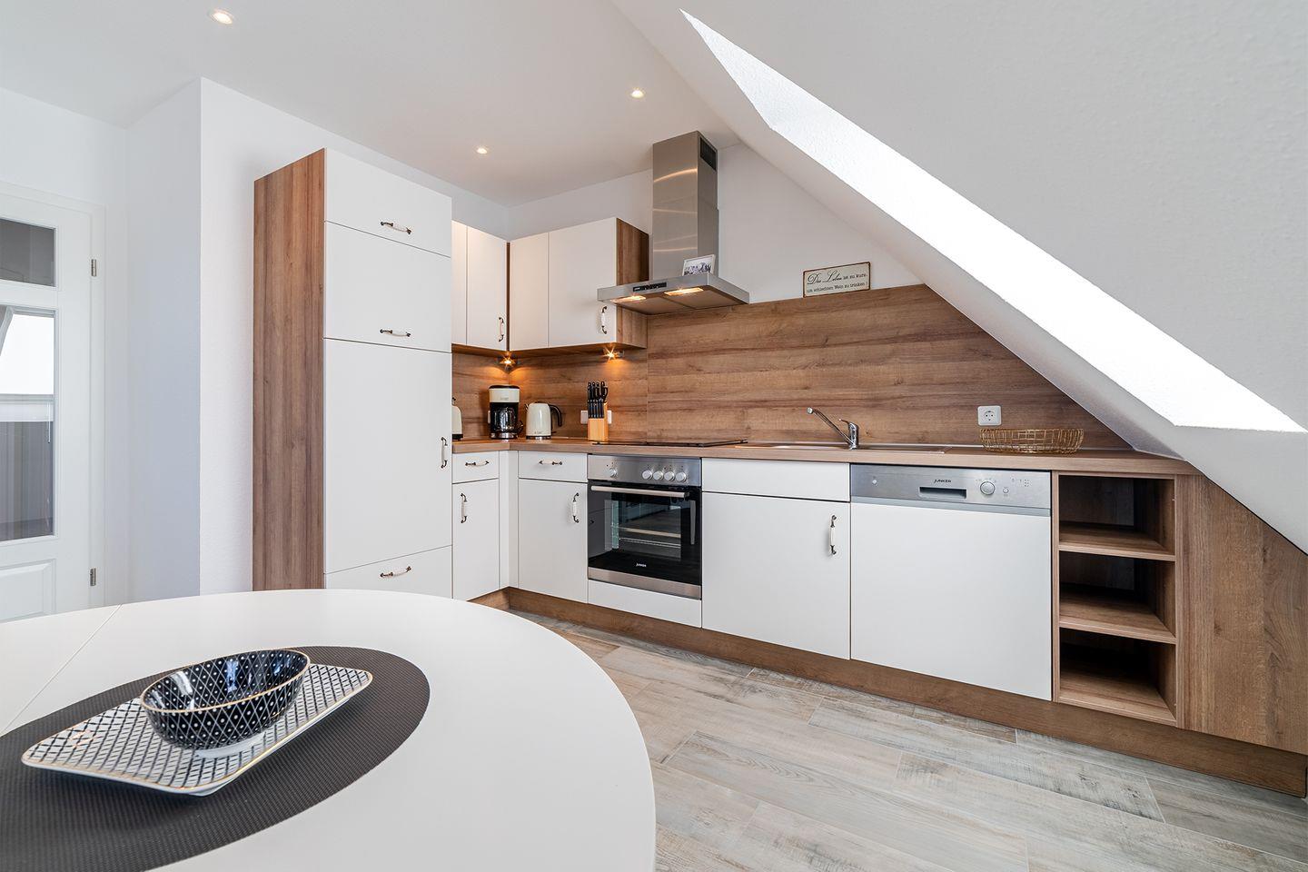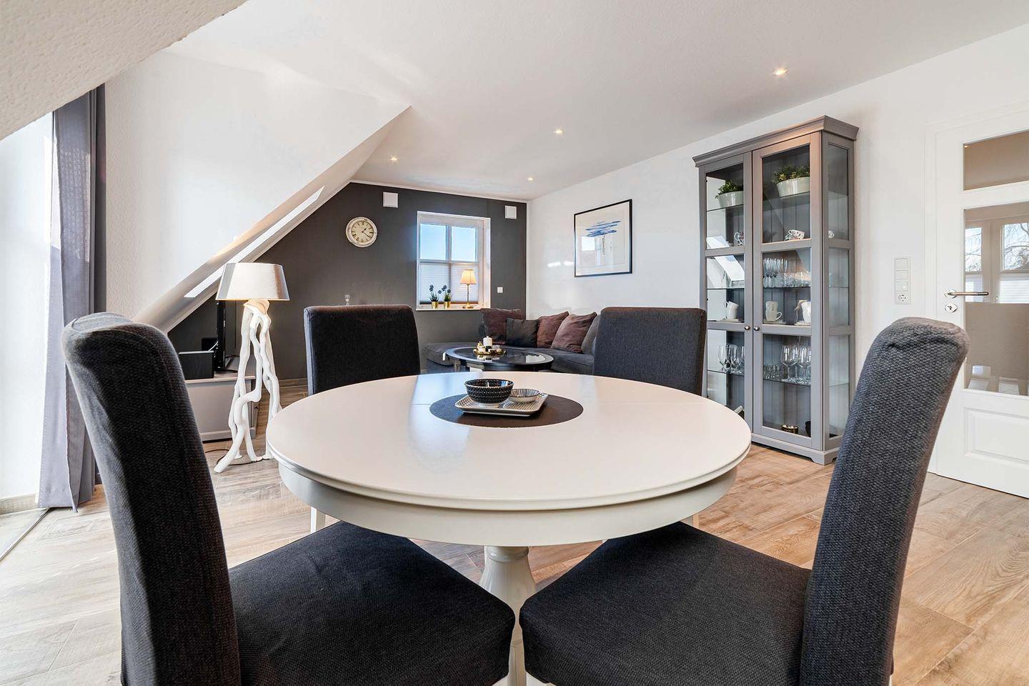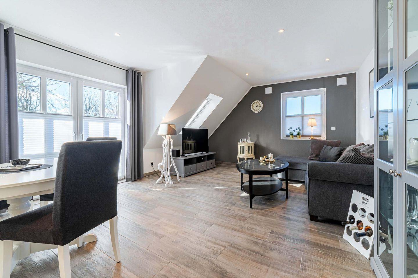 Die OG-Wohnung ist hochwertig und modern eingerichtet und bietet alle Annehmlichkeiten, die für einen erholsamen Urlaub sorgen. Der lichtdurchflutete Wohn- und Essbereich mit einer vollständig ausgestatteten Küche bietet Ihnen genügend Platz für gemütliche Stunden.