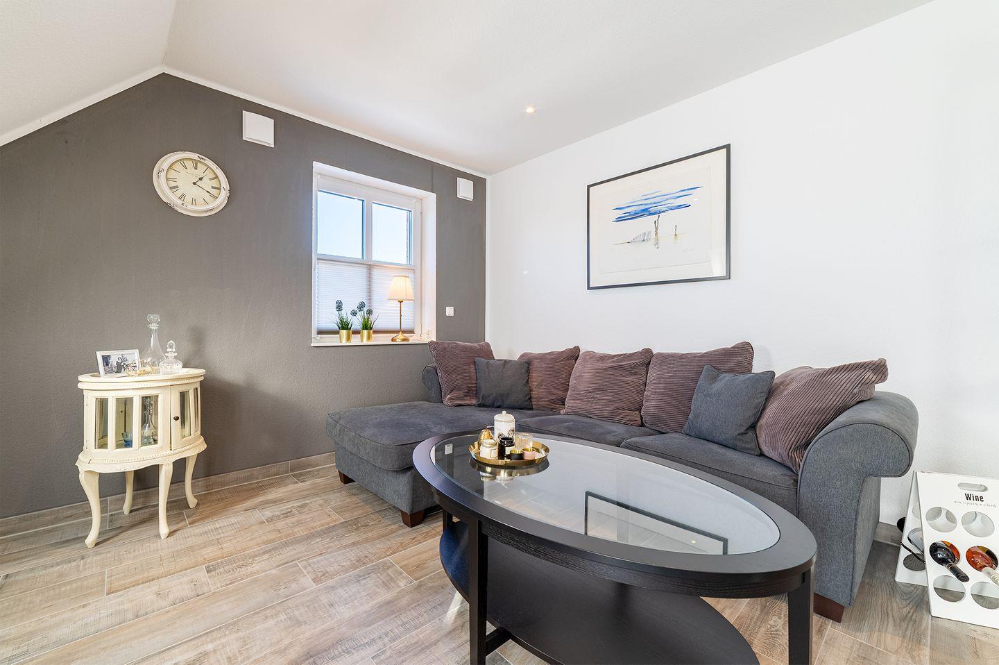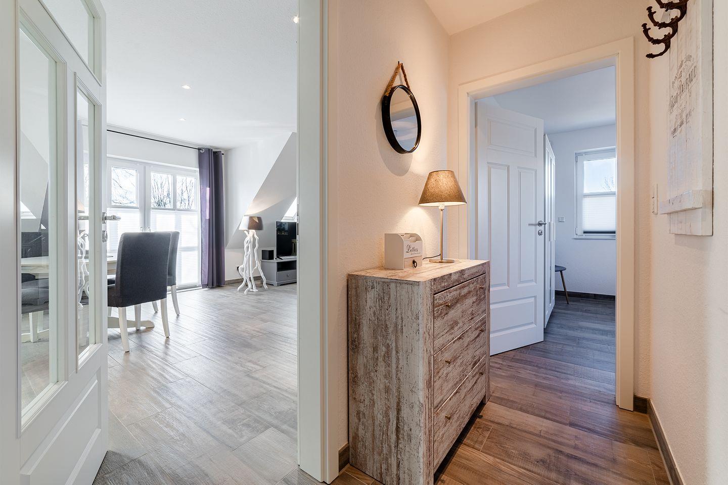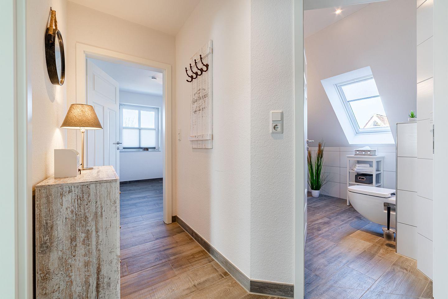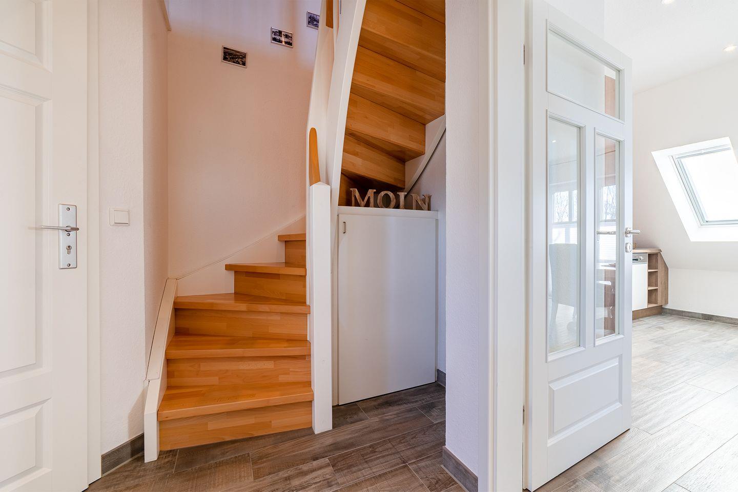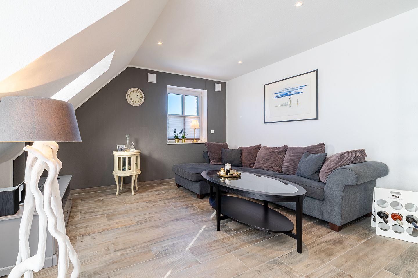 Die OG-Wohnung ist hochwertig und modern eingerichtet und bietet alle Annehmlichkeiten, die für einen erholsamen Urlaub sorgen. Der lichtdurchflutete Wohn- und Essbereich mit einer vollständig ausgestatteten Küche bietet Ihnen genügend Platz für gemütliche Stunden.