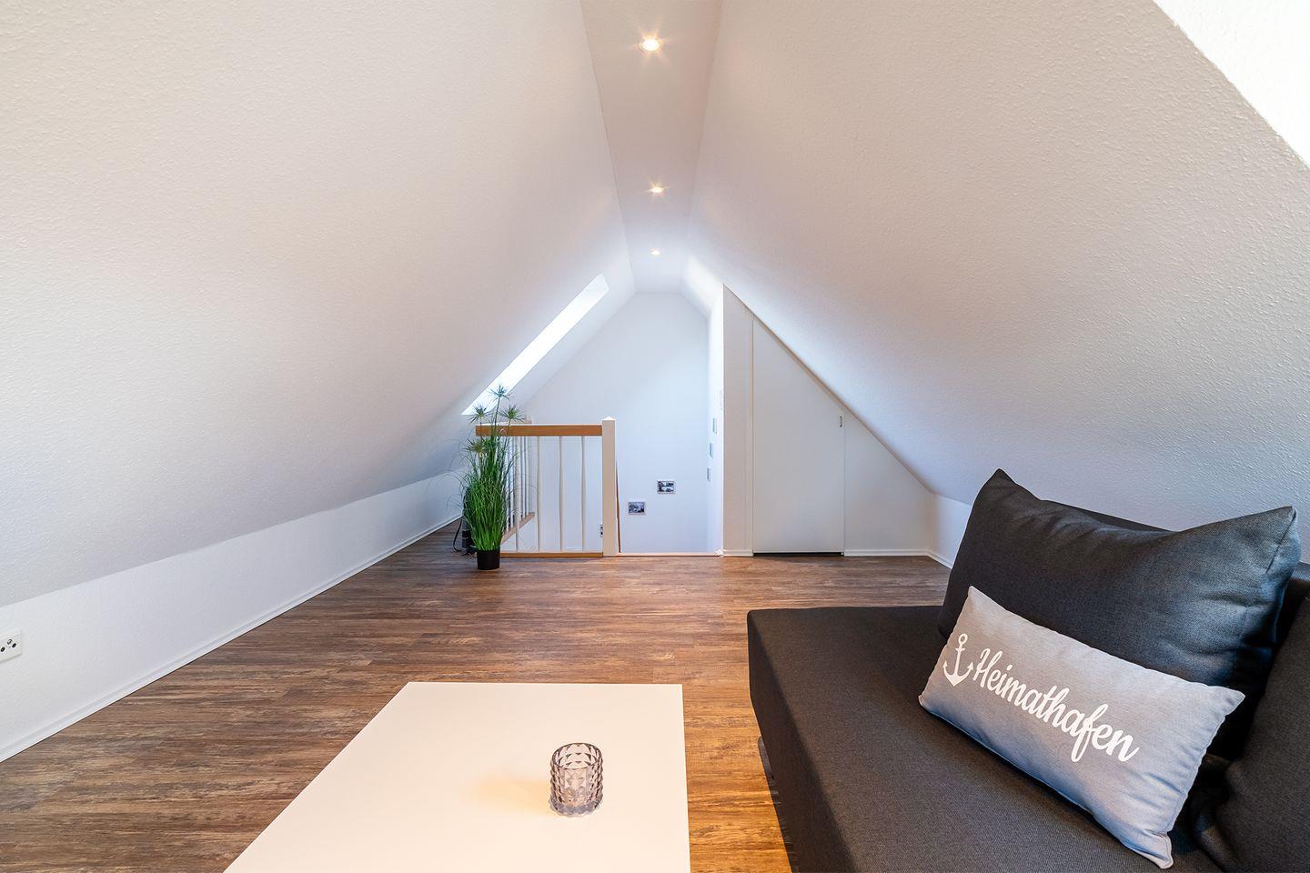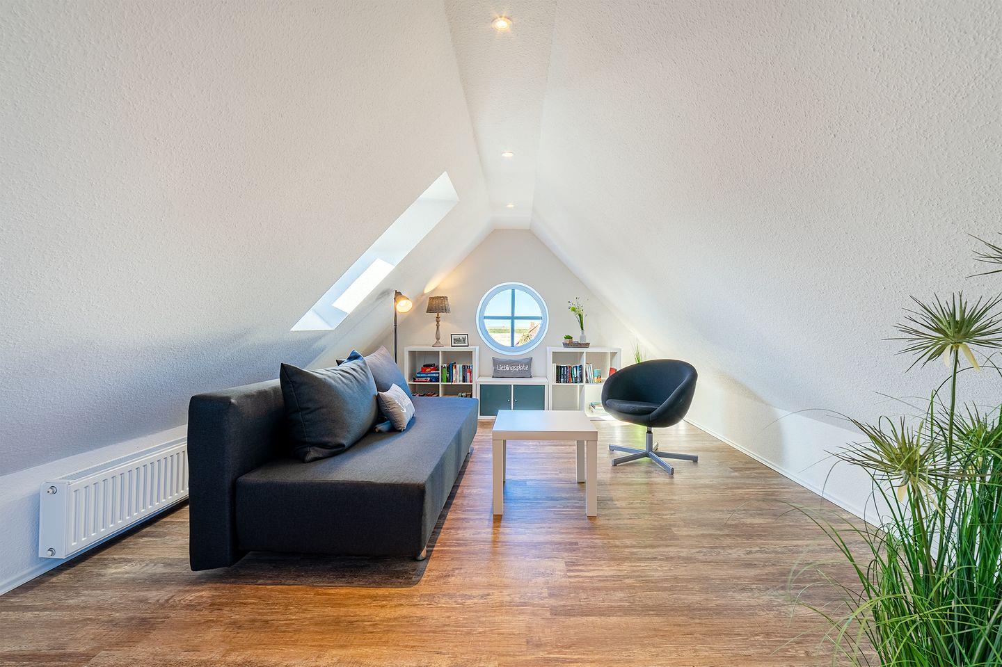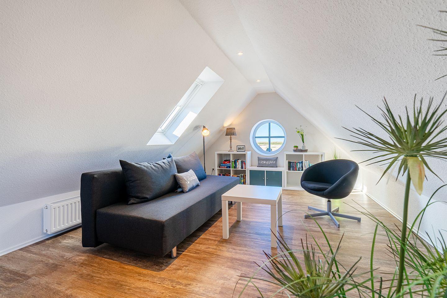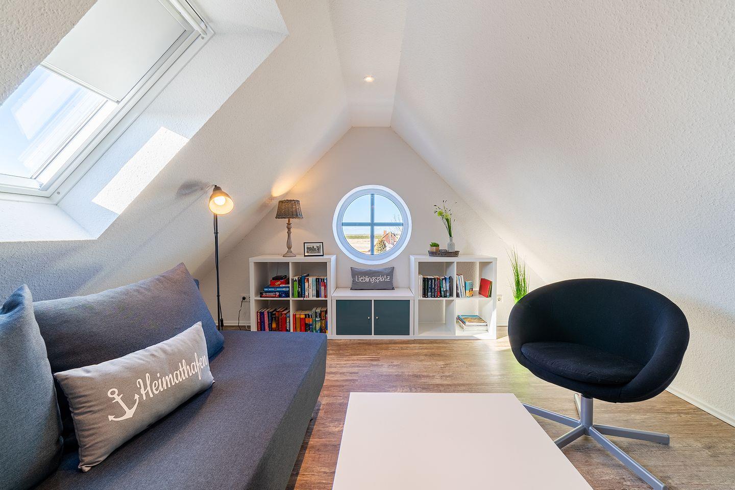 Im Dachgeschoss erwartet Sie eine kleine Bibliothek, die zum Abschalten einlädt und einen wunderschönen Blick über den Deich in Richtung Badesee bietet. Hier befindet sich auch ein Funktionssofa (140x200 cm), das als 3. und 4. Schlafmöglichkeit genutzt werden kann.