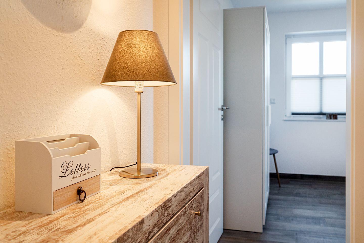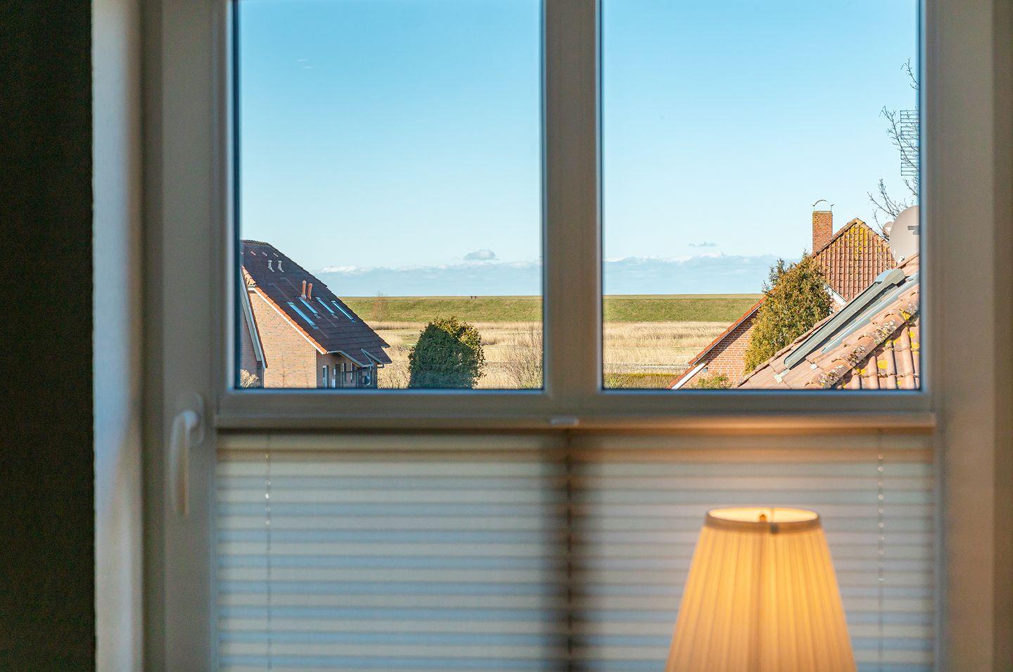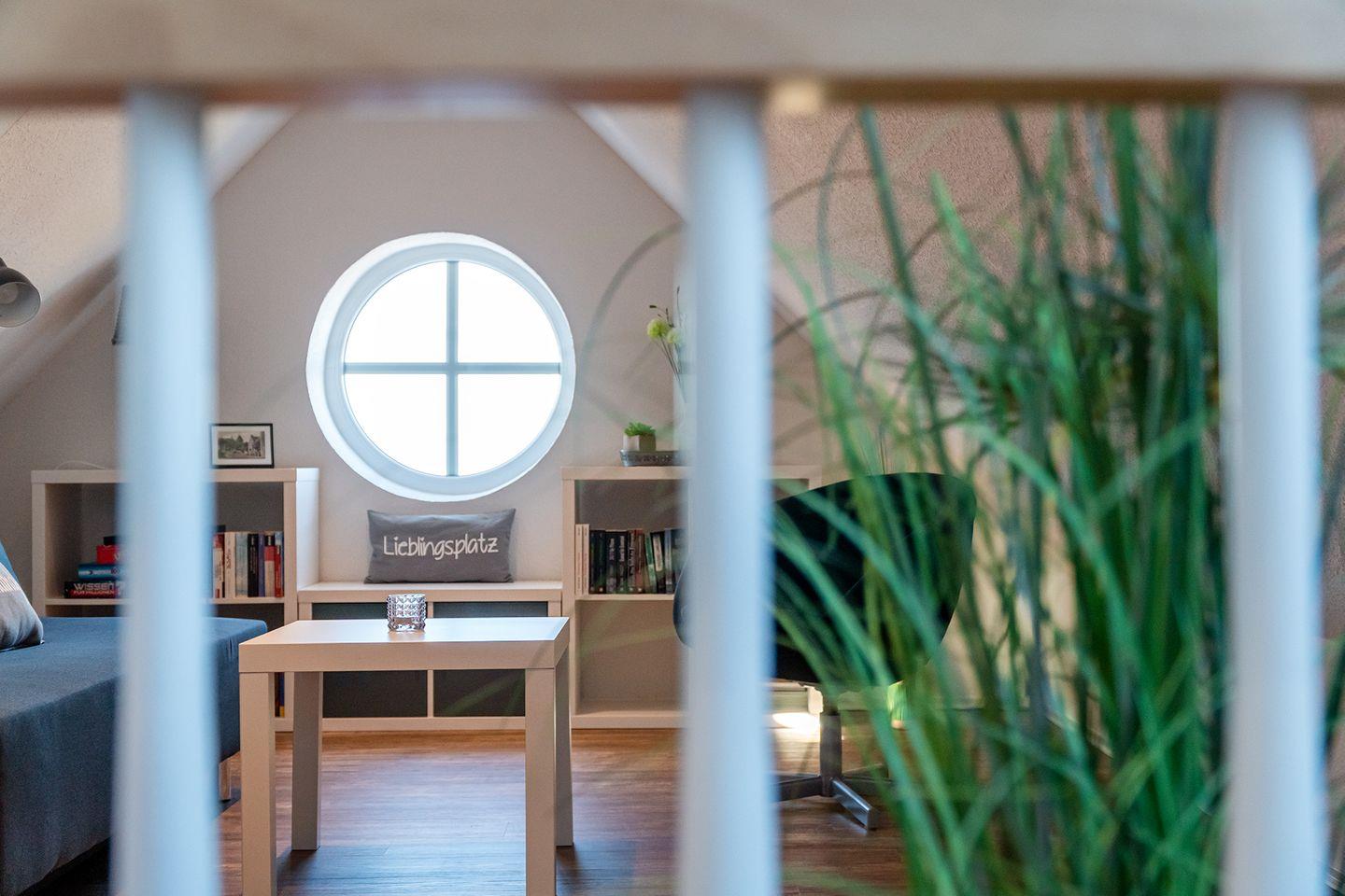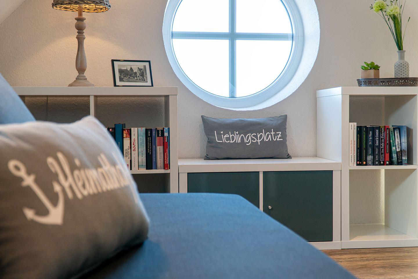 Im Dachgeschoss erwartet Sie eine kleine Bibliothek, die zum Abschalten einlädt und einen wunderschönen Blick über den Deich in Richtung Badesee bietet. Hier befindet sich auch ein Funktionssofa (140x200 cm), das als 3. und 4. Schlafmöglichkeit genutzt werden kann.
