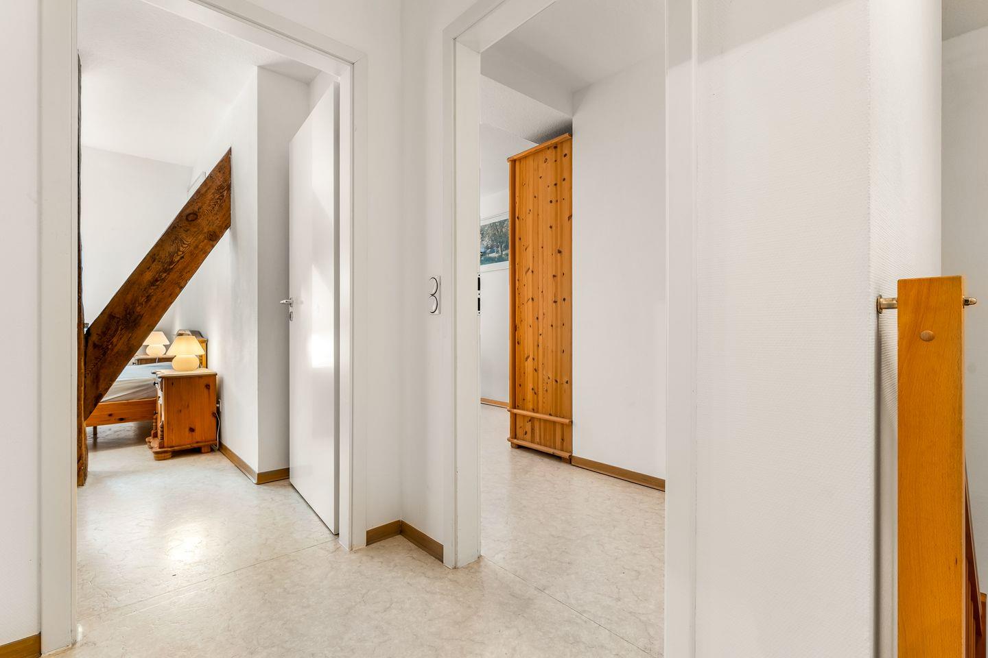 Im Obergeschoss befinden sich zwei behagliche Schlafzimmer – eines mit einem komfortablen Doppelbett, das andere mit einem französischen Bett. Hier können Sie sich nach einem ereignisreichen Tag entspannt zurückziehen. Das Bad mit Dusche, Waschmaschine und Trockner bietet zusätzlichen Komfort.
