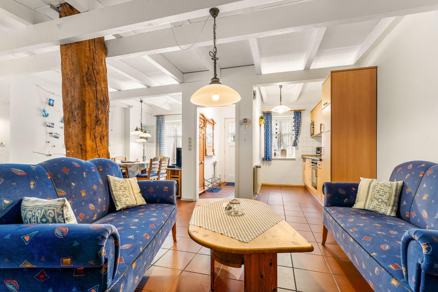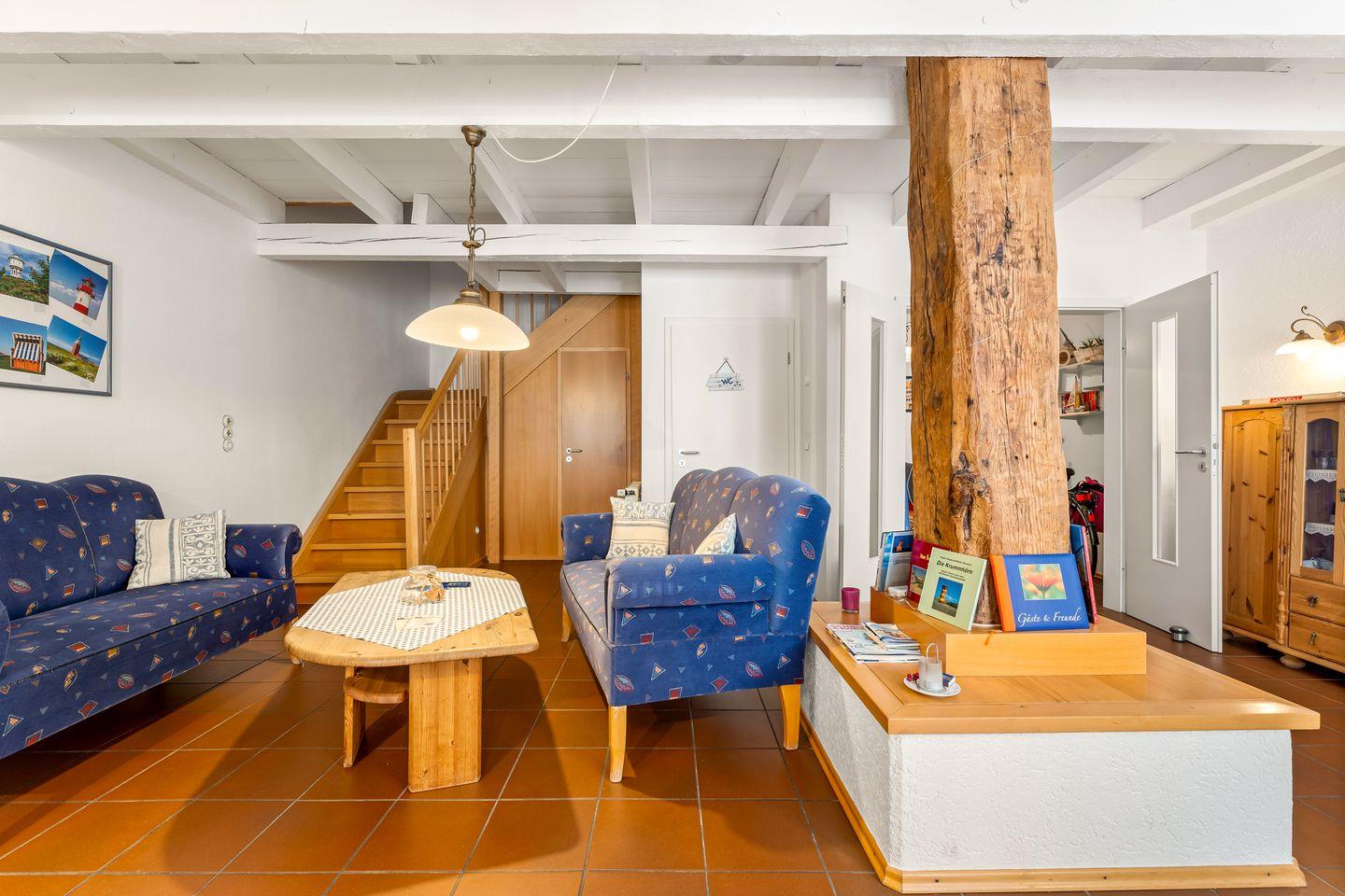 Die Wohnung, die Sie ebenerdig von der Terrasse aus über einen eigenen Eingang betreten, erstreckt sich über zwei Etagen und bietet Ihnen auf großzügigen 86 Quadratmetern alles, was Sie für einen unvergesslichen Aufenthalt brauchen. Im Erdgeschoss erwartet Sie ein gemütlicher Wohnbereich mit 2 Sofas, einem Esstisch und einer gut ausgestatteten Küchenzeile. Ein besonderes Highlight ist die traditionelle Butze, die den Raum mit ihrem urigen Charme bereichert. Ein separates Gäste-WC rundet das Angebot im Erdgeschoss ab.
