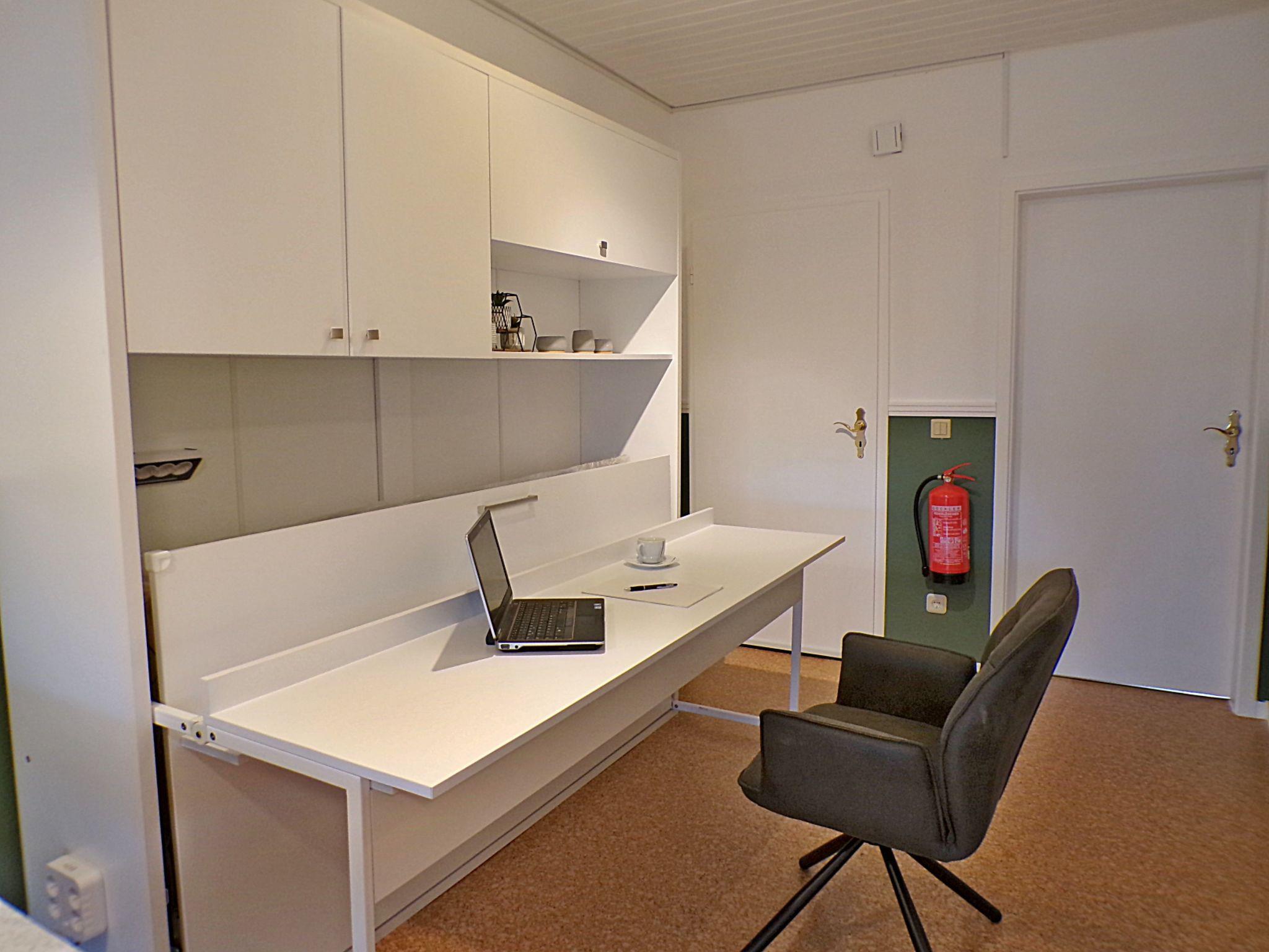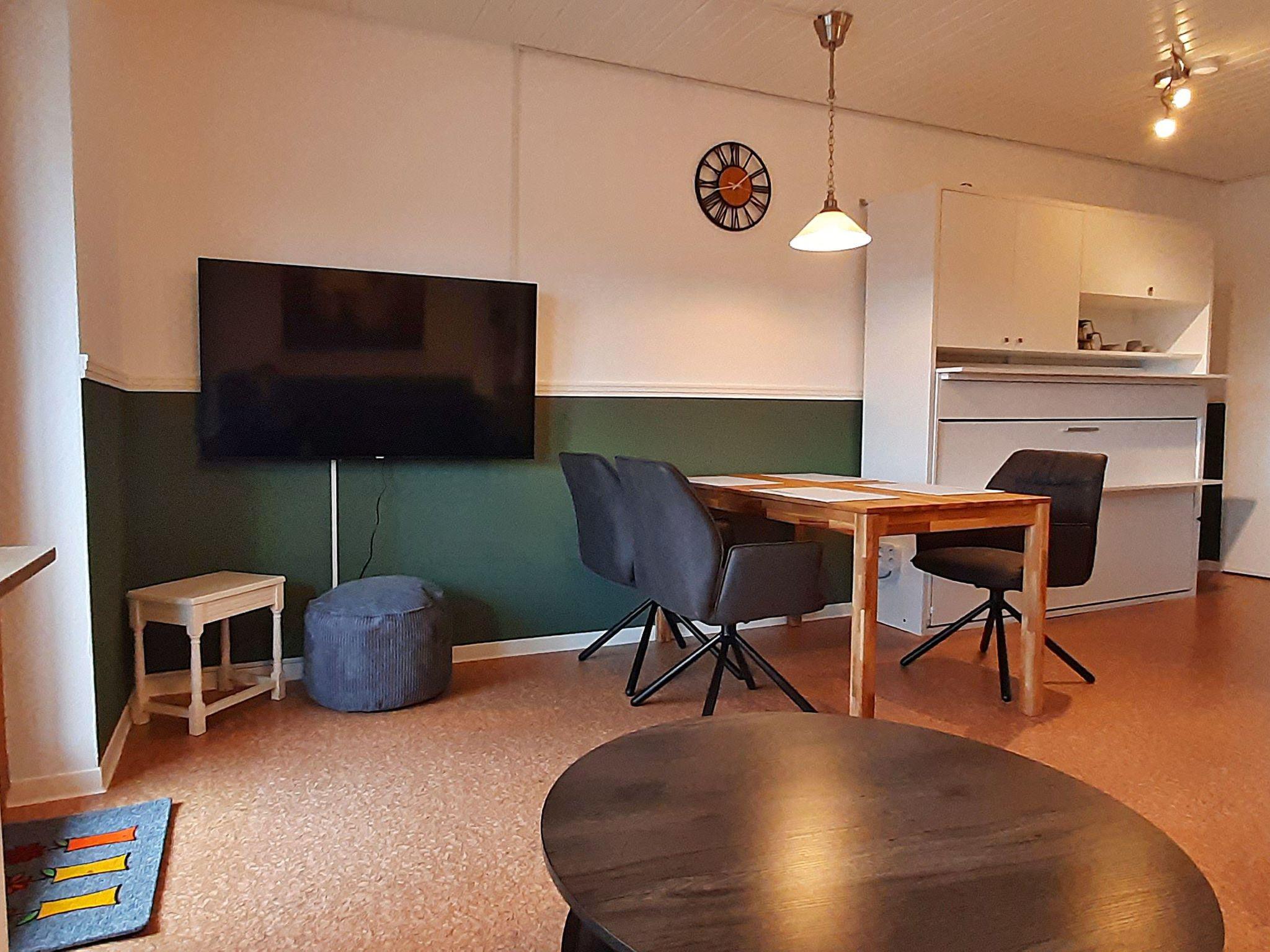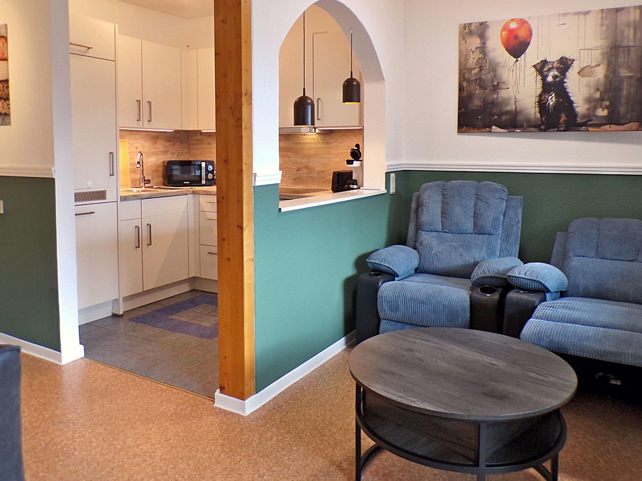Im Inneren erwarten Sie moderner Komfort und Gemütlichkeit in harmonischer Einheit. Der großzügige Wohn- und Essbereich ist mit zwei Sesseln und einem 50" Fernseher (Smart TV) für entspannte Abende ausgestattet. Die Küche grenzt direkt an und lässt mit ihrer Vollausstattung keine Wünsche offen. Für Arbeitsaufgaben oder kreative Auszeiten steht ein Schrankbett mit integriertem Schreibtisch zur Verfügung, der sich mühelos in einen funktionalen Arbeitsbereich verwandelt. Das Badezimmer ist ausgestattet mit einer Toilette, Dusche, einem Fön und einer Waschmaschine. Schlafarrangements bieten ein separates Schlafzimmer mit zwei Einzelbetten sowie ein klappbares Schrankbett im Essbereich.