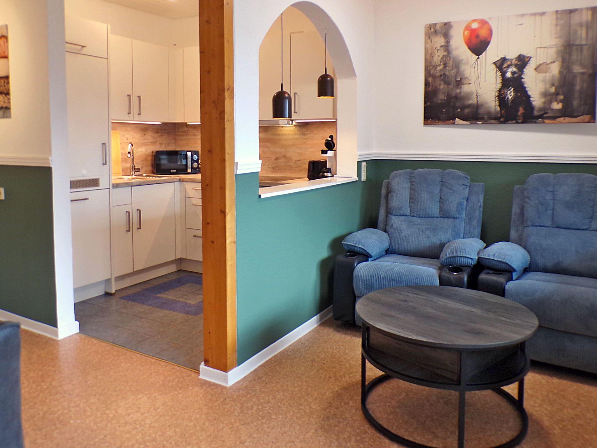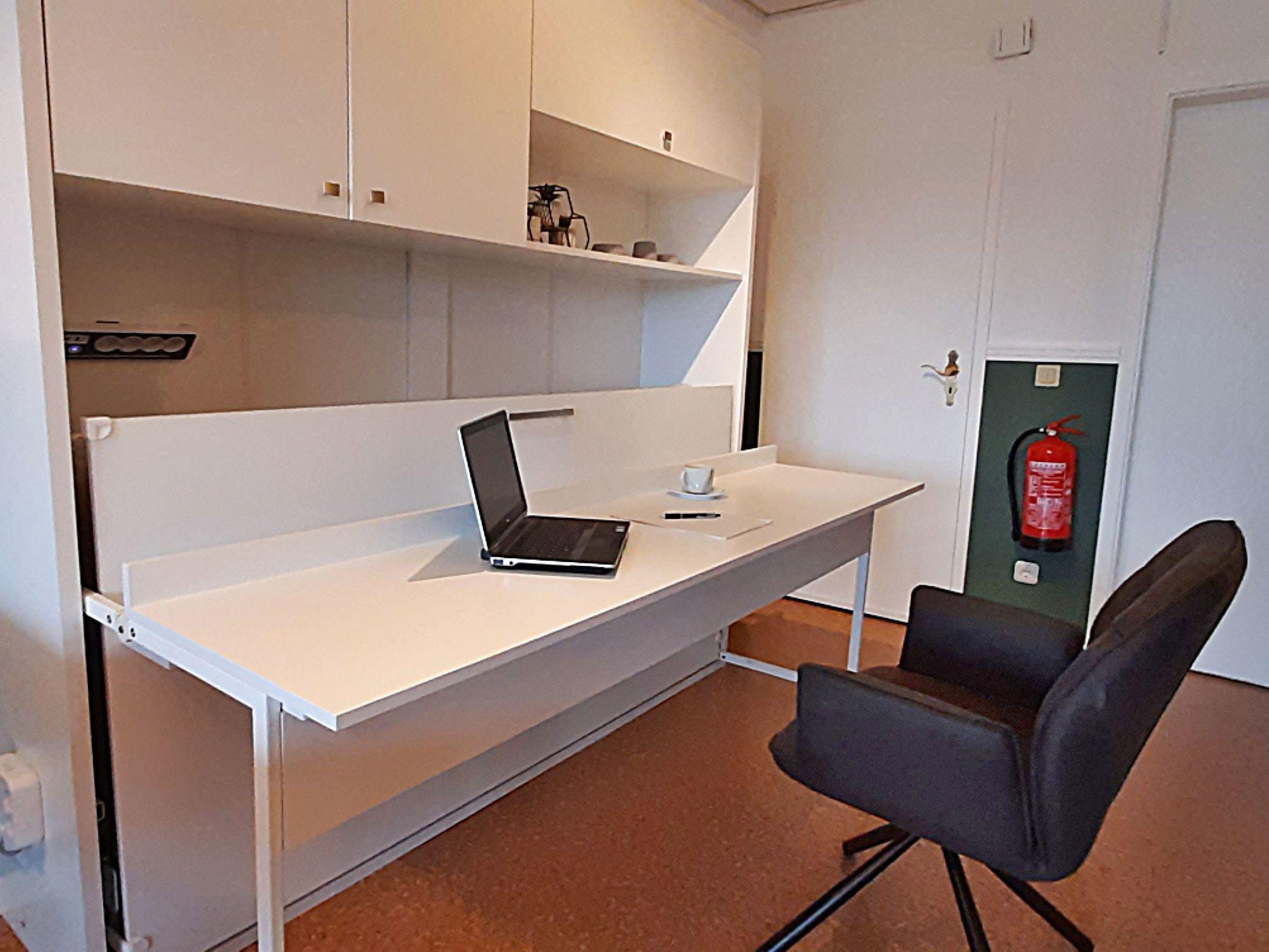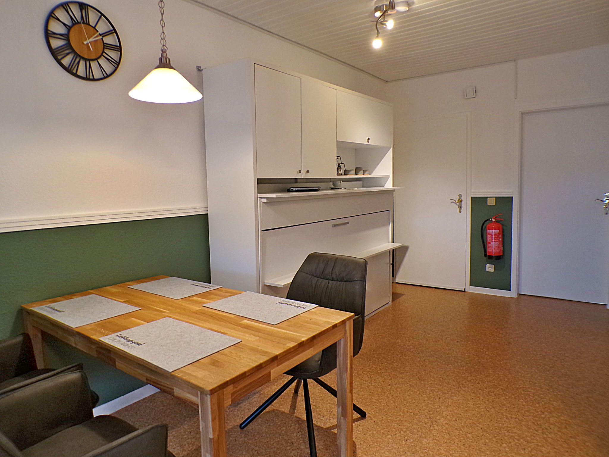 Im Inneren erwarten Sie moderner Komfort und Gemütlichkeit in harmonischer Einheit. Der großzügige Wohn- und Essbereich ist mit zwei Sesseln und einem 50" Fernseher (Smart TV) für entspannte Abende ausgestattet. Die Küche grenzt direkt an und lässt mit ihrer Vollausstattung keine Wünsche offen. Für Arbeitsaufgaben oder kreative Auszeiten steht ein Schrankbett mit integriertem Schreibtisch zur Verfügung, der sich mühelos in einen funktionalen Arbeitsbereich verwandelt. Das Badezimmer ist ausgestattet mit einer Toilette, Dusche, einem Fön und einer Waschmaschine. Schlafarrangements bieten ein separates Schlafzimmer mit zwei Einzelbetten sowie ein klappbares Schrankbett im Essbereich.