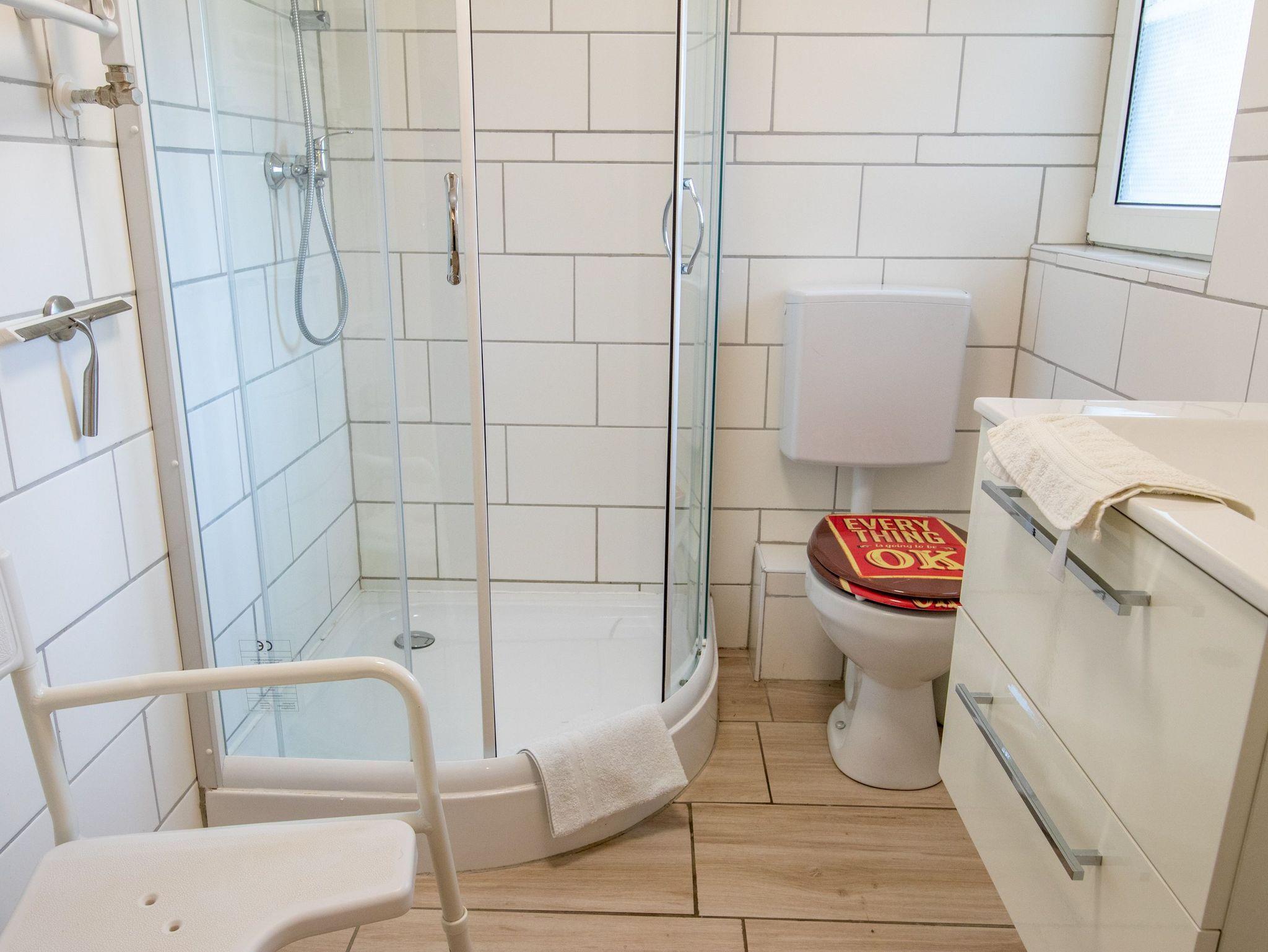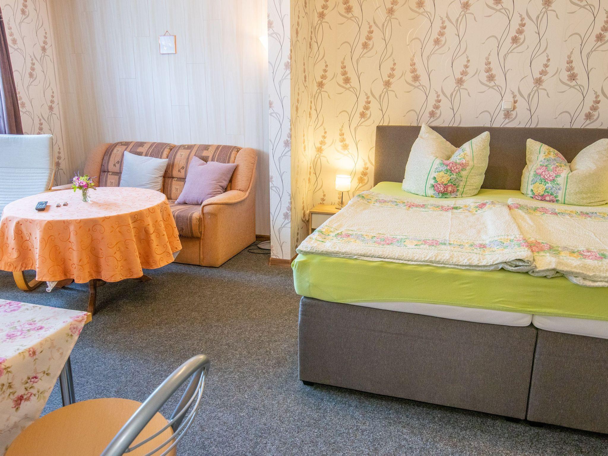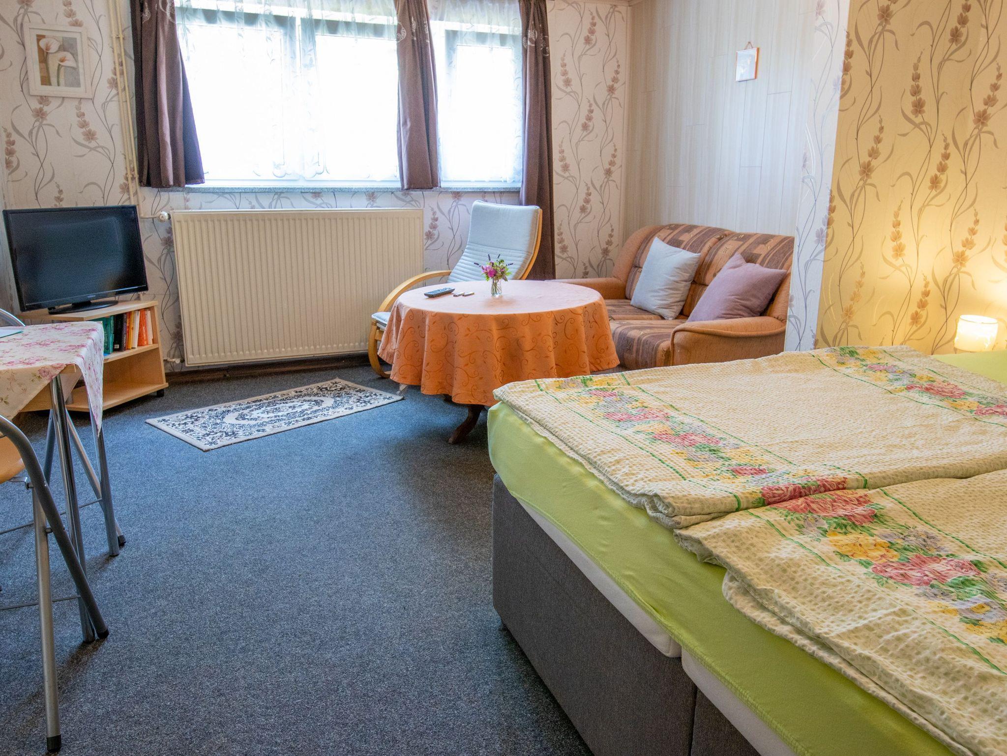 Die Ferienwohnung 3 befindet sich in einem separaten Haus im Bungalowstil auf dem hinteren Teil des Gartengrundstücks und umfasst eine überdachte Terrasse mit einem Tisch und Holzmöbeln. Durch die Eingangstür gelangt man in die Küche, die mit einer Pantry Küche, einem Kühlschrank, Kaffemaschine, Wasserkocher und Toaster ausgestattet ist. Das kombinierte Wohn- und Schlafzimmer eignet sich mit seinem Doppelbett (180x200), dem Schlafsofa, einem kleinen Ess-Bereich und dem Flachbild- TV für 2 Personen. Im Badezimmer gibt es neben einer Runddusche noch ein WC und Waschbecken. Die Rasenflächen können als Liegewiese genutzt werden. Auf Wunsch kann gern gegrillt weden.