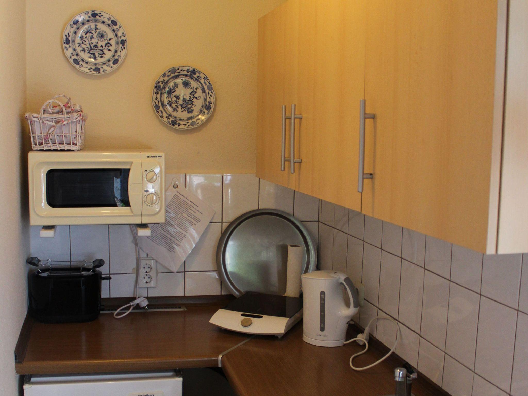 Dieses ebenerdige Ferienzimmer im Bungalow bietet eine kompakte, komfortable Ausstattung für einen entspannten Aufenthalt. Das 1,80 m breite Doppelbett kann bei Bedarf auch als zwei Einzelbetten gestellt werden - praktisch, wenn Sie flexibel schlafen möchten. Eine kleine Küchenzeile mit Herdplatten, Kühlschrank, Mikrowelle, Toaster und Wasserkocher ermöglicht eine unkomplizierte Selbstversorgung, zum Beispiel für Frühstück oder kleine Mahlzeiten.