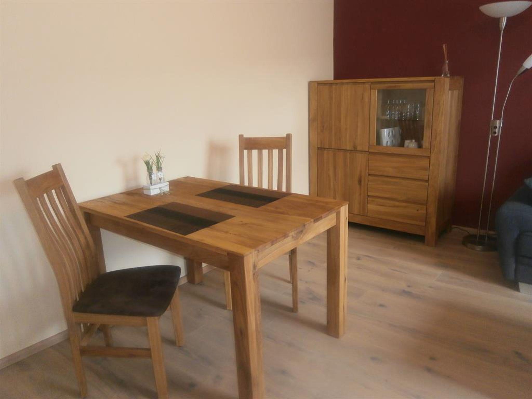 Die Ferienwohnung „Uff`m Schneeberg (45 m²) verfügt über einen Schlafraum mit Doppelbett, einen Wohnraum mit Essecke, ein Bad mit Dusche und WC und eine vollständig eingerichtete Küche. Alle Räume sind liebevoll mit massiven Echtholzmöbeln eingerichtet.