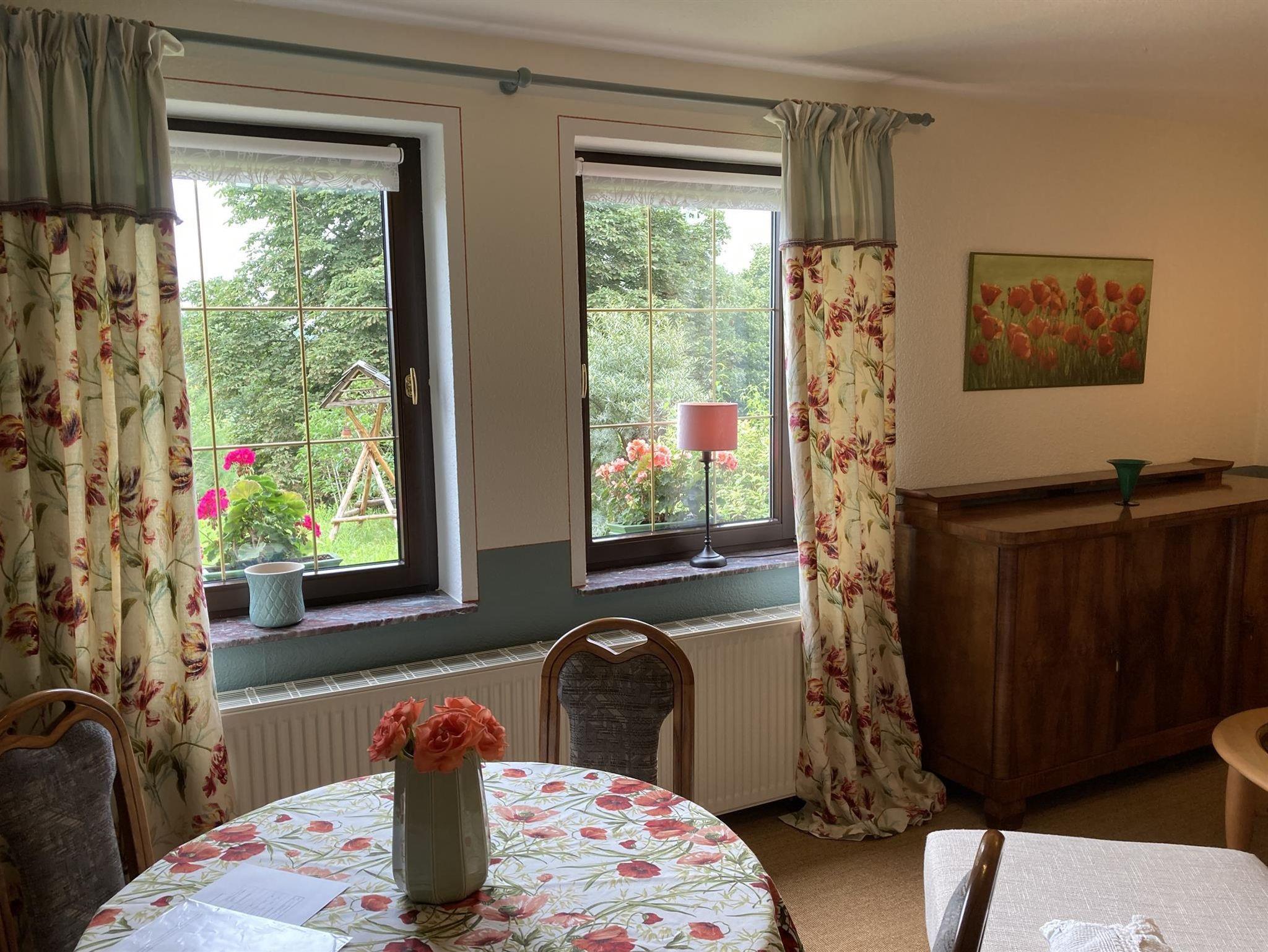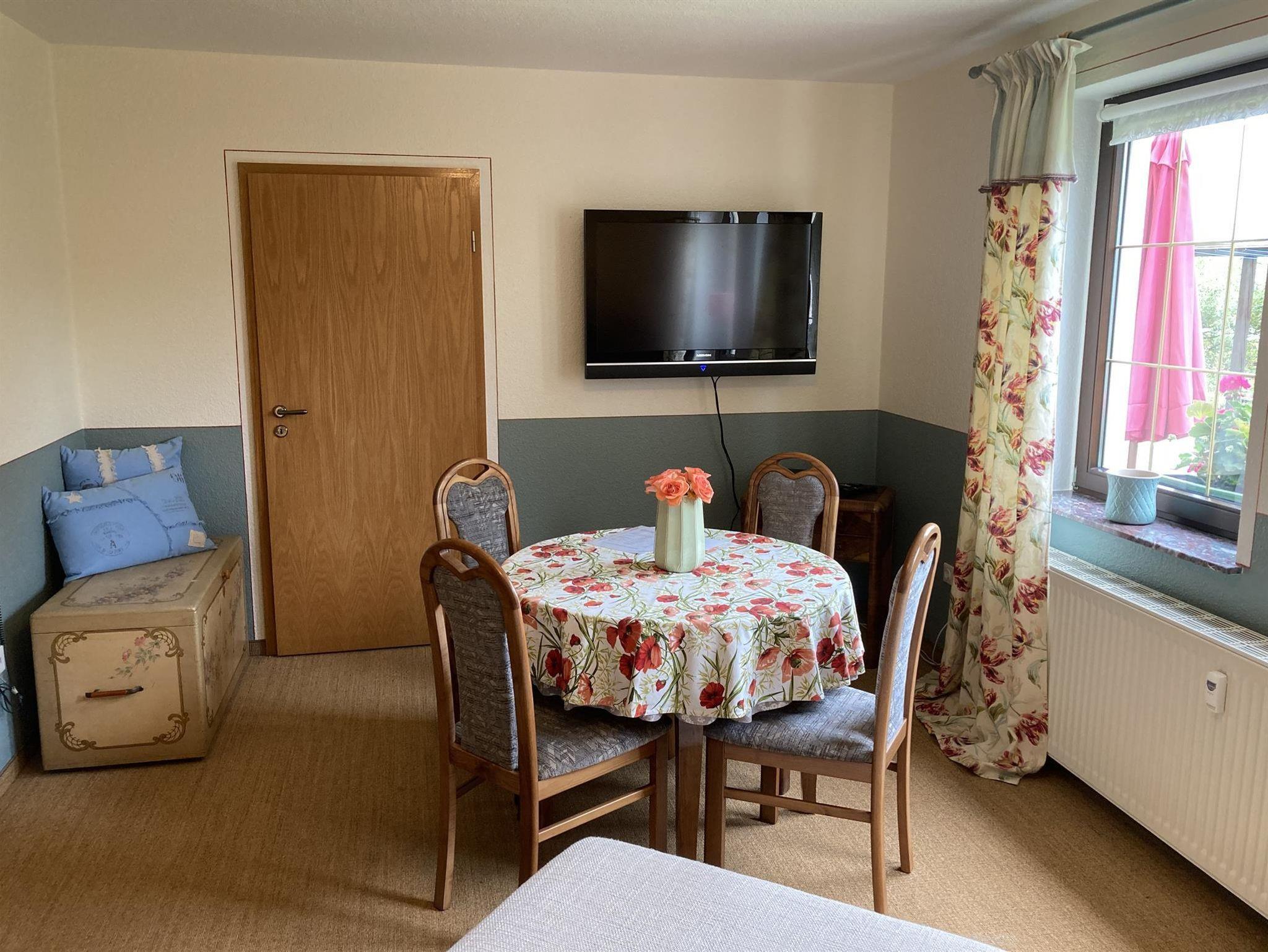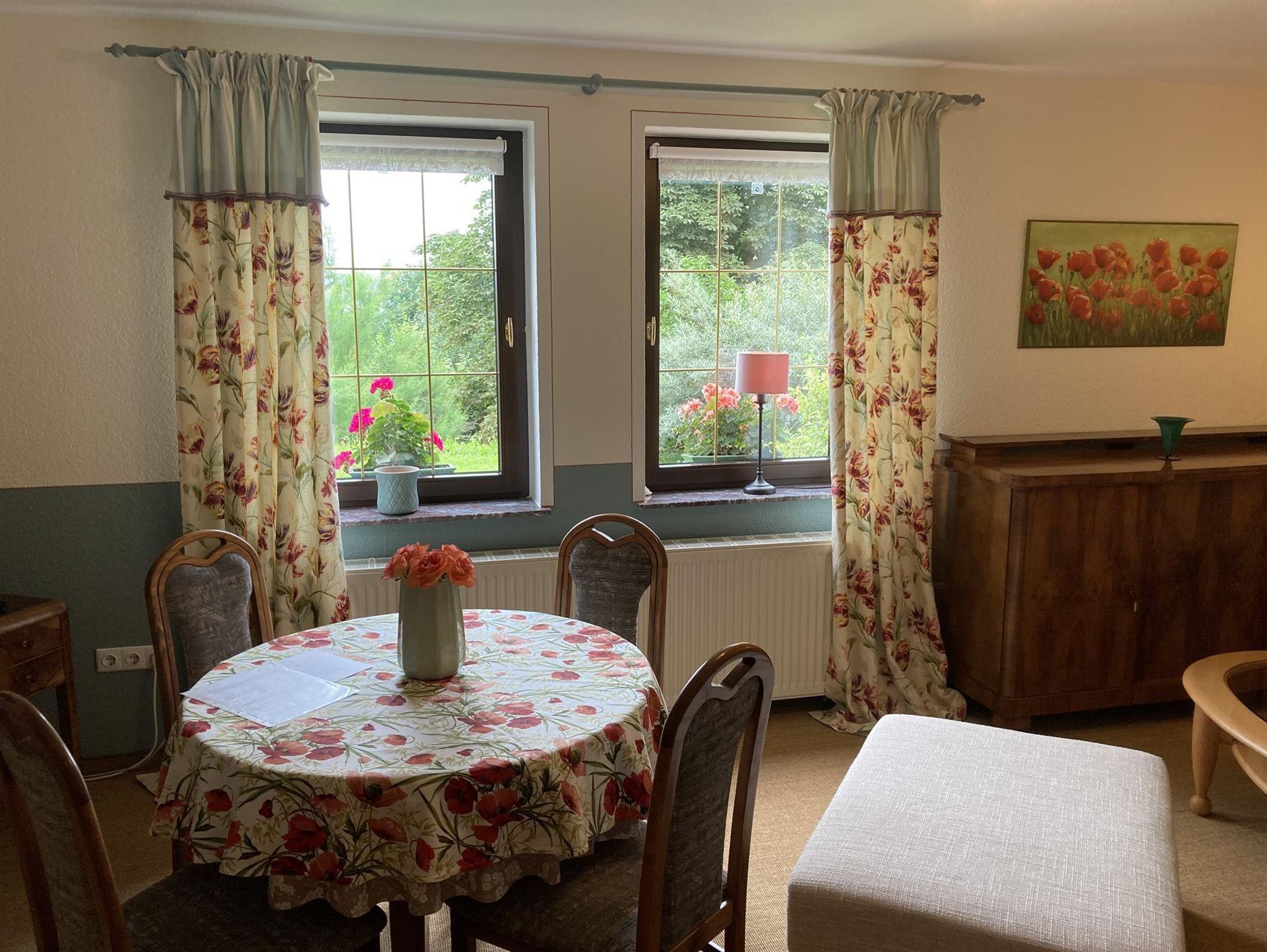 Ferienwohnung (Parterre) für max. 4 Pers. mit Wohnzimmer (TV, Esstisch, Schlafsofa/Aufbettung 2 Pers.), Schlafzimmer (Doppelbett), kleiner Küche (komplett ausgestattet, Esstisch) und Bad (Du/WC, Föhn). Der Sitzplatz im Garten kann genutzt werden. Im Garten Spielhaus und Sandkasten für Kinder vorhanden. Haustiere möglich. Frühstück auf Anfrage möglich.