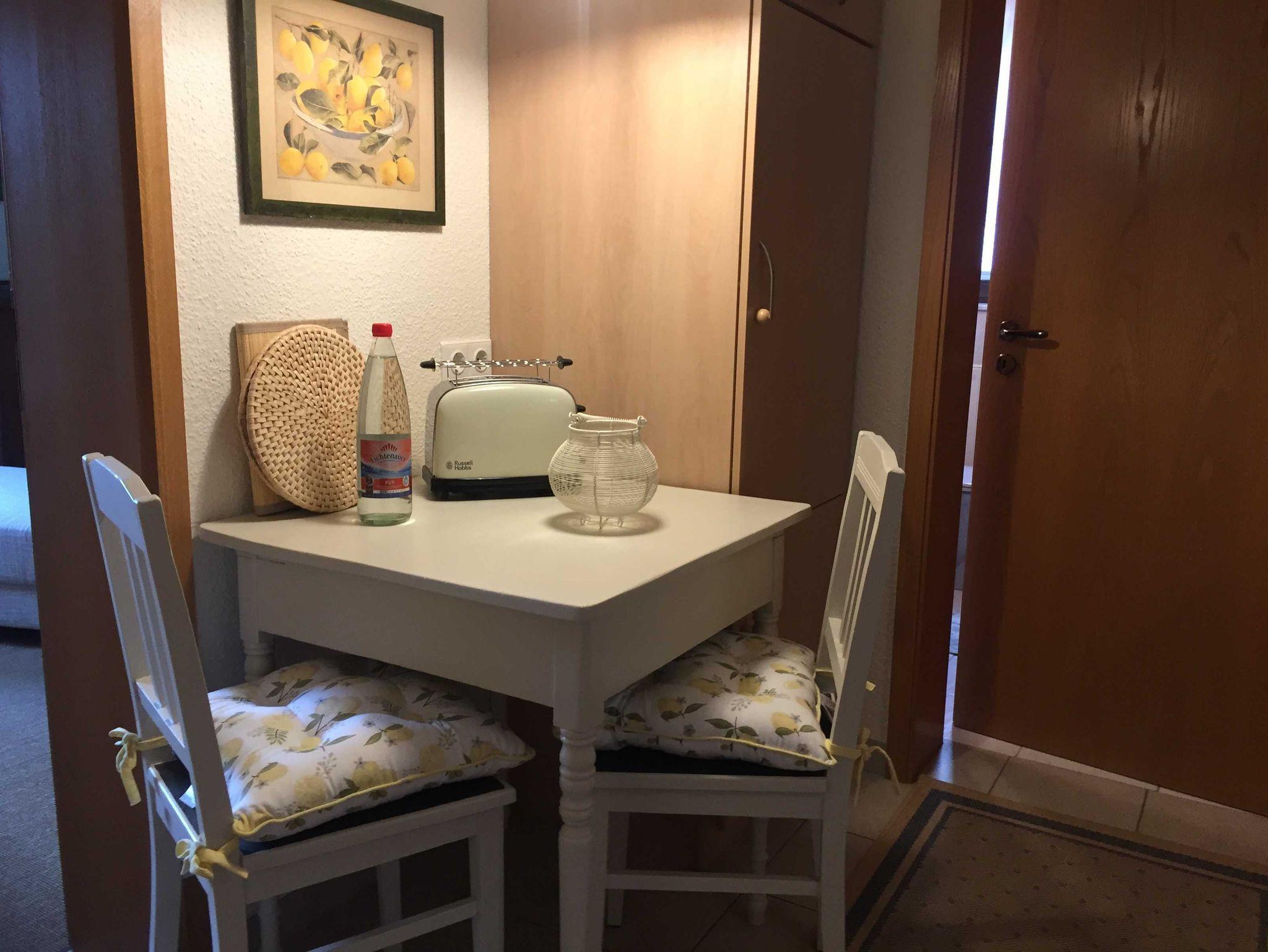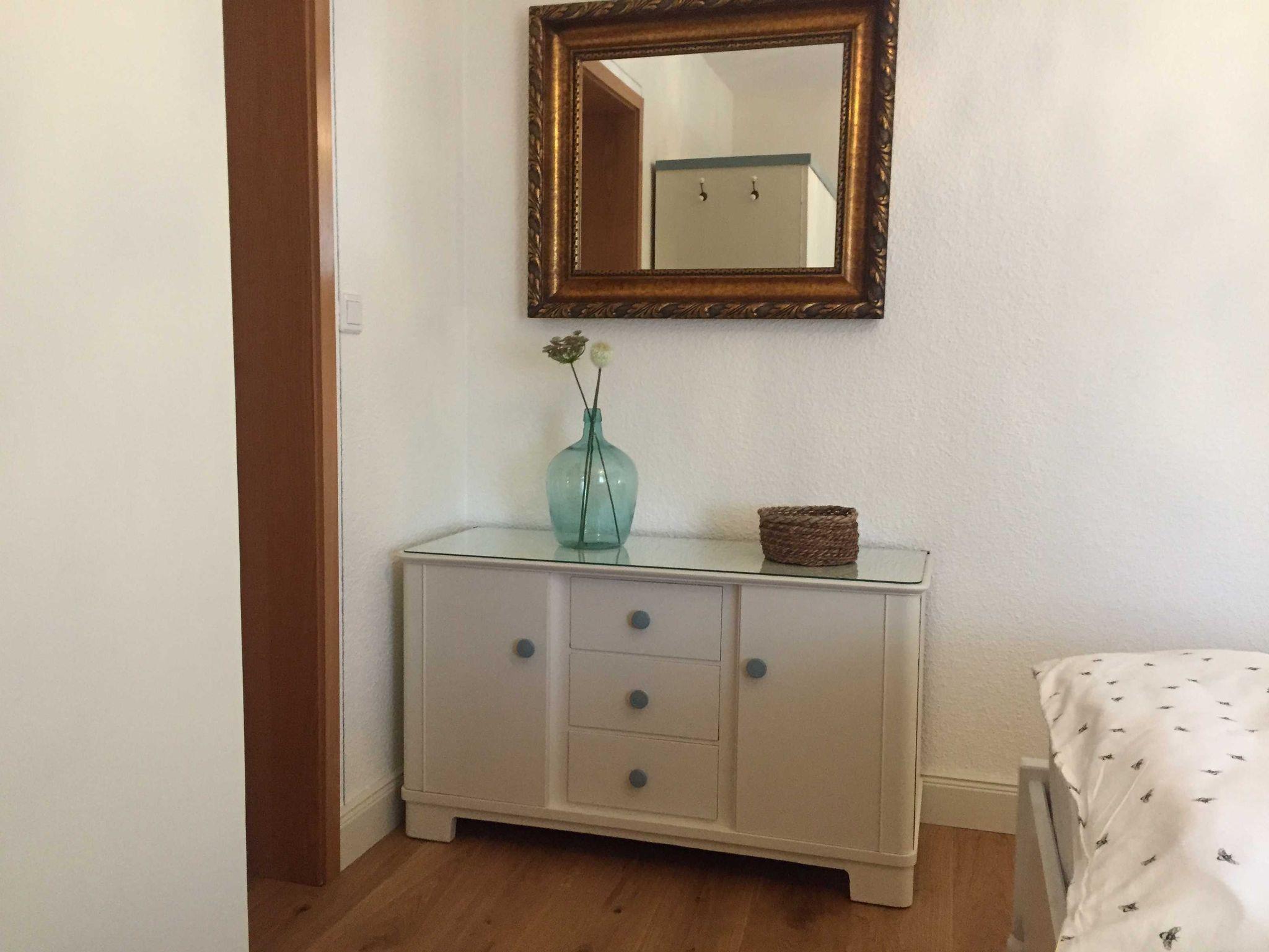 • Die Ferienwohnung besteht aus einem Schlafzimmer, einem Wohnzimmer, einer kleinen Küche und einem Bad mit Dusche und WC. Das Schlafzimmer hat ein großes Doppelbett mit zwei Nachttischchen und einem dreitürigen Kleiderschrank sowie einer Kommode. Das Wohnzimmer ist ausgestattet mit einem Schlafsofa, einer Anrichte, einer Vitrine und einem runden Eßtisch aus schlichtem Stilholzmöbeln sowe einem großer Flachbildschirm. In der Küchenzeile ist ein Elektroherd mit Backröhre, ein Geschirrspühler und ein Kühlschrank integriert. Ein Wasserkocher, Kaffeemaschine und ein Toaster sind vorhanden. Ein kleiner Tisch mit zwei Stühlen findet ebenfalls dort Platz. Im Badezimmer mit Dusche, Waschbecken und WC ist ein Haarföhn, ein Kosmetikspiegel und ein Abfalleimer vorhanden. Handtücher, Geschirrtücher und Handseife liegen für Sie bereit.