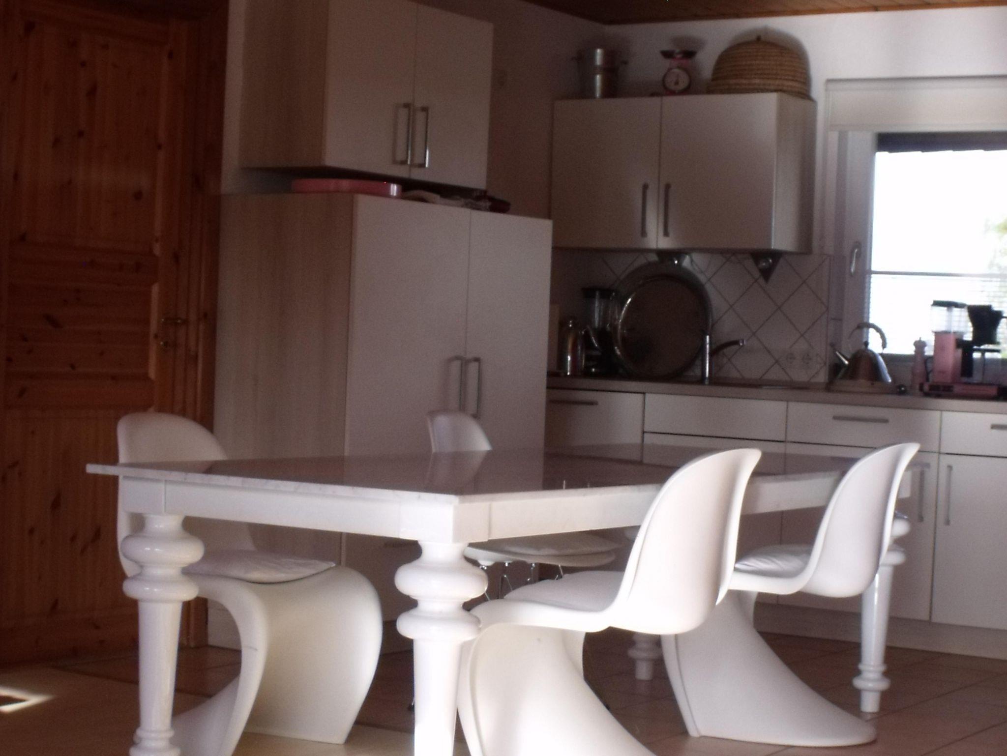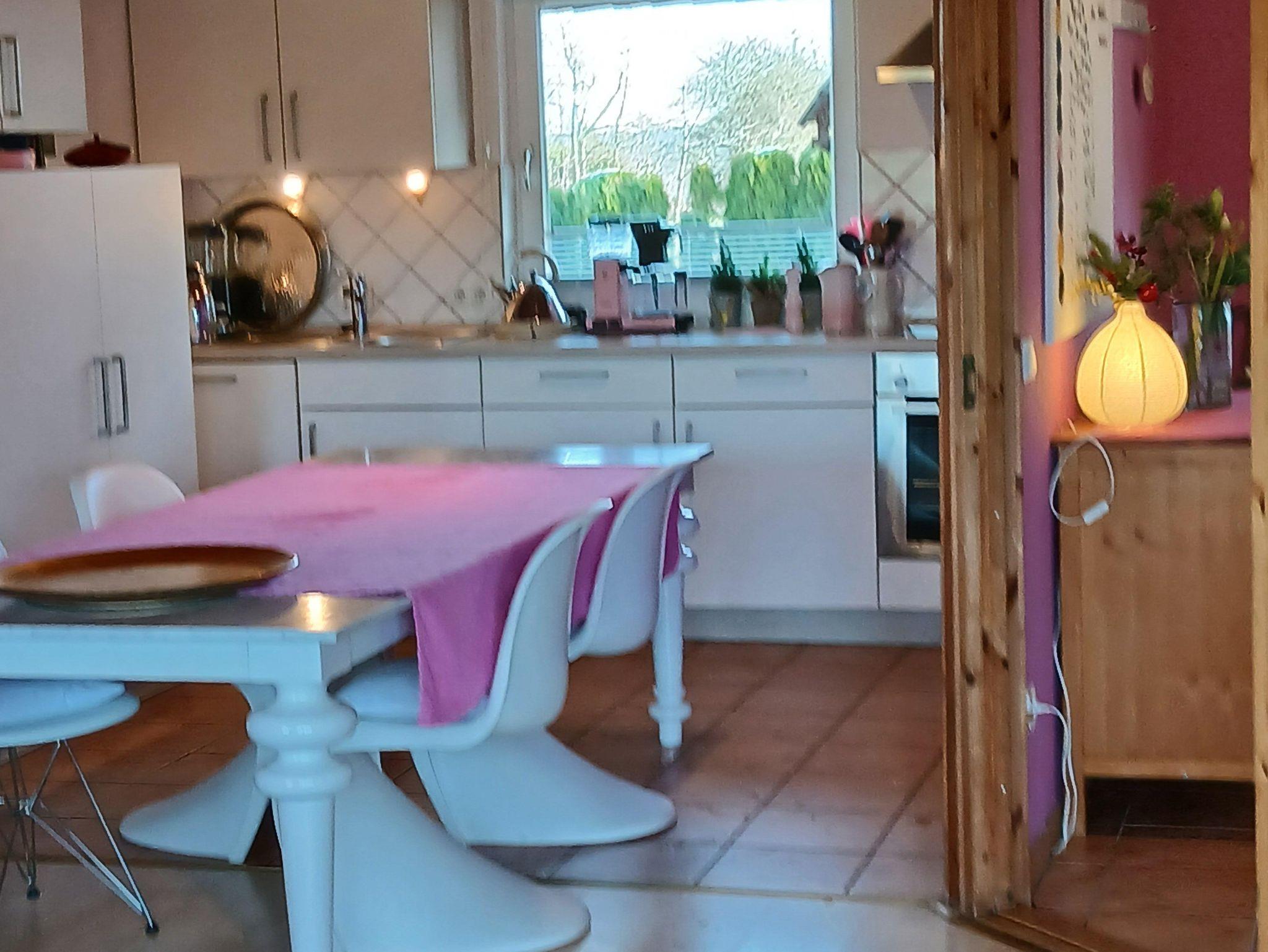 Voll ausgestattete Einbauküche mit Herd (Ceranfeld) und Backofen, Abzugshaube, Kühlschrank mit Gefrierfach, Gefrierschrank, Mikrowelle, Geschirrspülmaschine, Tischwäsche, Kochschürze, Filterkaffeemaschine, Wasserkocher, French Press, Heissluftfriteuse, Toaster, Brotschneidemaschine, Brotbackautomat, Mixer, Saftpresse, Backutensilien, hochwertigem Porzellan und Gläsern, ausreichend Pfannen und Töpfen.