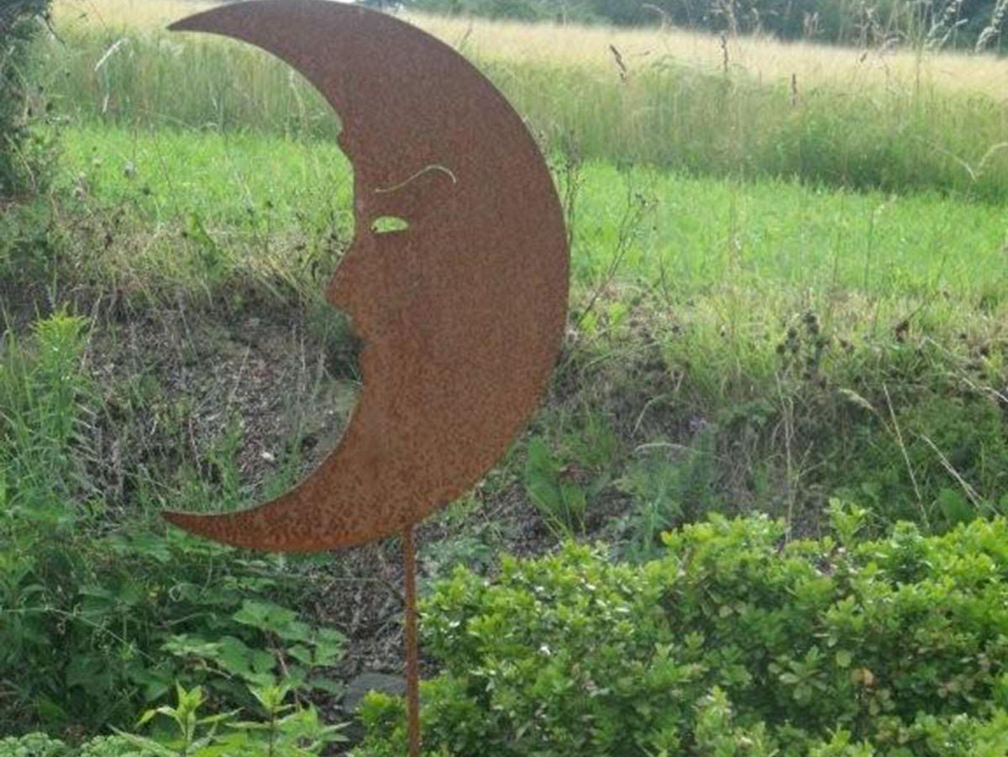 Garten nicht eingezäunt, mit vielen Stauden und Blumen mit Gartenmöbeln, Sonnenschirm und Holzkohlegrill.
