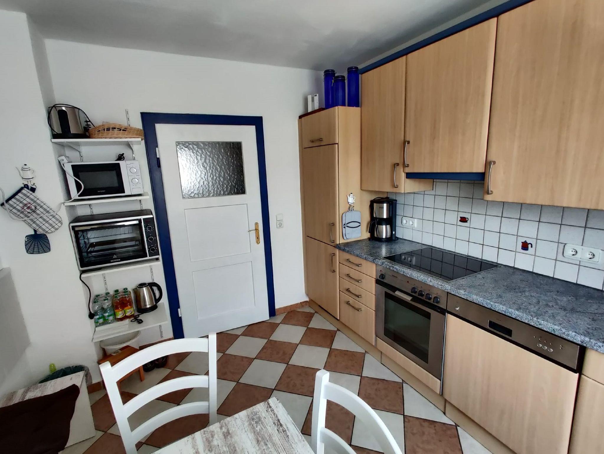 Die Einrichtung besteht aus einer kompletten Küchenzeile mit Herd, Ceranfeld, Spülmaschine und Kühlschrank mit Gefrierfach. Sämtliche Küchenutensilien sind vorhanden. Außerdem befindet sich ein Minibackofen für Ihre Brötchen oder die schnelle Pizza, ein Toaster, Eierkochen, eine Mikrowelle, ein Wasserkocher und eine Kaffeemaschine in der Küche.