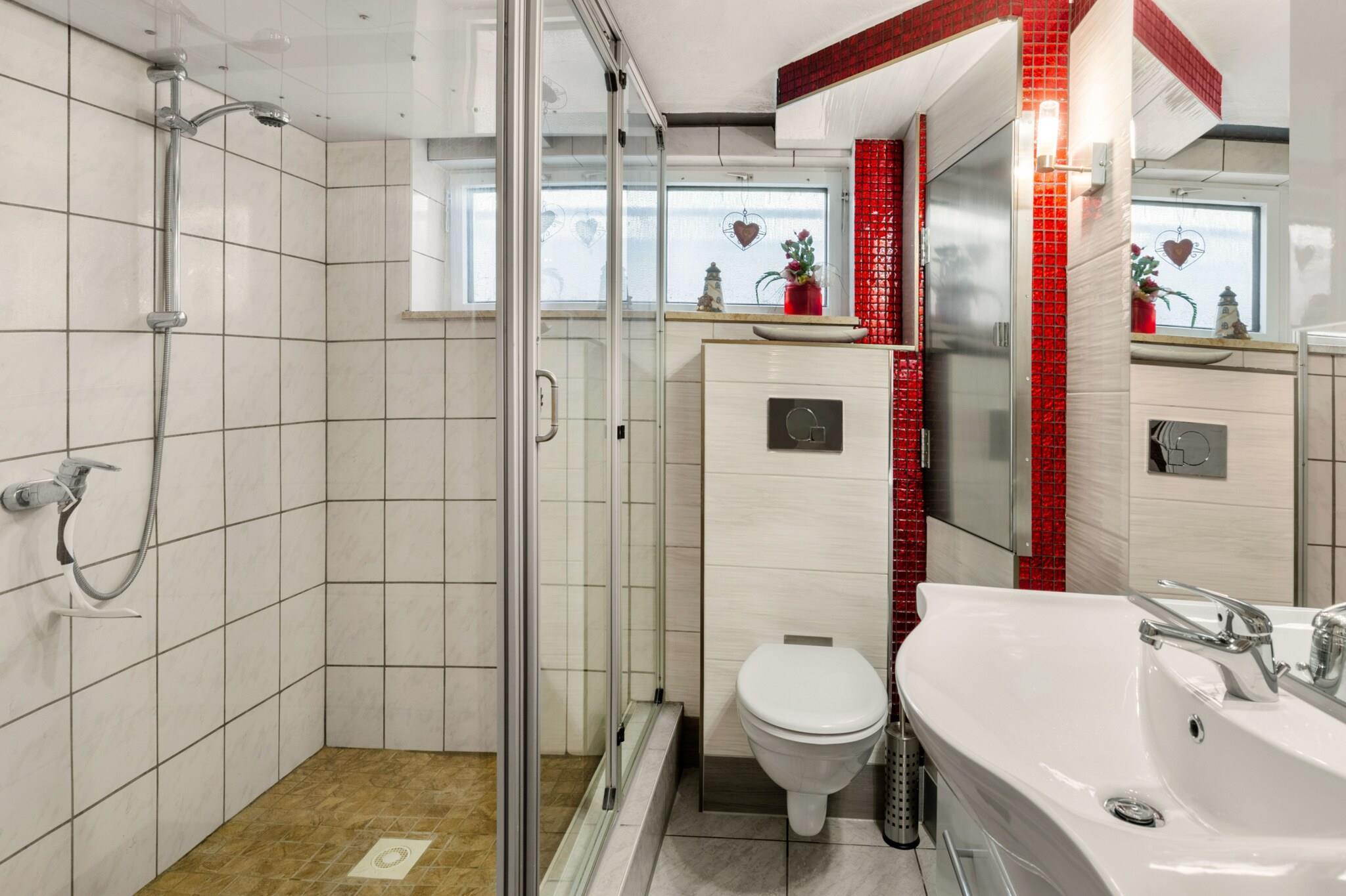 Souterrain: (Eingang(von außen erreichbar), Küche(Wasserkocher, Toaster, Kochherd(4 Kochplatten, Ceranfeld), Dunstabzugshaube, Kaffeemaschine, Backofen, Mikrowelle, Spülmaschine, Kühlschrank(+ Gefrierfach)), Wohn-/Schlafzimmer(Doppelschlafcouch, TV(Flatscreen), Esstisch(4 Personen), Sitzecke, Radio), Schlafzimmer(Doppelbett, Kinderbett), Badezimmer(Dusche, Waschbecken, Toilette), Flur, Heizung) Parkplatz, Hochstuhl