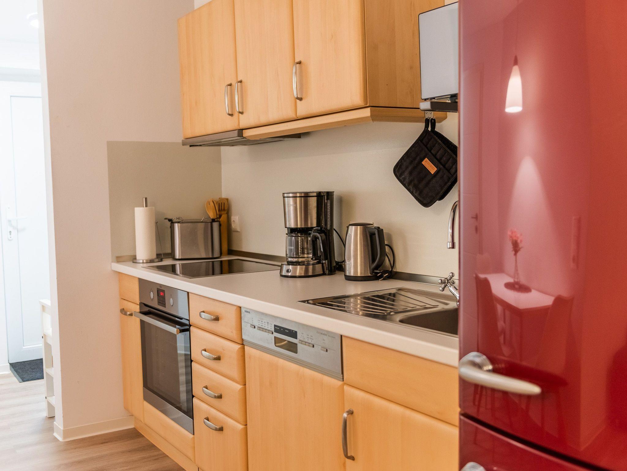 Neben einer gut ausgestatteten Einbauküche steht ein Backofen mit Ceranfeld, Kaffeemaschine, Toaster, Wasserkocher sowie ein Kühlschrank zur Verfügung.