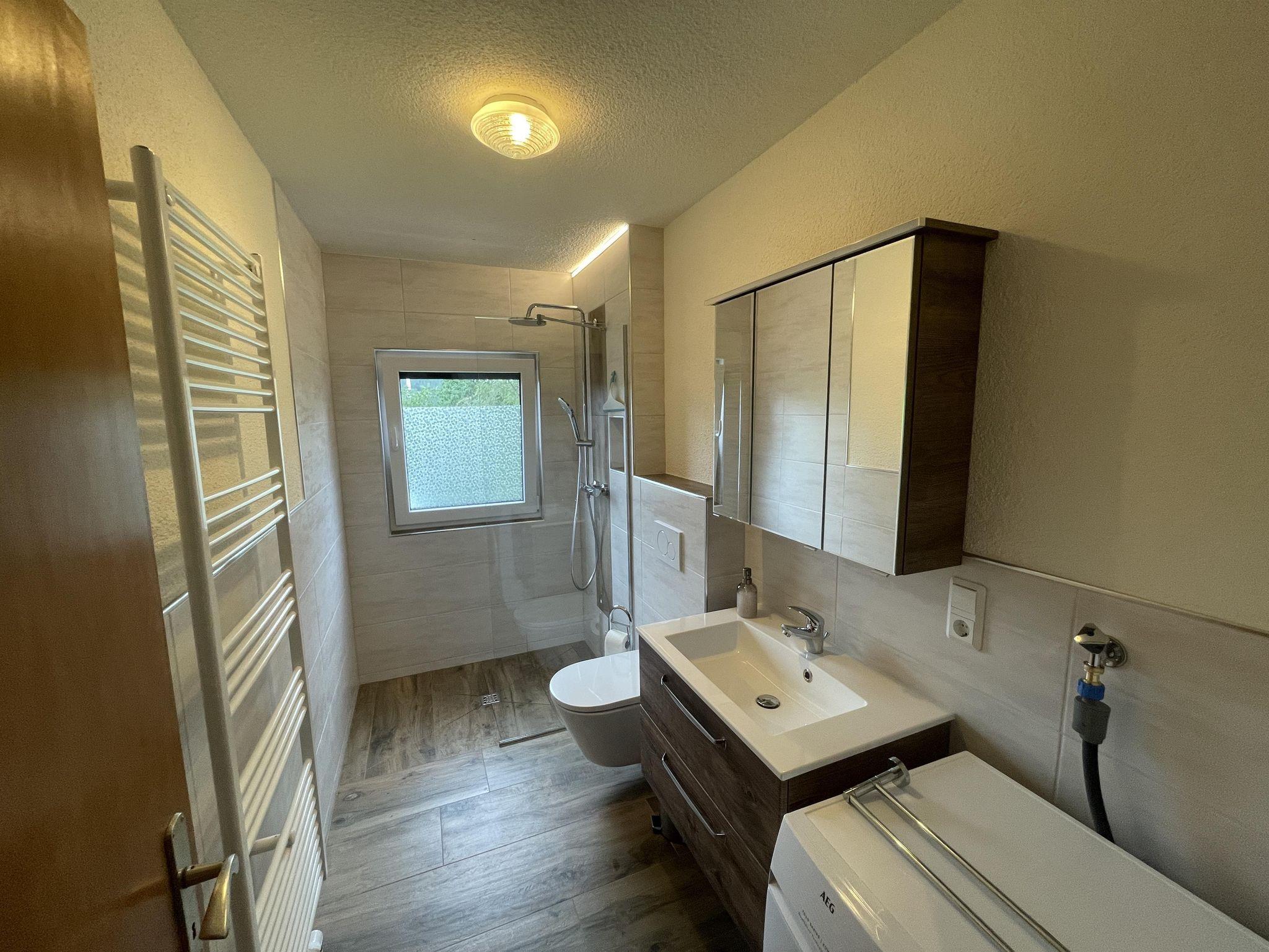 Im Bad befindet sich neben einer ebenen Duschkabine, WC und Waschtischkombination auch ein Waschtrockner.