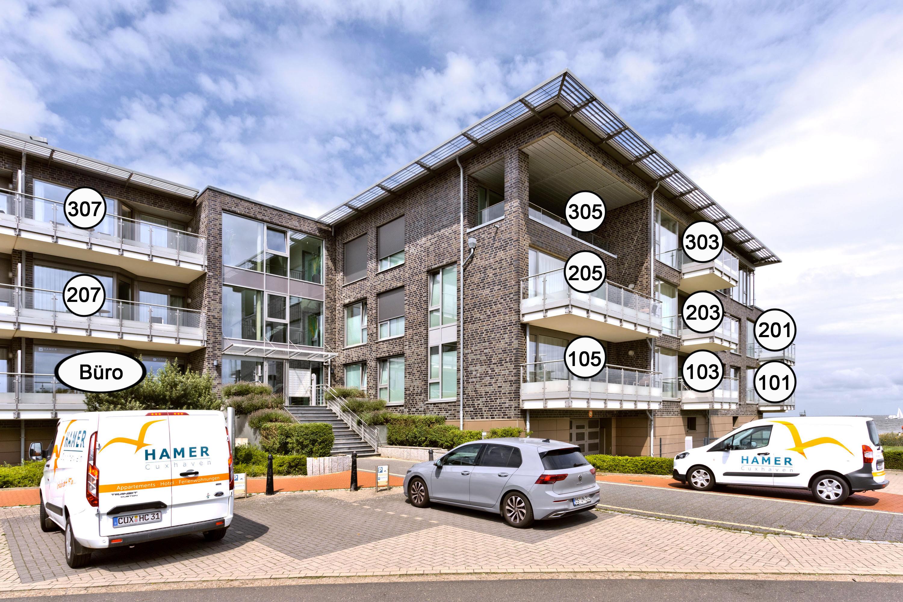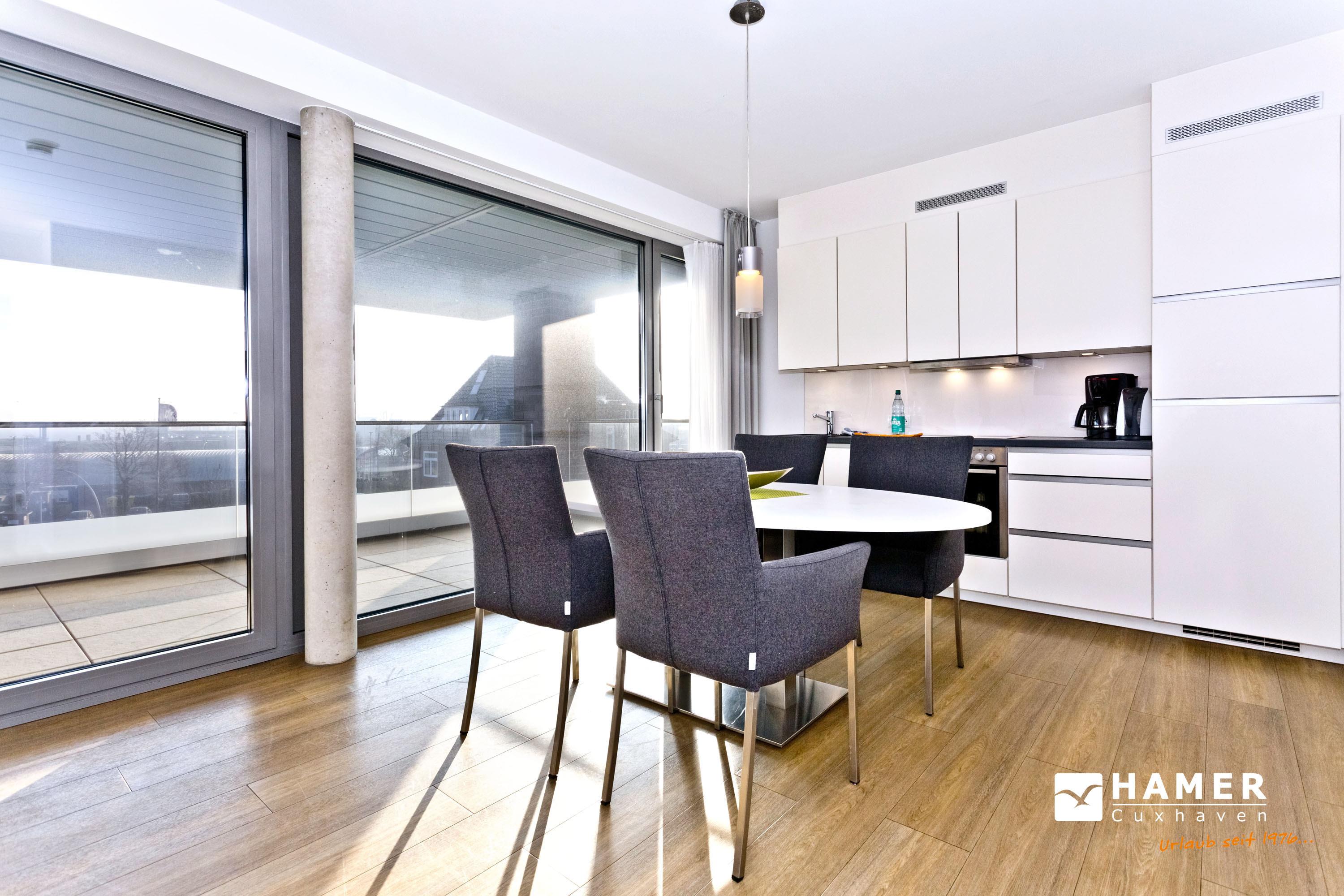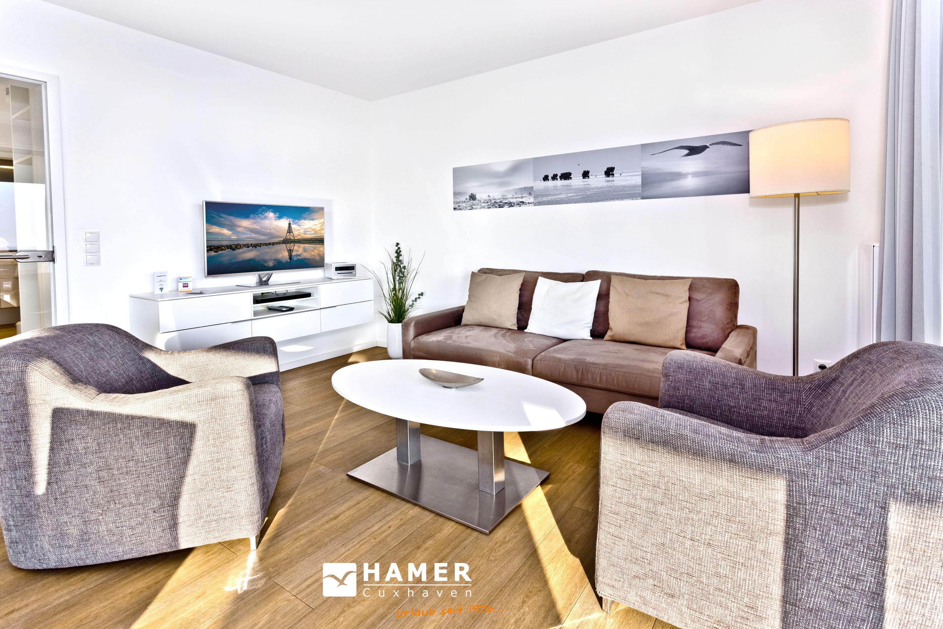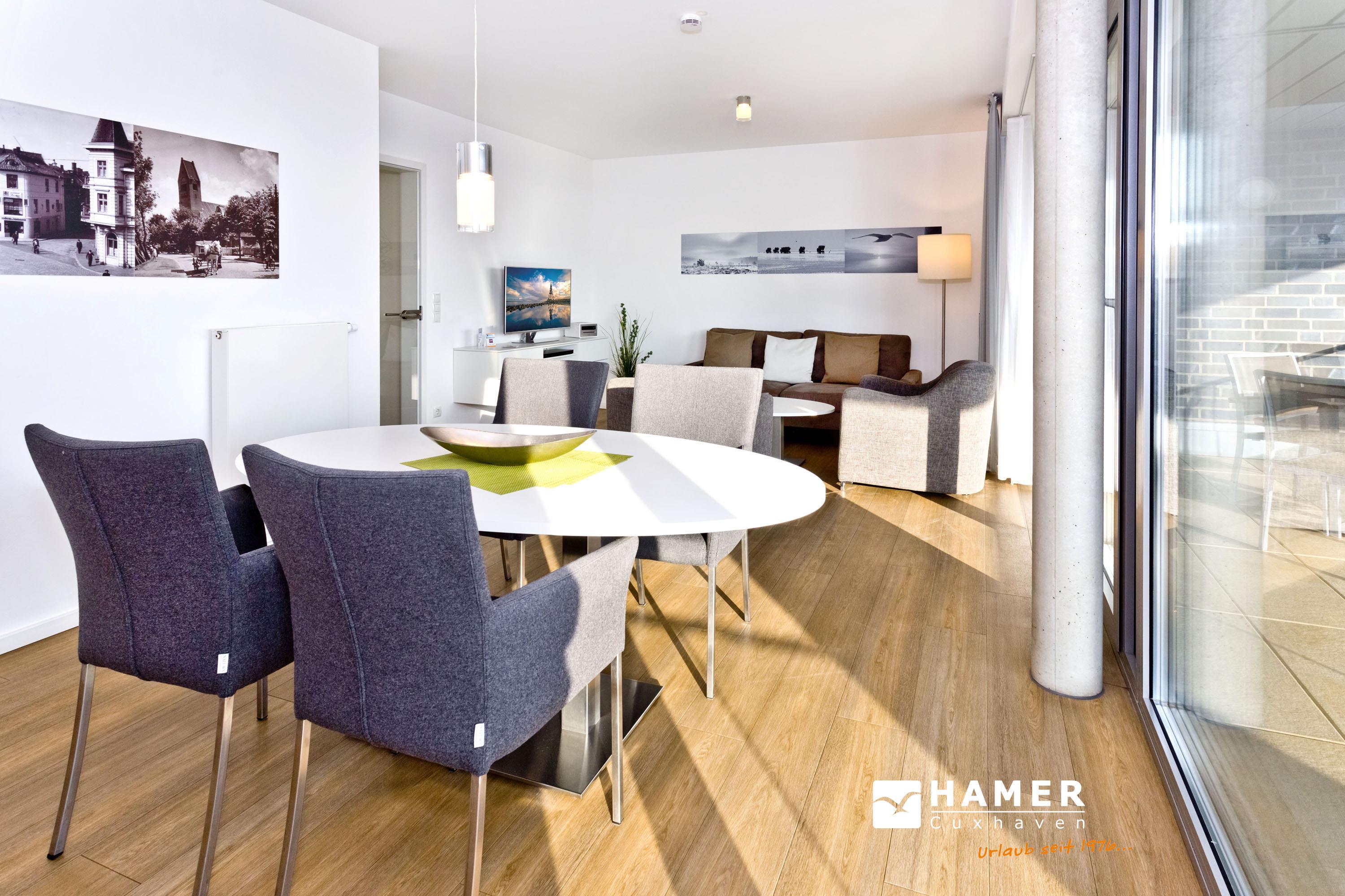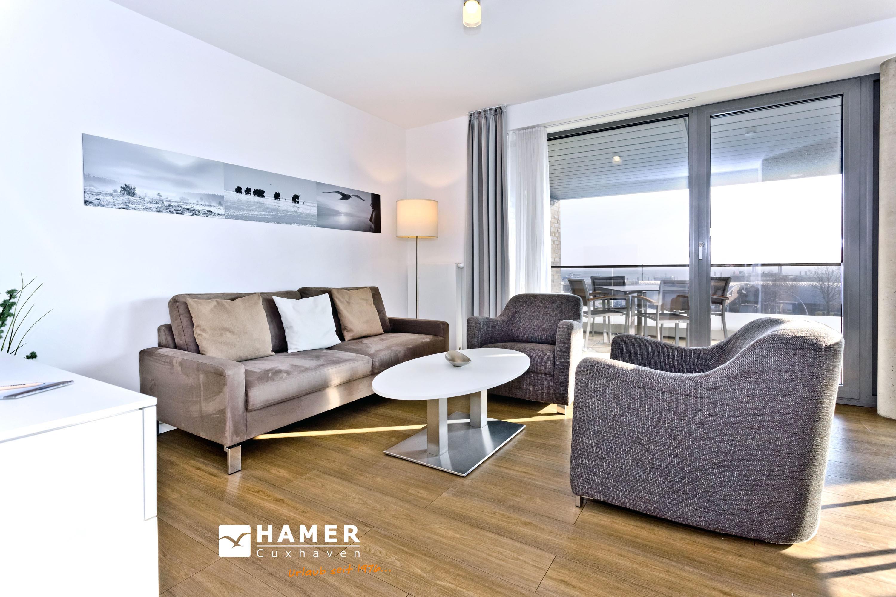 Direkter Blick auf die "Alte Liebe"! Erleben Sie hier einen der schönsten Ausblicke Cuxhavens. Tolle 3 Zi. Luxus-Wohnung über 74m², 3. Etage, großzügiges Wohnzimmer mit großem Balkon (süd/ost), vollständig ausgestattete Küchenzeile, 2 Schlafzimmer mit Doppelbetten und Außenjalousien, 2xTV, DVD, Radio/CD, kostenloses W-Lan-Internet, 1xDu/WC, 1x Gäste-WC, reservierter Stellplatz in der Tiefgarage, freie Saunanutzung, Nichtraucher, keine Haustiere.