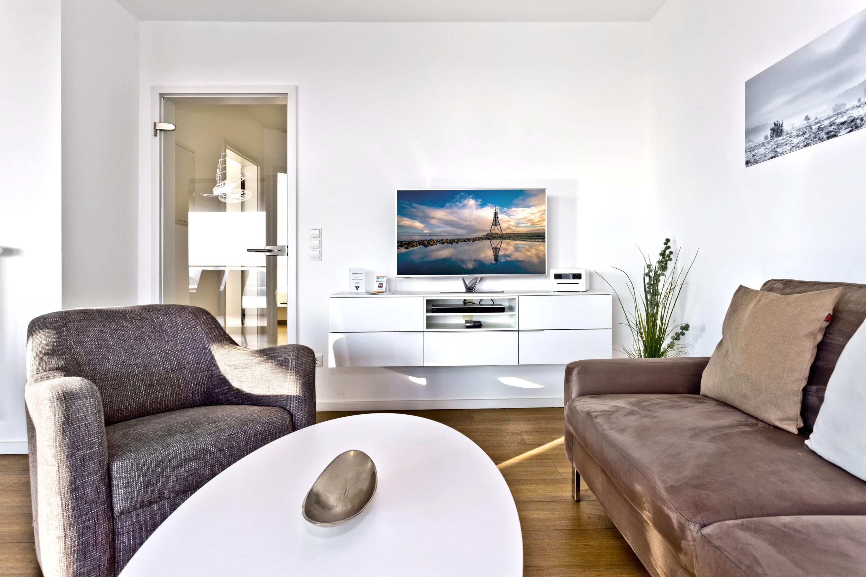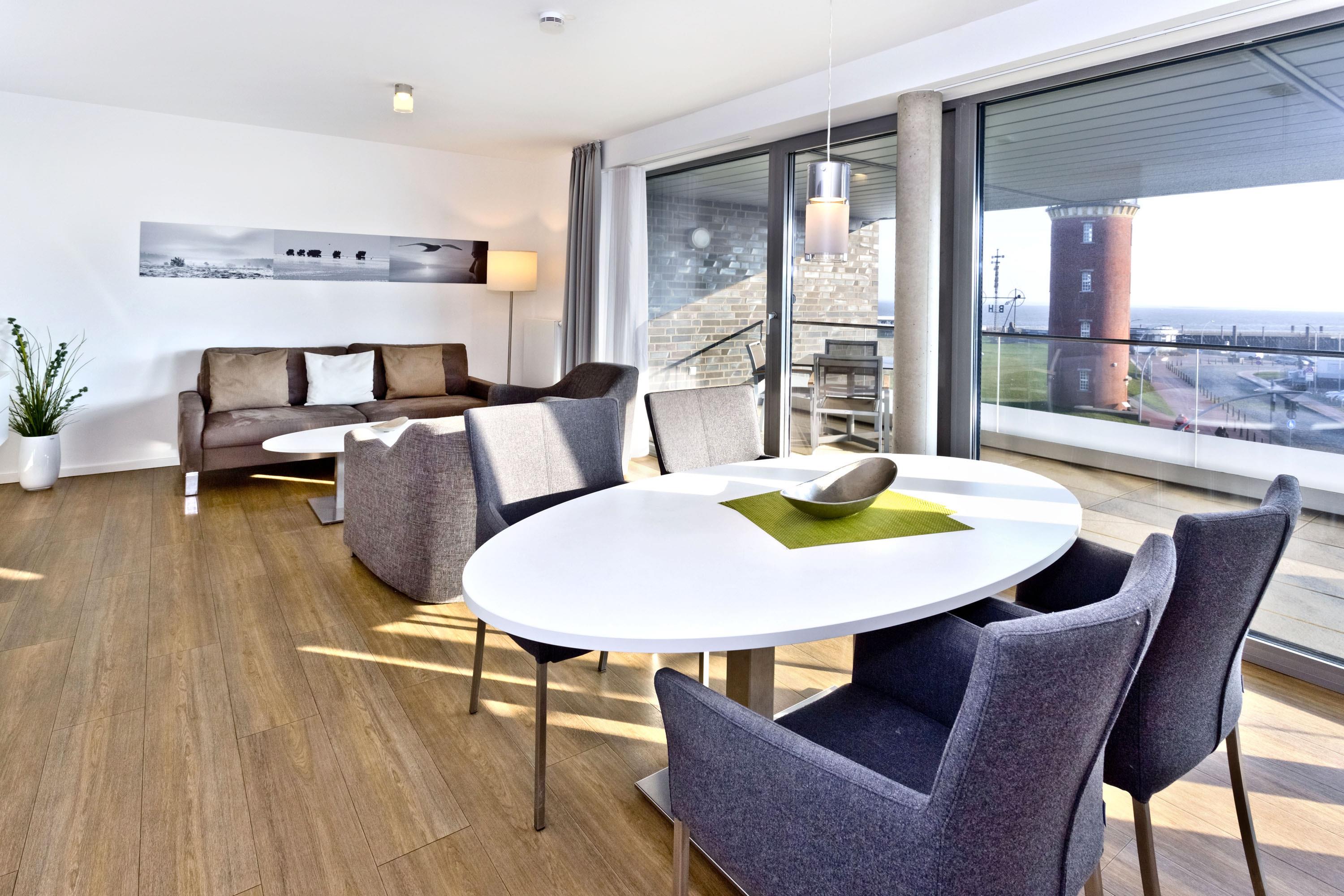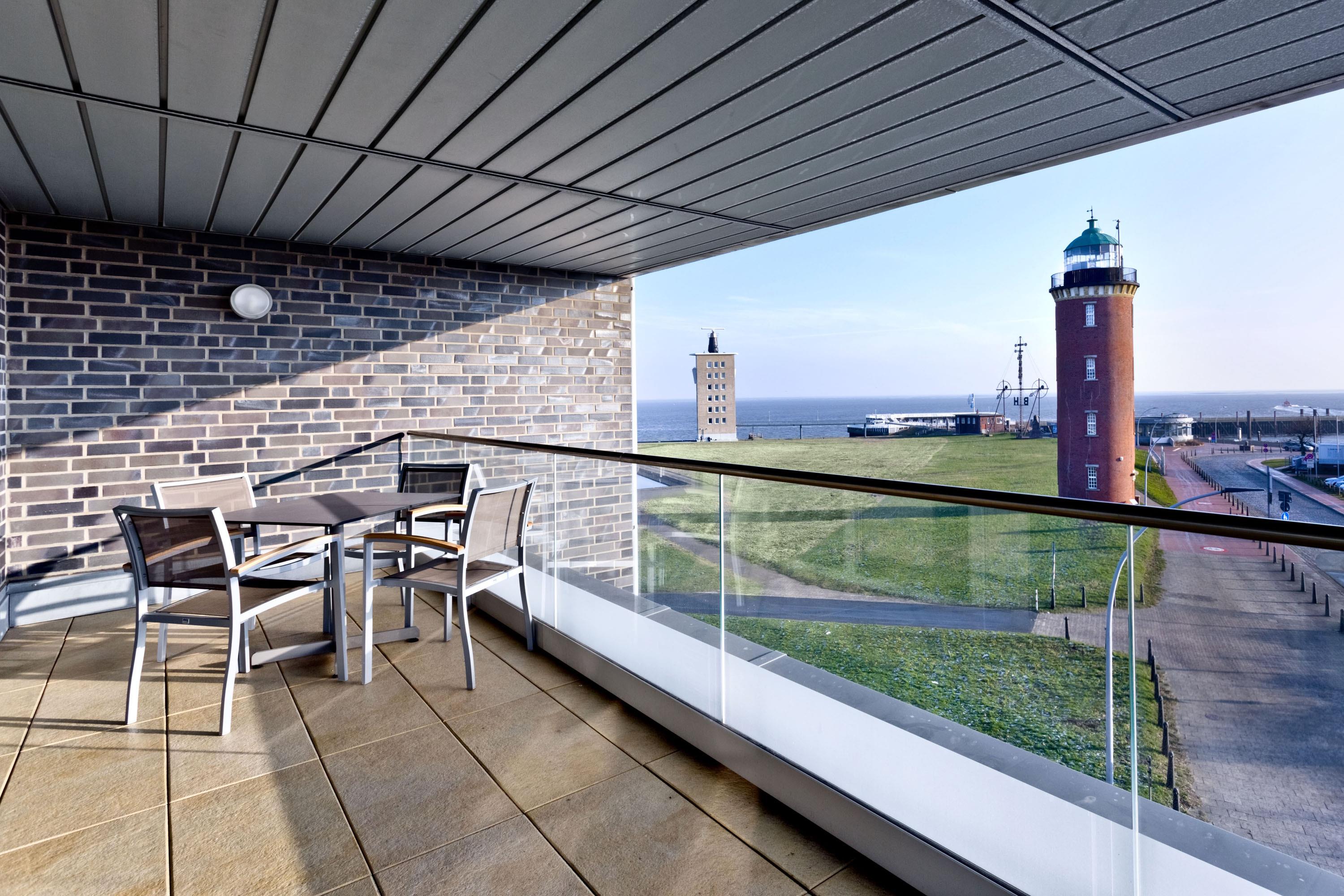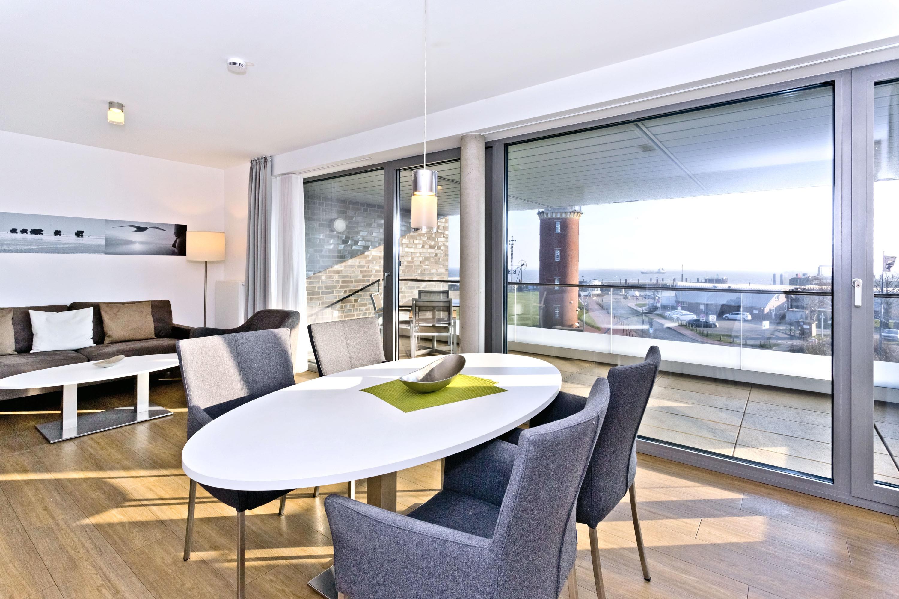 Luxuriöse 3-Zimmer-Ferienwohnung mit Meerblick und Balkon in Grimmershörn, ideal für erholsame Tage an der Nordsee.