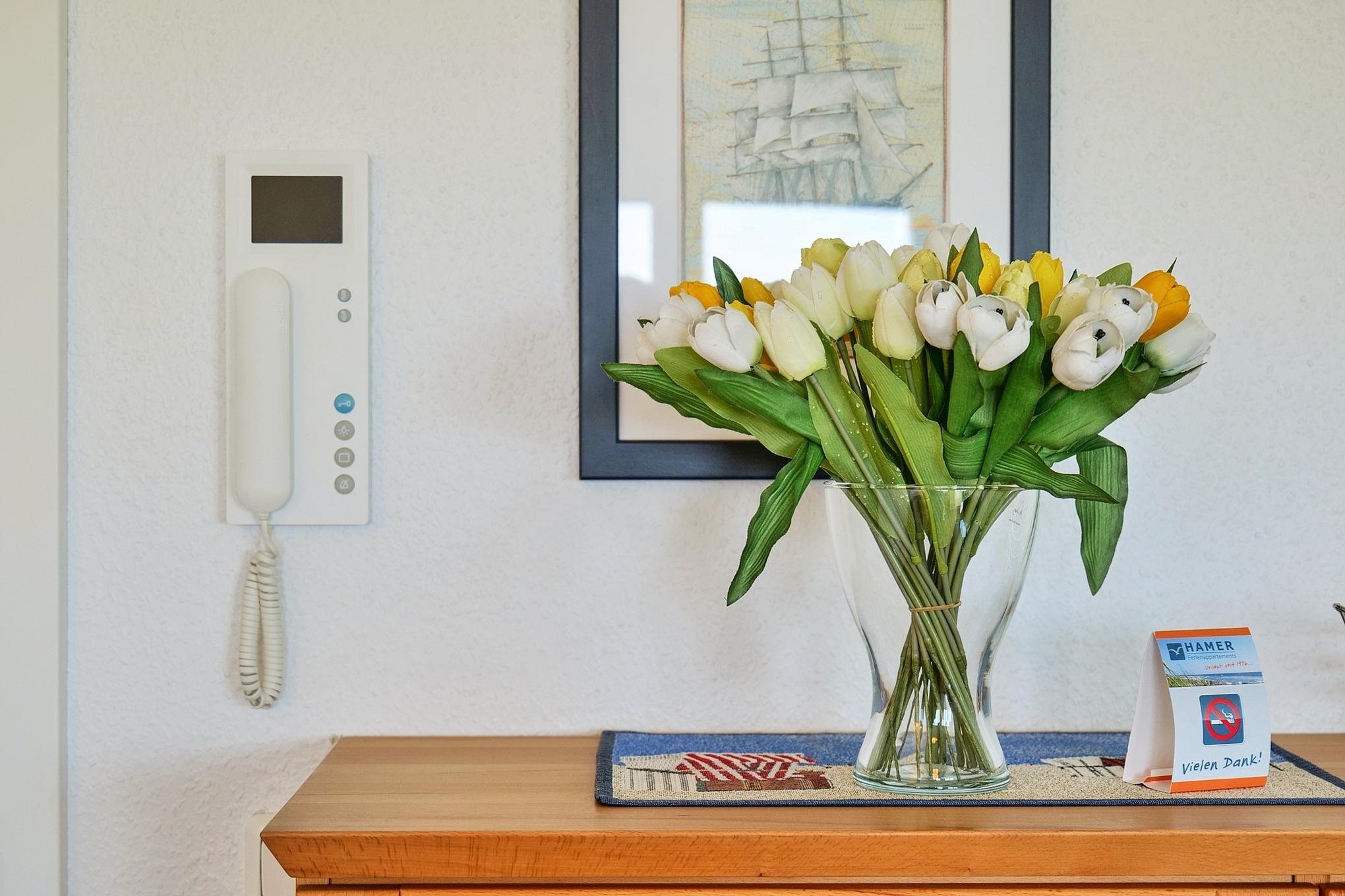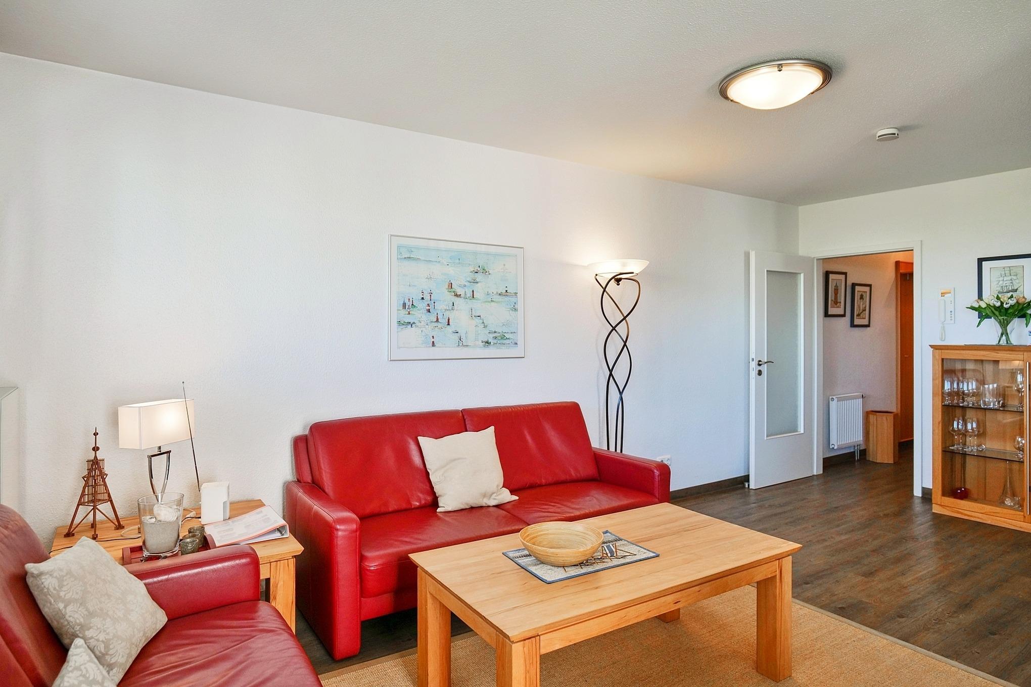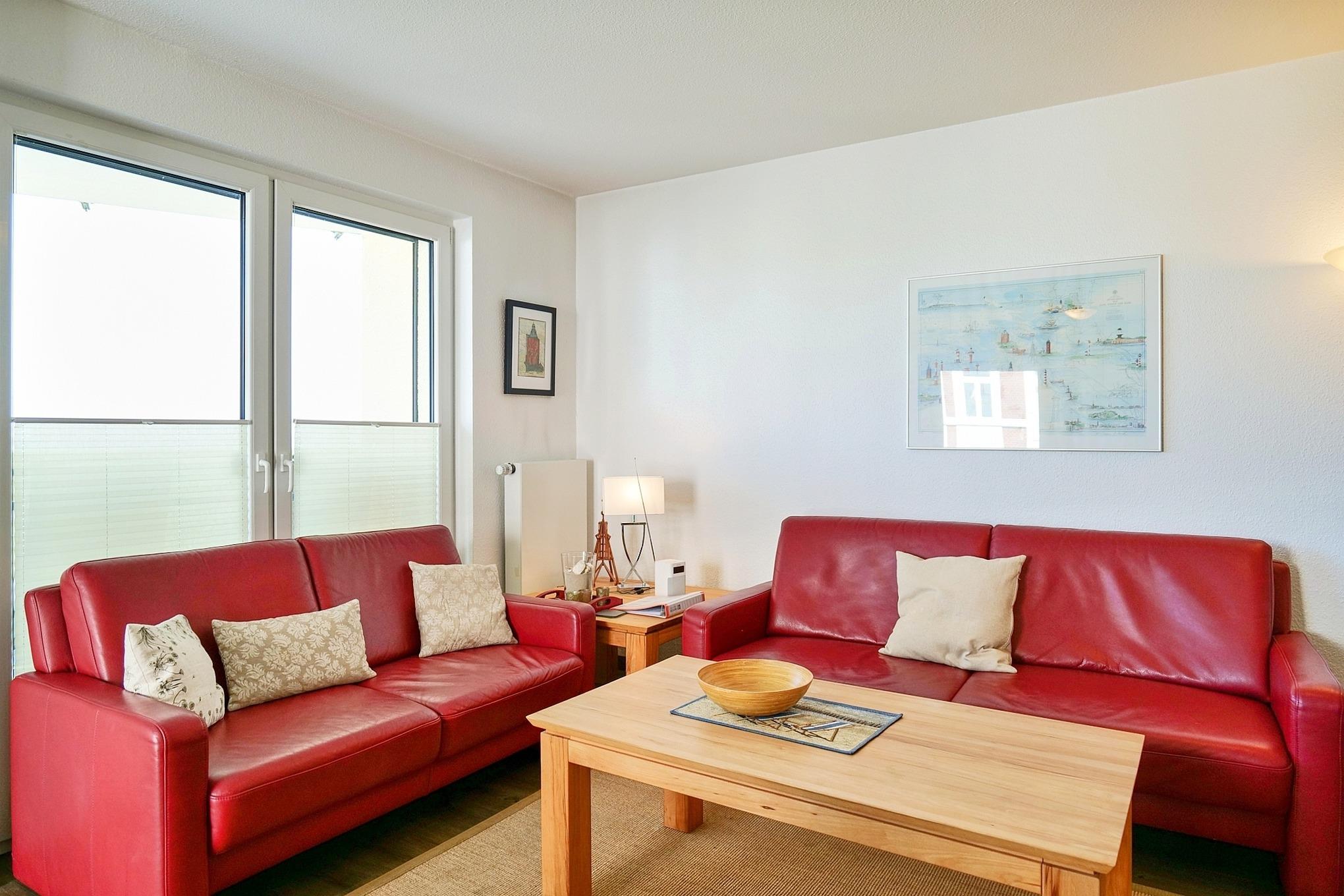 Luxuriöse 3-Zimmer-Wohnung (74m²), 2.Etage mit dem tollen Seeblick in die Grimmershörnbucht und den Weltschifffahrtsweg #1, 1 Schlafzimmer mit Doppelbett und TV, 1 Schlafzimmer mit Einzelbett, Du/Wc mit Föhn, Wohnzimmer mit vollausgestatteter Küchenzeile (Back., Mikrow., Geschirrspüler) Sat-TV mit Bluray-Player, kostenloses W-Lan, großer Balkon (nord), alle Zimmer mit Rollläden, Parkplatz #9, keine Haustiere erlaubt, Nichtraucher. Kostenloser Strandkorb #240 (01.05.-20.09.) inkl.