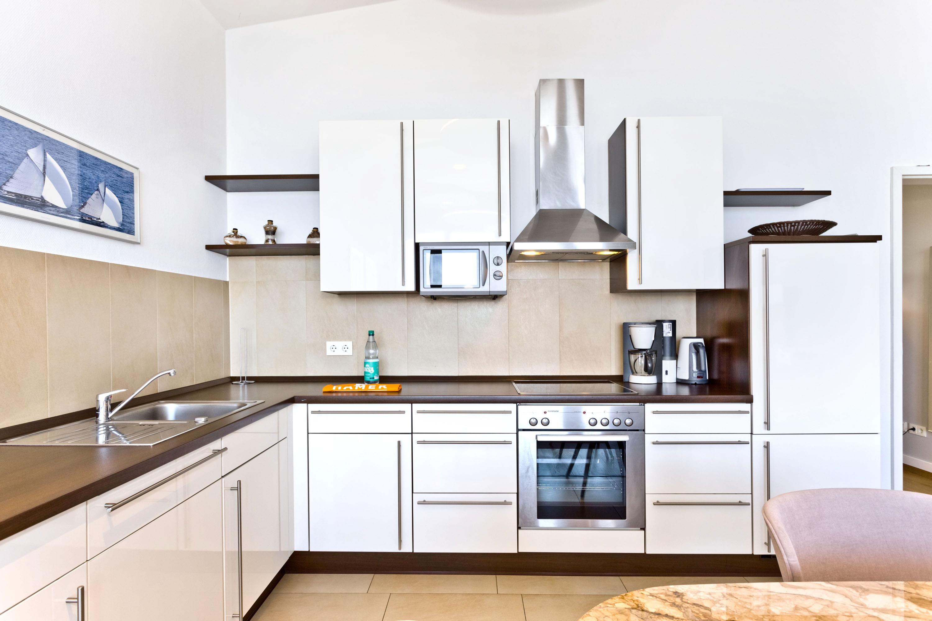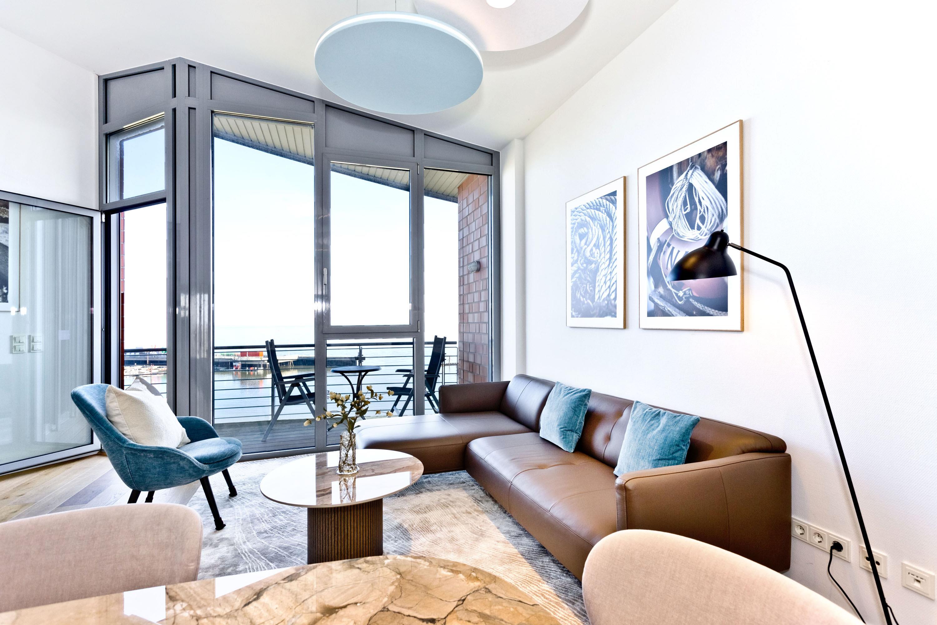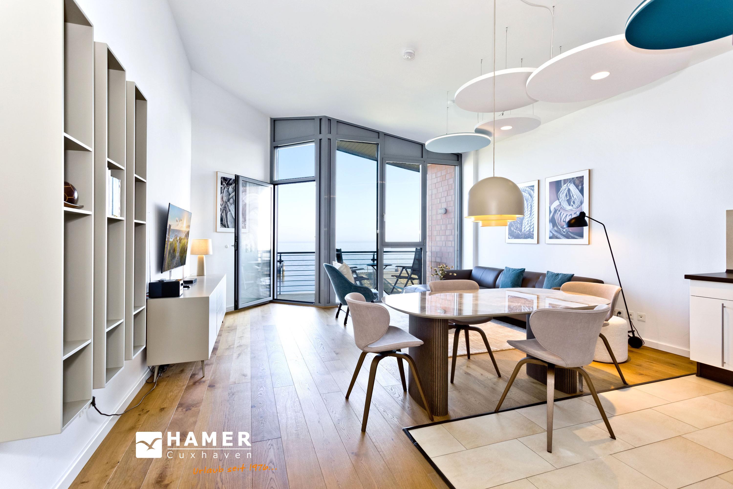 Die Penthousewohnung! 5.Etage mit dem absoluten Blick auf den Elbstrom (Die Webcam befindet sich an dieser Whg). Wohnzimmer mit Esstisch und geschmackvoller Sitzecke, TV, Stereoanlage, Balkon zur Seeseite, riesige Terrasse zur Südseite mit Blick auf den Hafen, vollständig ausgestattete Küchenzeile, Schlafzimmer mit Doppelbett (Boxspringbett), TV und elektr. Rollläden, Bad/Du/Wc mit Fön, die gesamte Wohnung ist hochwertig mit Parkett bzw. Fliesen ausgestattet, Fußbodenheizung, je ein reservierter Pkw-Stellplatz außen u. i. der Tiefgarage, keine Haustiere und natürlich Nichtraucher.